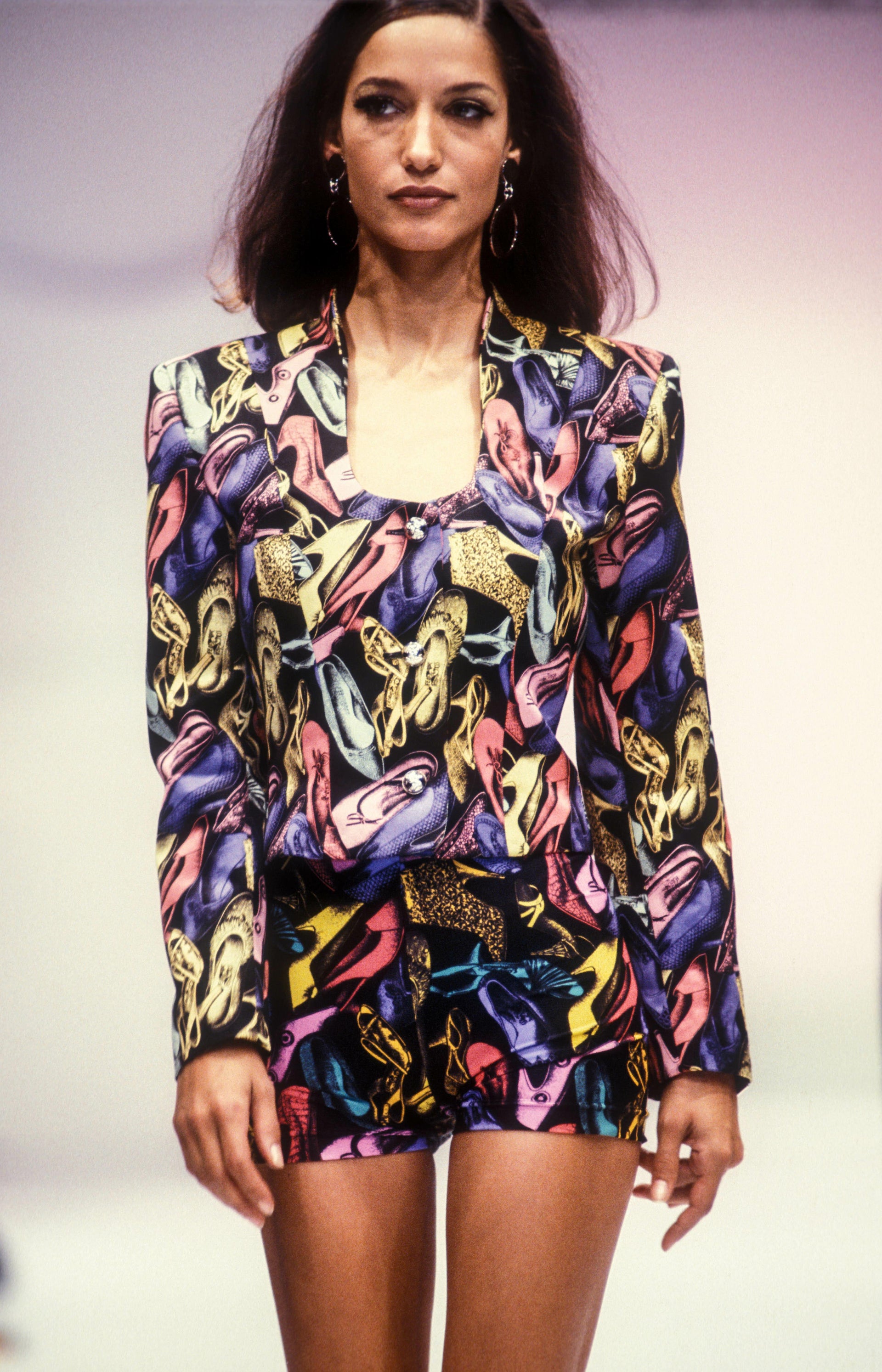 S/S 1991 Salvatore Ferragamo Shoe Print Black Multicolor Satin Blazer Jacket