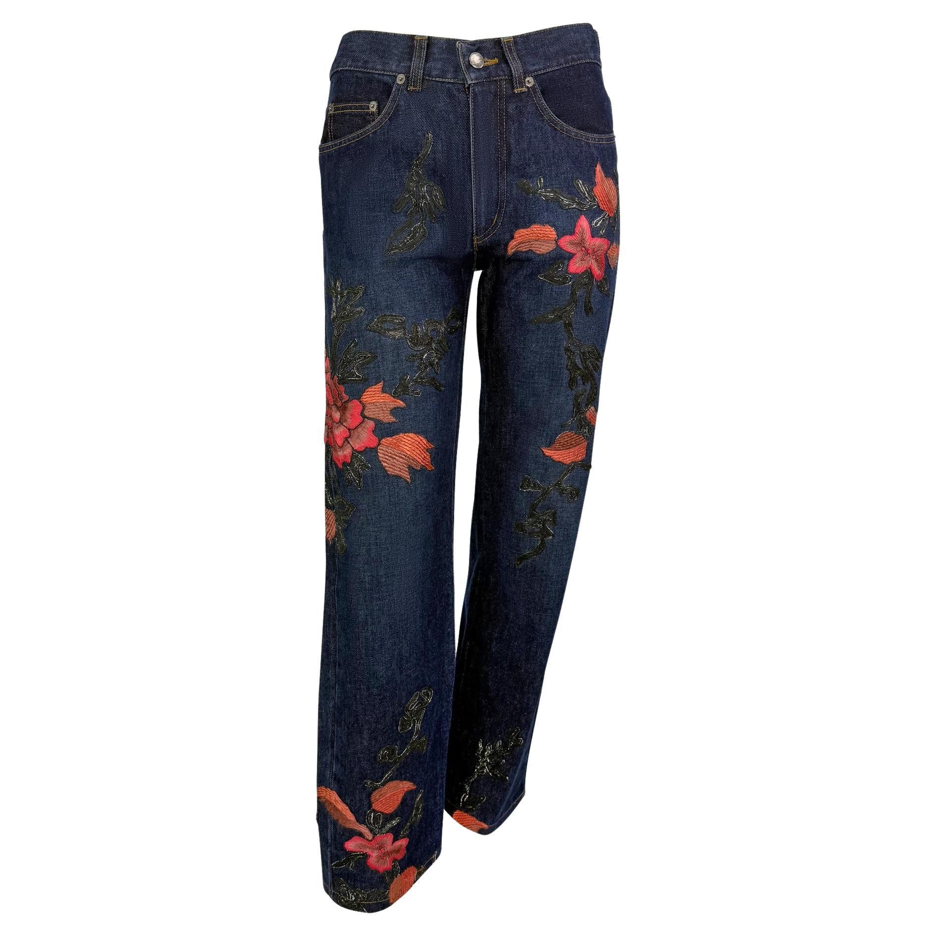 F/W 1999 Gucci by Tom Ford Pink Floral Embroidery Dark Wash Denim Jeans