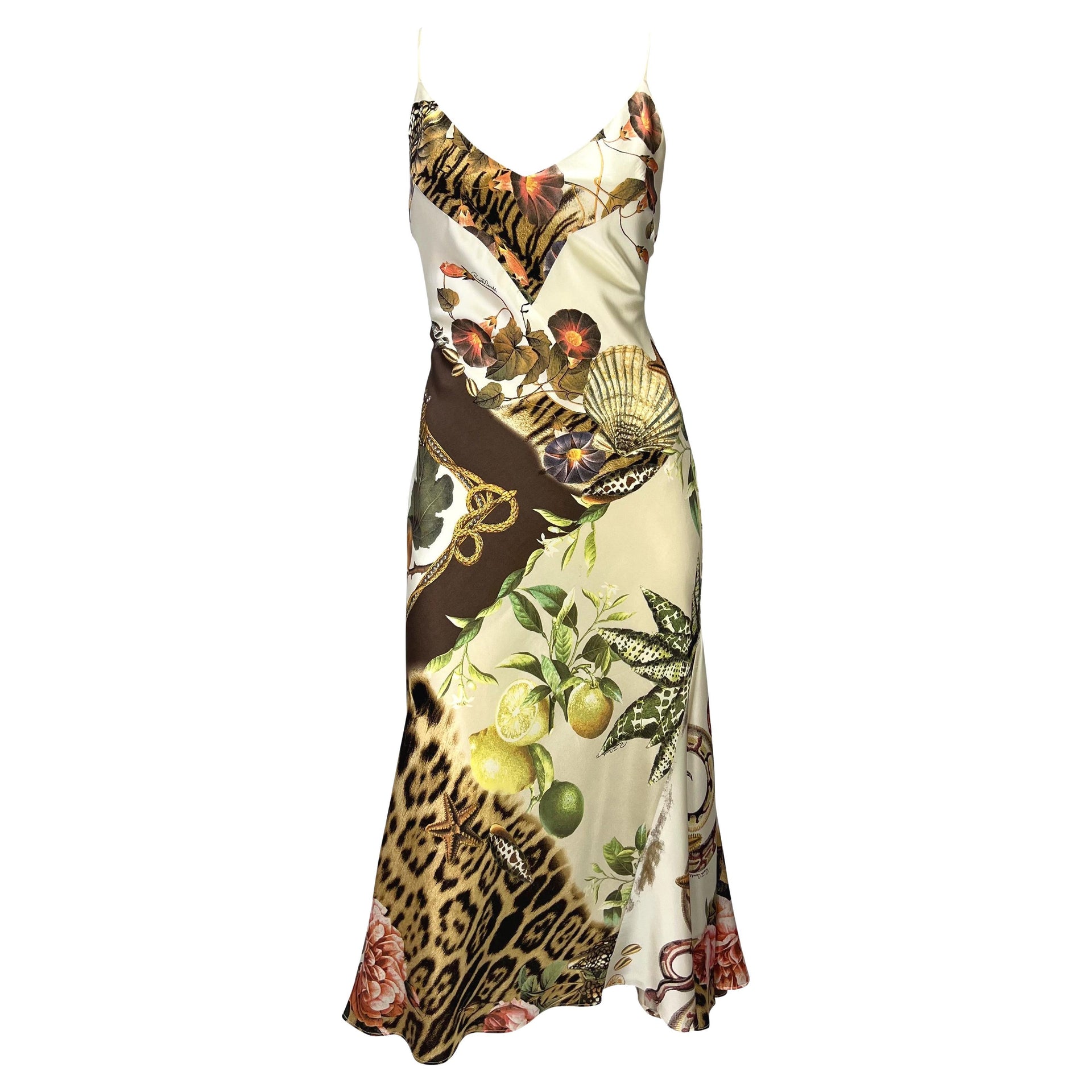 S/S 2005 Roberto Cavalli Silk Seashell Animal Print Cream Satin Slip Dress