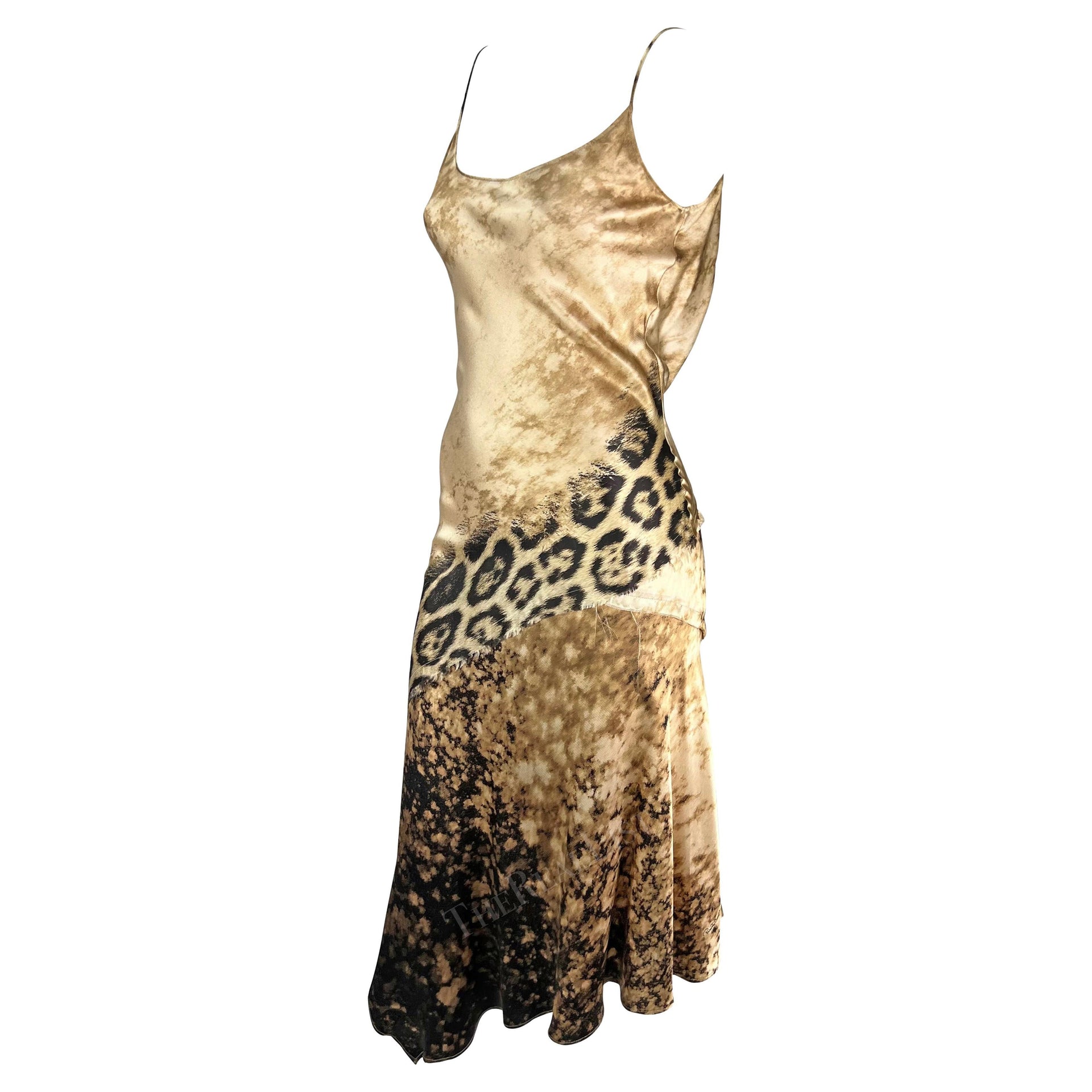 Early 2000s Roberto Cavalli Tan Cheetah Print Silk Slip Midi Dress