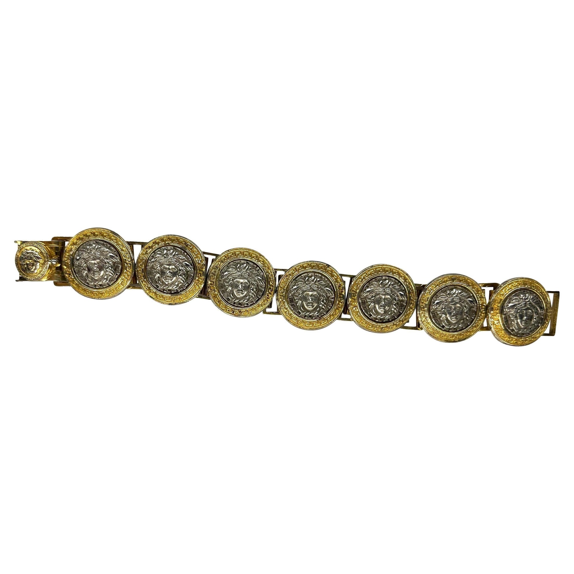 1990s Gianni Versace Silver Rhinestone Medusa Medallion Costume Link Bracelet