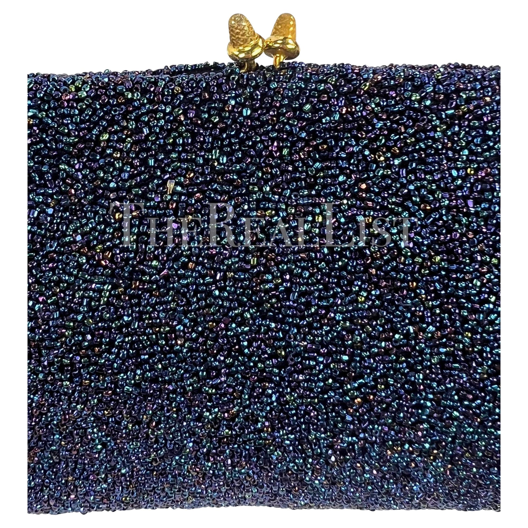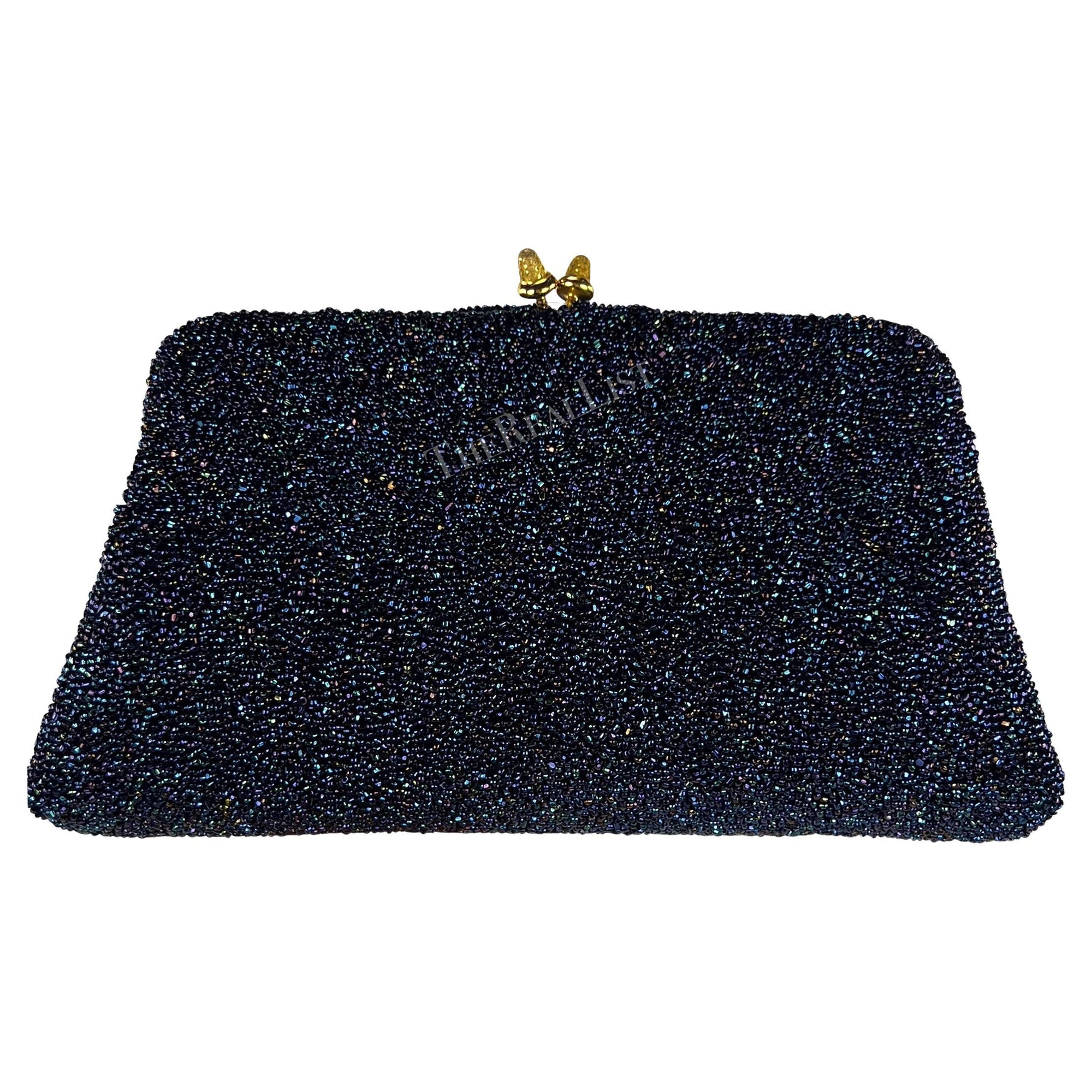 Presenting an incredible iridescent blue Gucci beaded clutch. Step back in time to the glamorous era of the 1970s with this stunning bag adorned in shimmering blue iridescent caviar beads. Its captivating design is tastefully complemented by the gold-tone acorn clam closure, exuding an air of sophistication. Perfect for a night out, this exquisite Gucci bag effortlessly adds a touch of timeless allure to any ensemble.