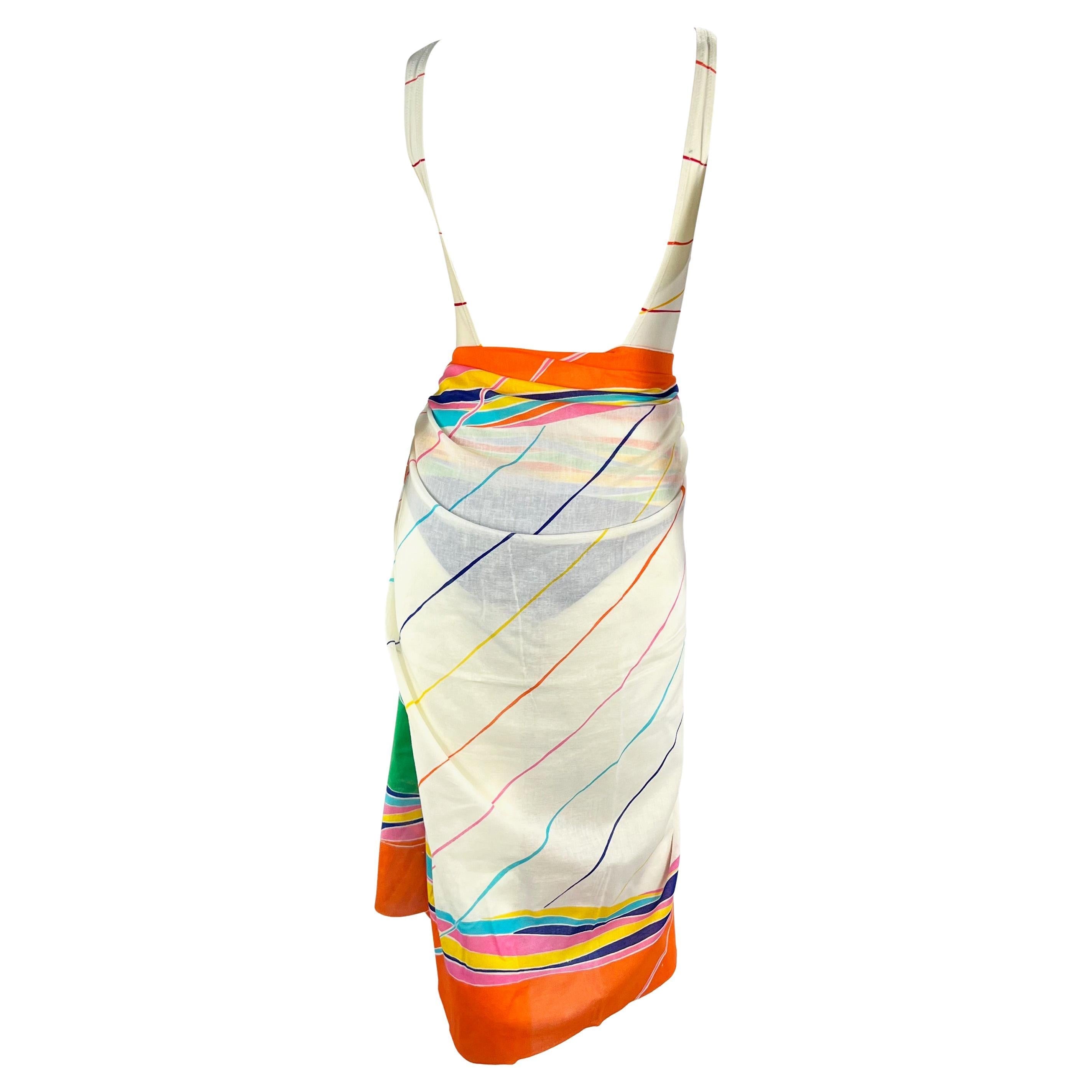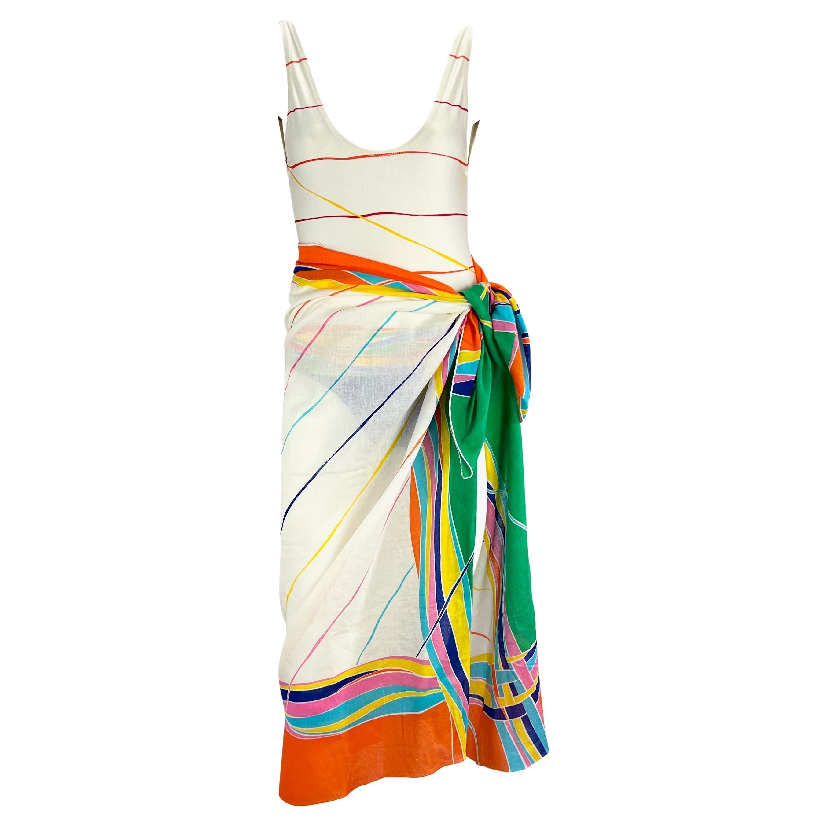 Presenting a gorgeous 1970s Gucci bathing suit with matching cover-up shawl. The one-piece bathing suit and pareo feature a colorful abstract print on off-white. In amazing condition, you would never guess this fabulous set is nearly 50 years old. Ultra-rare and complete with an open back, this incredible set is a must-have!