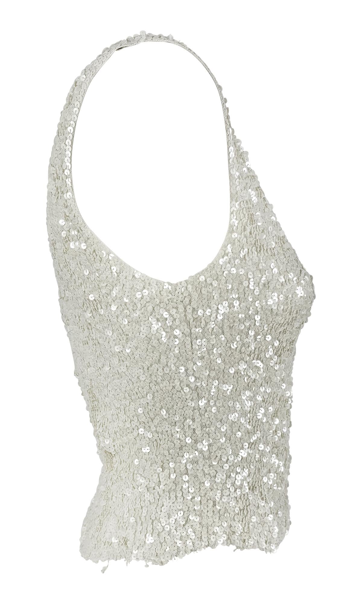 This 1980s Donna Karan white tank top is crafted from a semi-sheer stretch knit and features a low scoop neckline. Fully embellished with shimmering sequins throughout.