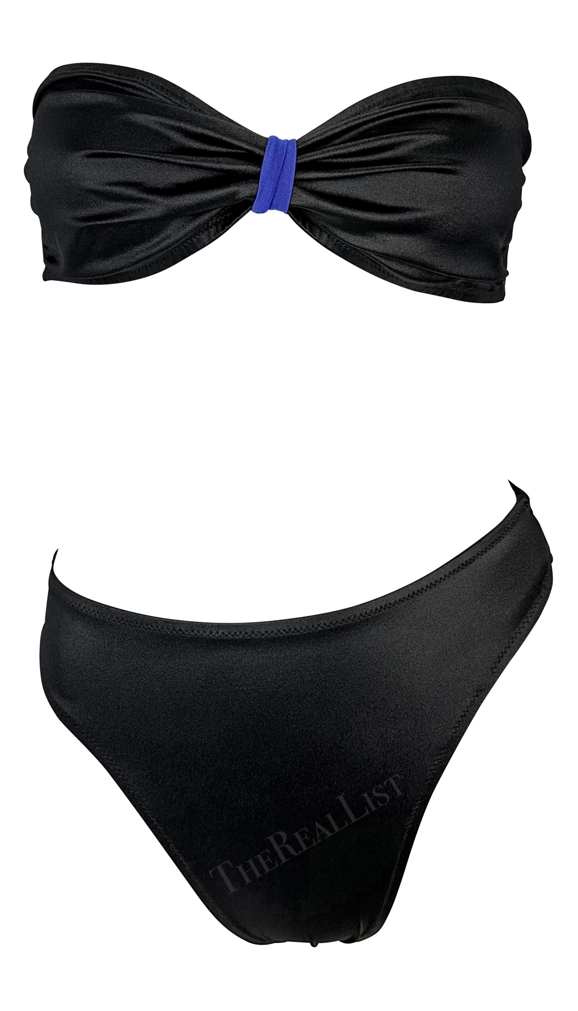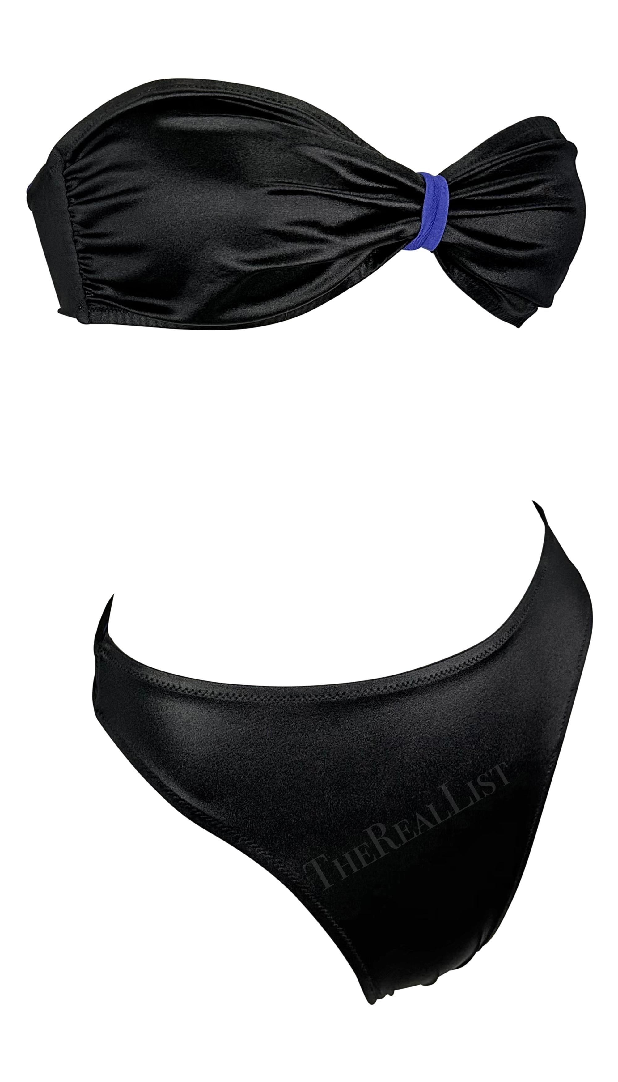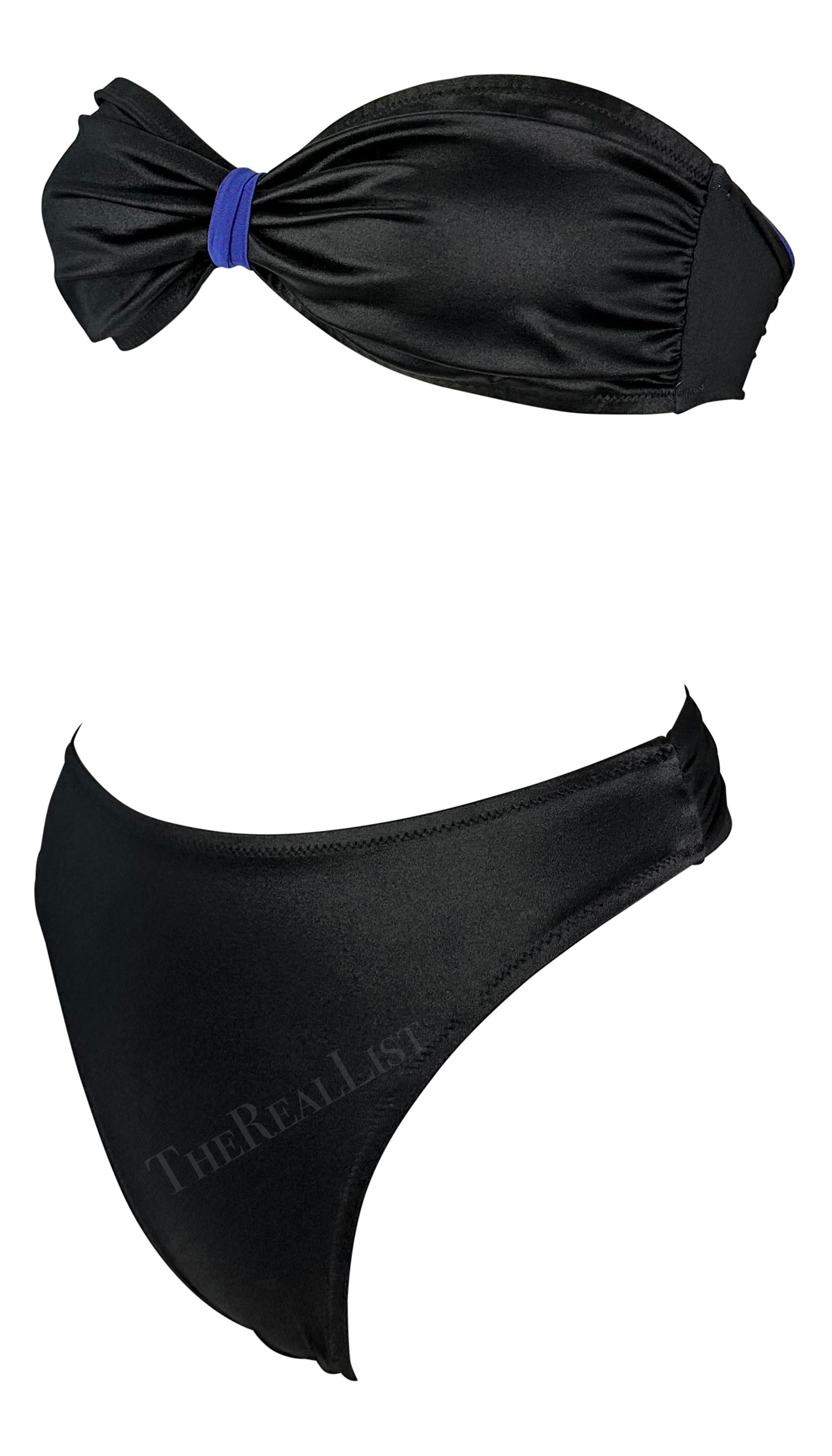 This chic black and blue strapless Gianni Versace bikini, designed by Gianni Versace in the 1980s, features a bold two-tone color block design. The top is accented with a blue ring at the bust that creates ruching and a sweetheart neckline, tying at the back for a secure fit. The high-waisted bottoms are finished with a matching purple bow detail just above the back waistline.
