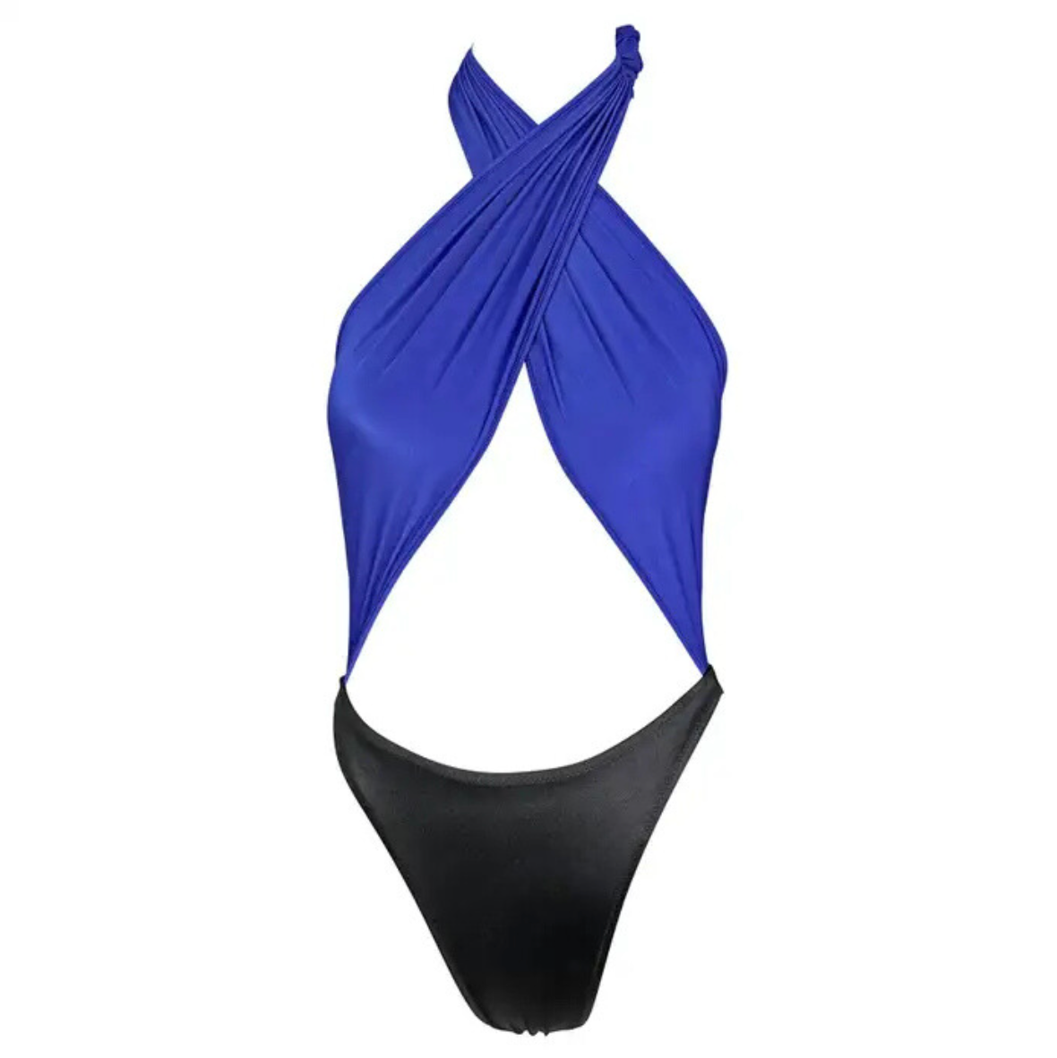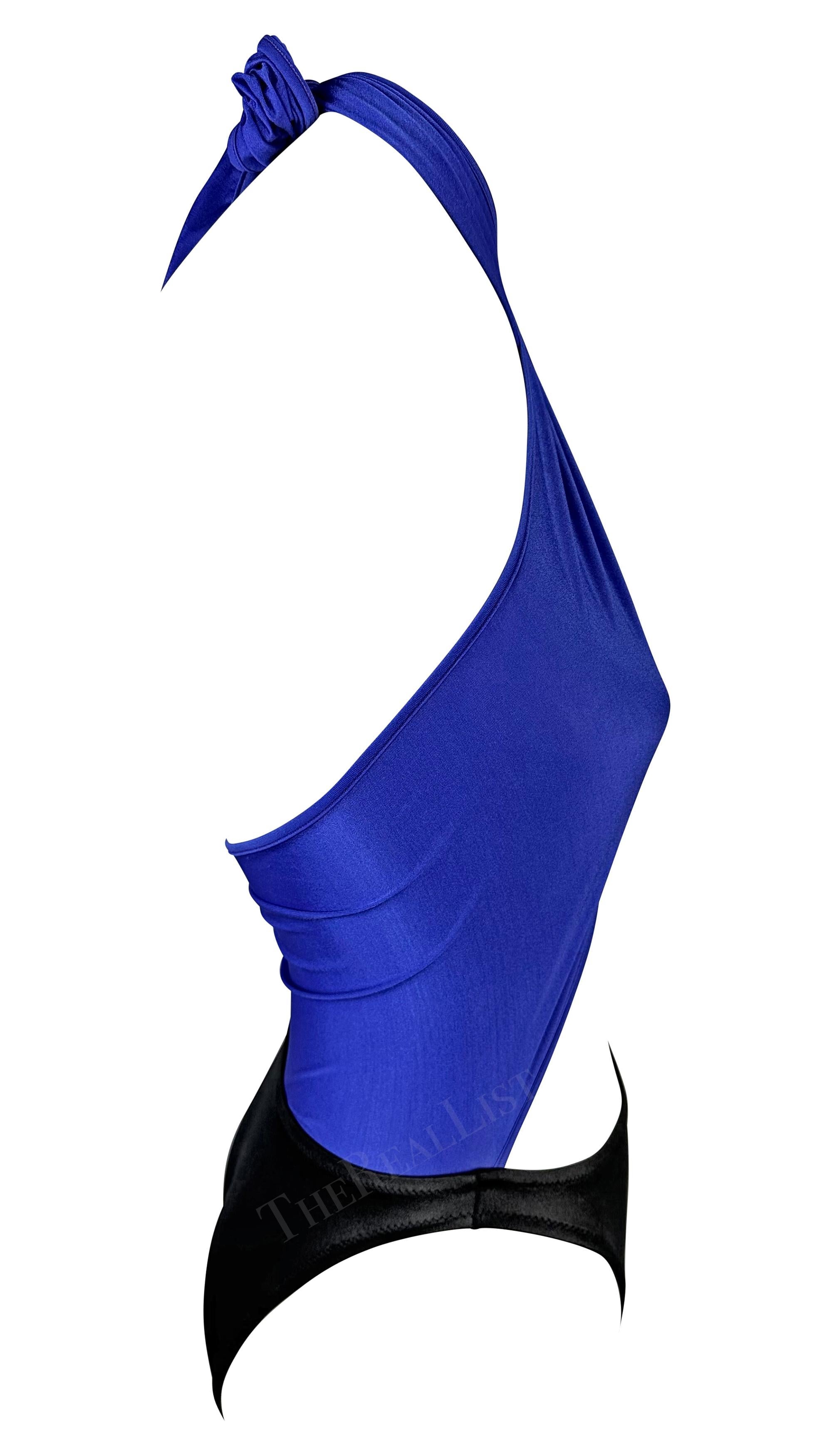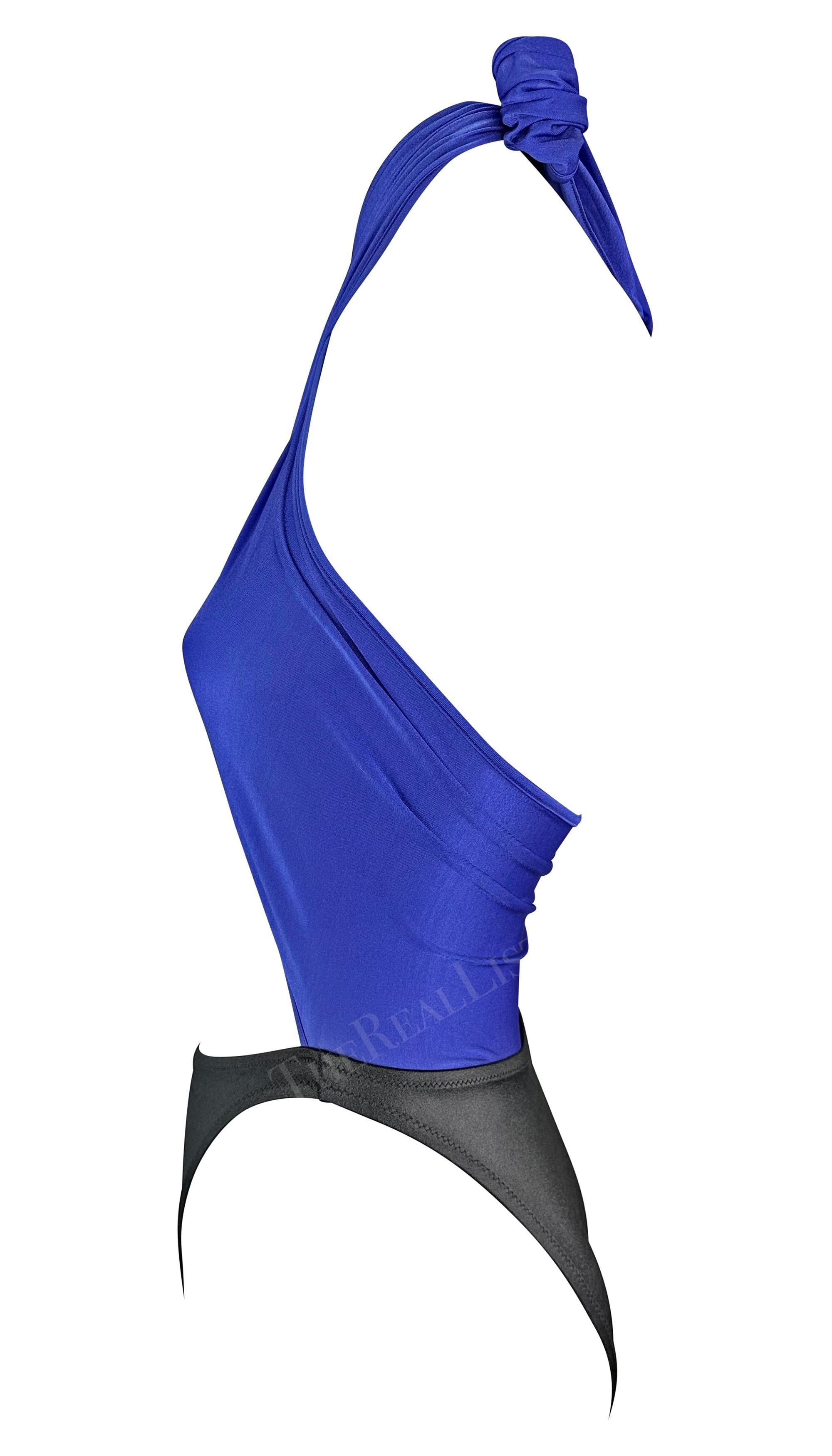 1980s Gianni Versace Plunging Wrap Blue Black One-Piece Bikini Swimsuit