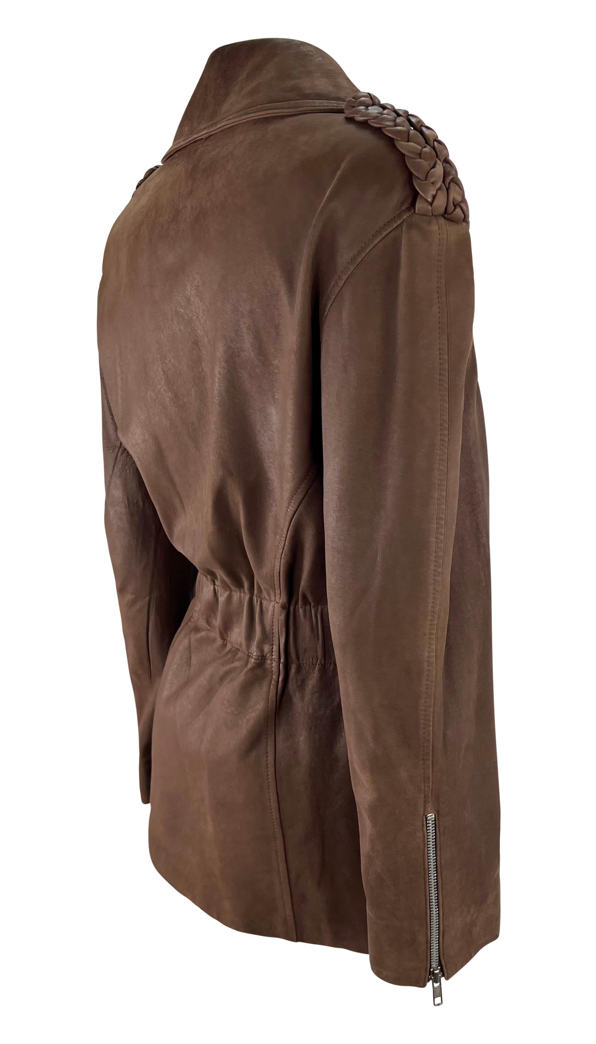 This striking brown leather moto jacket by Thierry Mugler was designed by Manfred Mugler in the late 1980s. Crafted from soft leather, this chic coat features a fold-over collar, braided epaulettes, and an asymmetric zipper for added style. The design includes pockets at the hips and bust that match the zipper closure, as well as an elasticized band at the back. True to Mugler's signature style, this jacket accentuates the female form, making it a standout piece in any wardrobe.