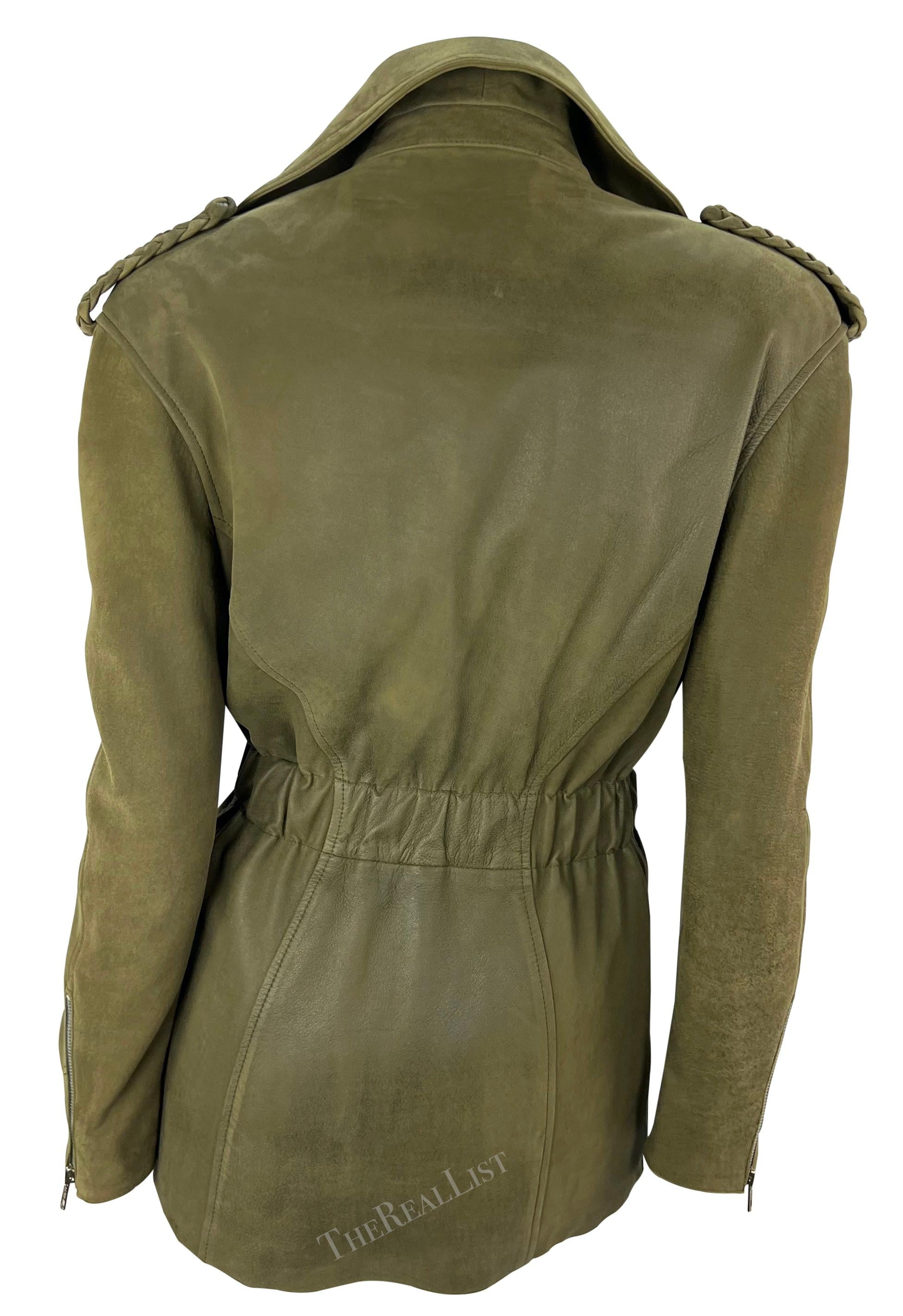 This striking olive green suede Thierry Mugler moto jacket was designed by Manfred Mugler in the the late 1980s. Crafted entirely from soft suede, this chic coat boasts a fold-over collar, braided epaulettes, and an asymmetric zipper for added style. Complete with pockets at the hips and bust matching the zipper closure, as well as an elasticized band at the back. True to Mugler's signature style, the design accentuates the beauty of the female form, making it a standout piece in any wardrobe.