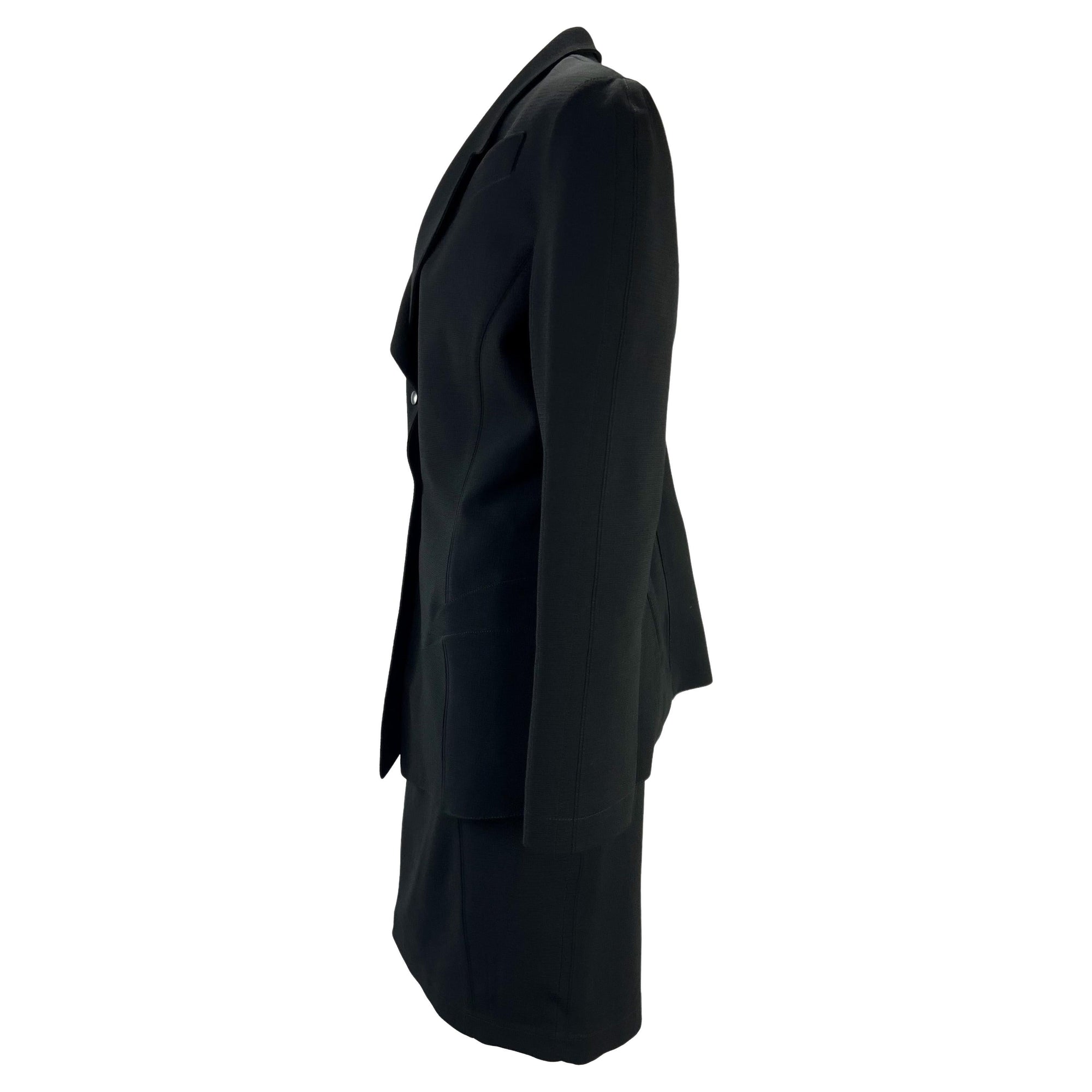 Presenting a sculptural black Thierry Mugler skirt suit designed by Manfred Mugler. From the 1980s, this suit features masterful design and tailoring. The blazer features sculptural curved faux pockets which extenuate the hips. The skirt and blazer are constructed of worsted wool and perfectly represent Mugler's iconic exaggerated silhouettes.