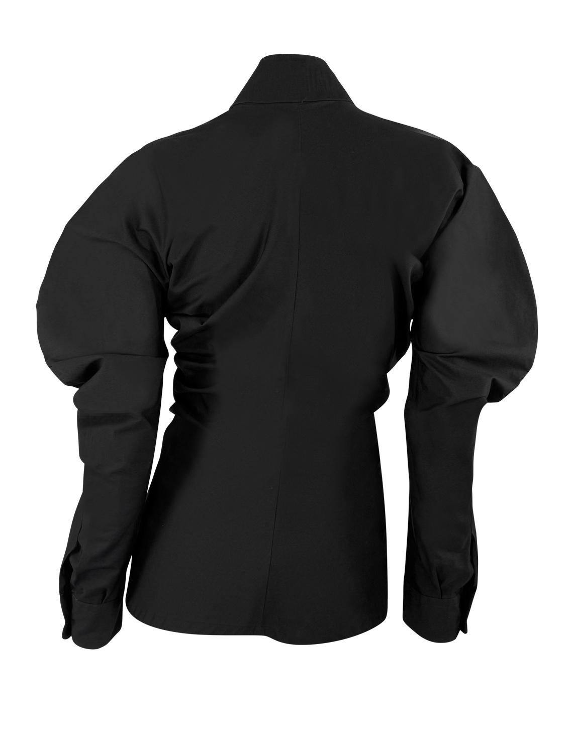 From the 1990s, this Alexander McQueen black blouse is crafted from structured cotton and features exaggerated rounded shoulders, a tailored waist, and a sculptural, button-up front. The high standing collar and precise gathering at the bust and waist emphasize McQueen's signature play with proportion and dramatic silhouette. Made in Italy