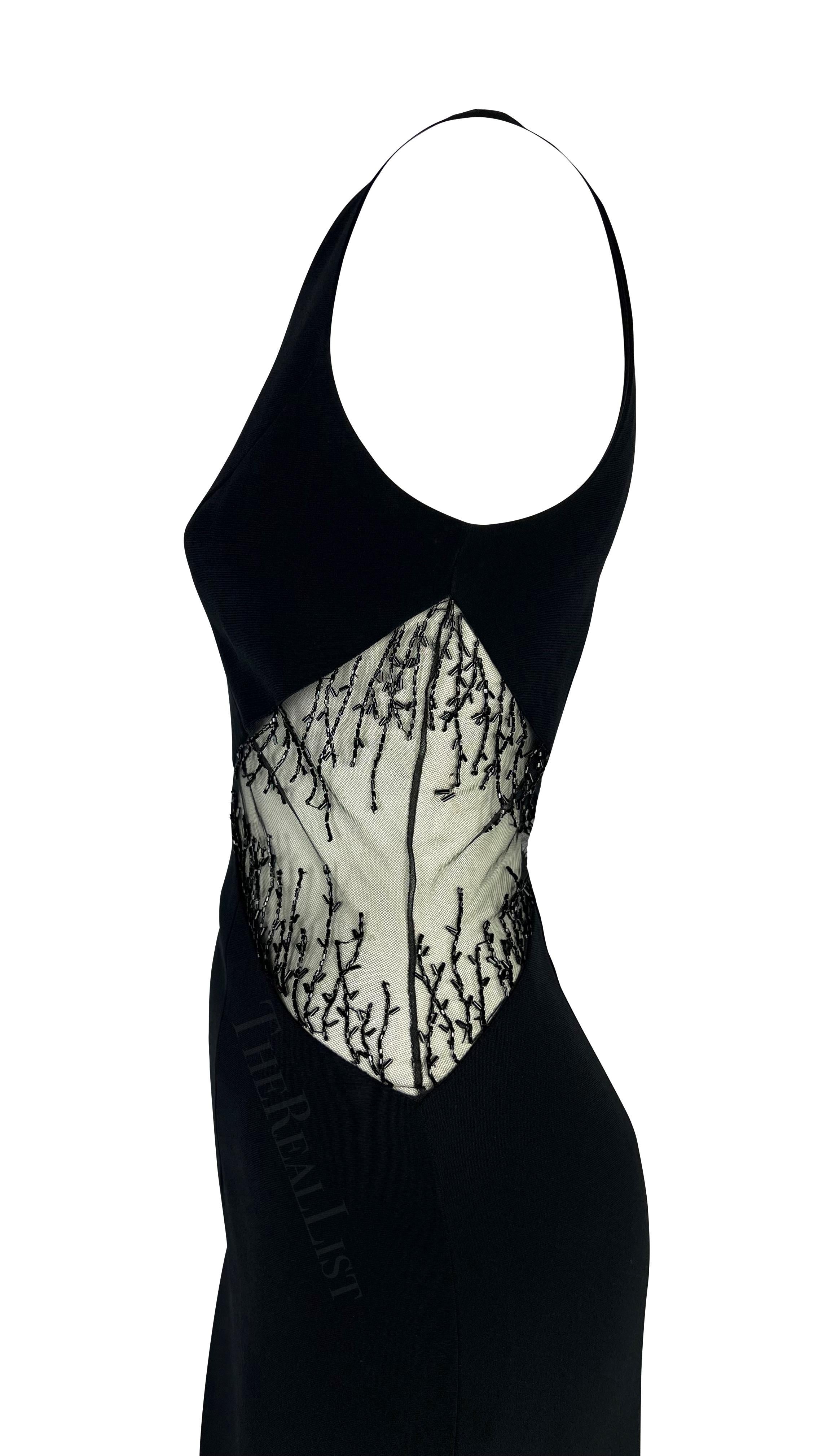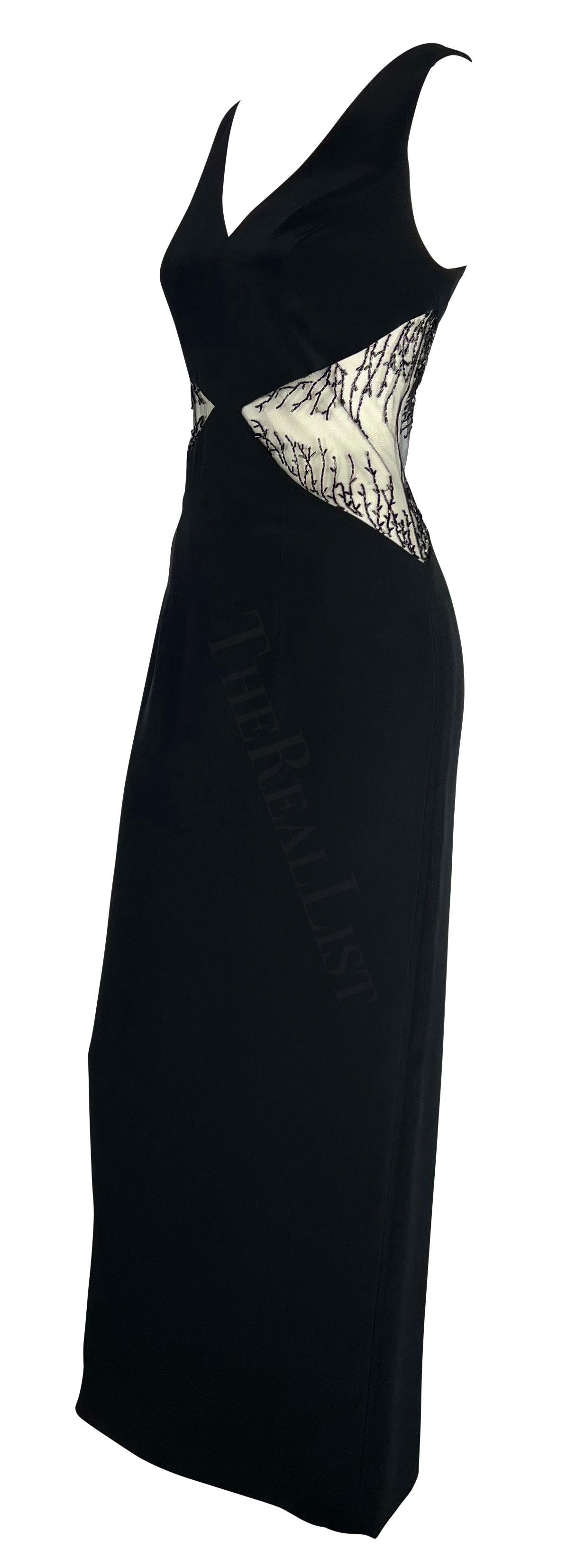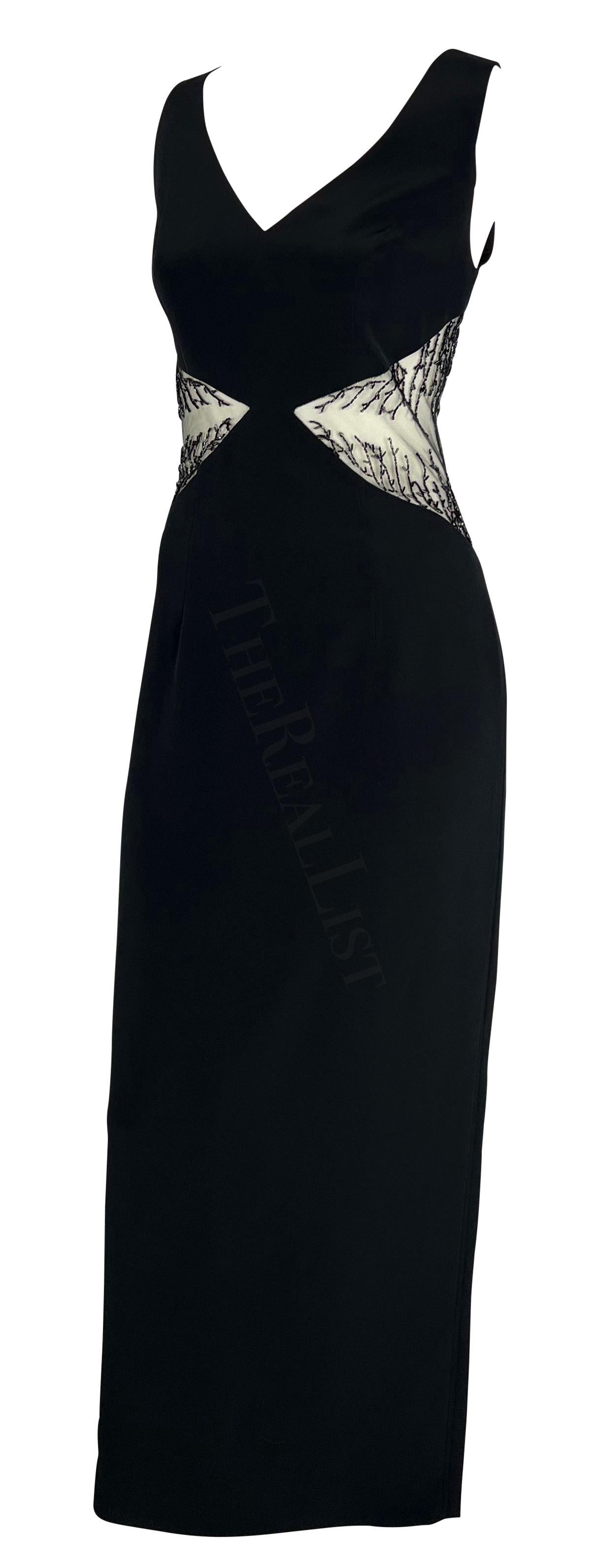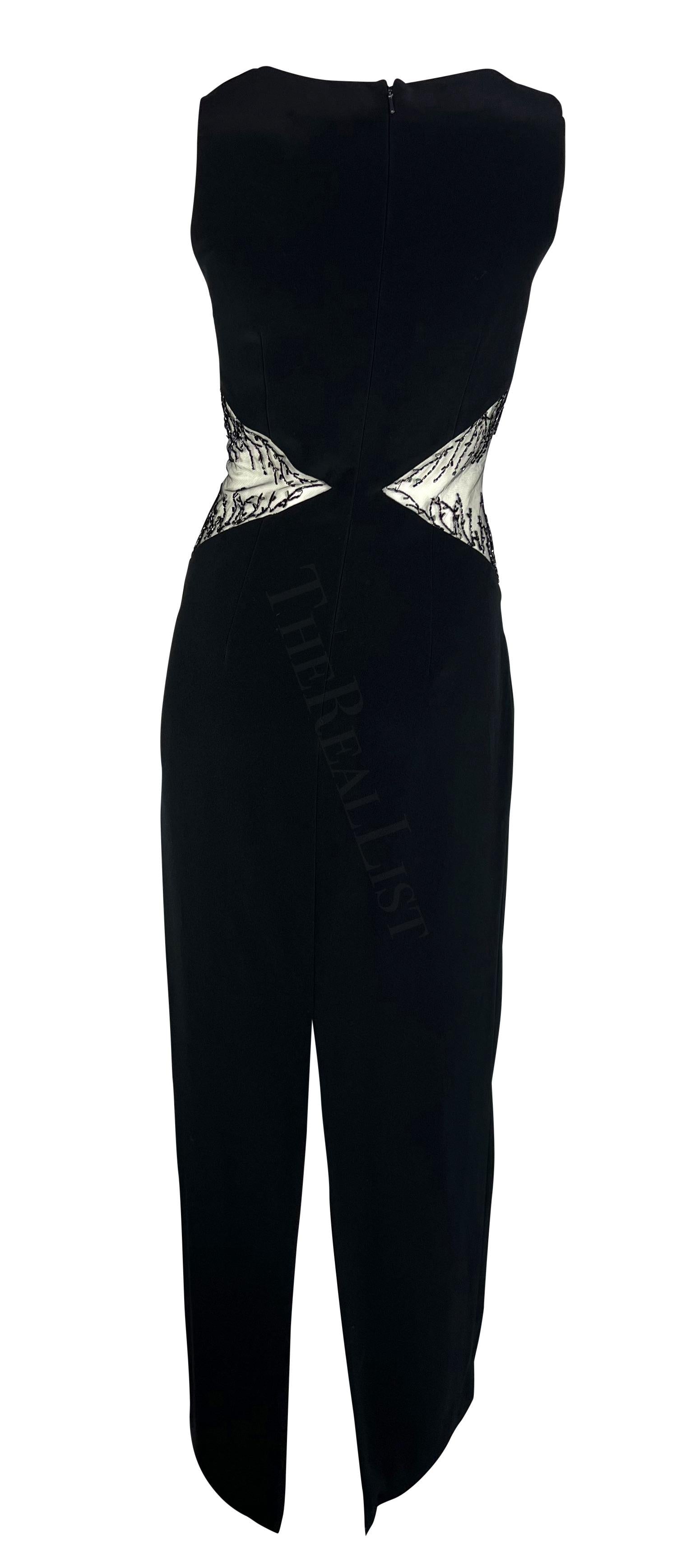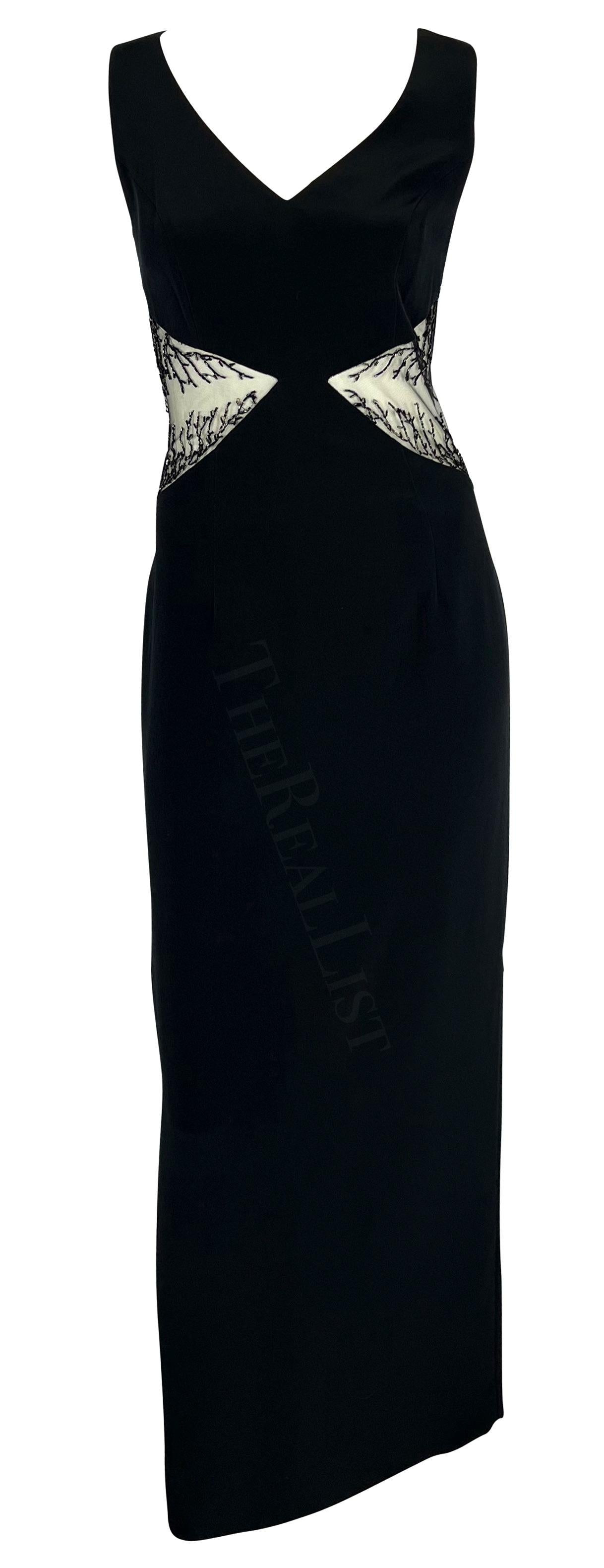 Presenting a chic black beaded Bob Mackie sleeveless gown. From the 1990s, this sexy floor-length dress features a v-neckline, column cut, and is made complete with sheer-covered cut-outs on either side of the waist. The cutouts are adorned with beautiful beadwork that gives this vintage dress the perfect sparkly Bob Mackie touch.