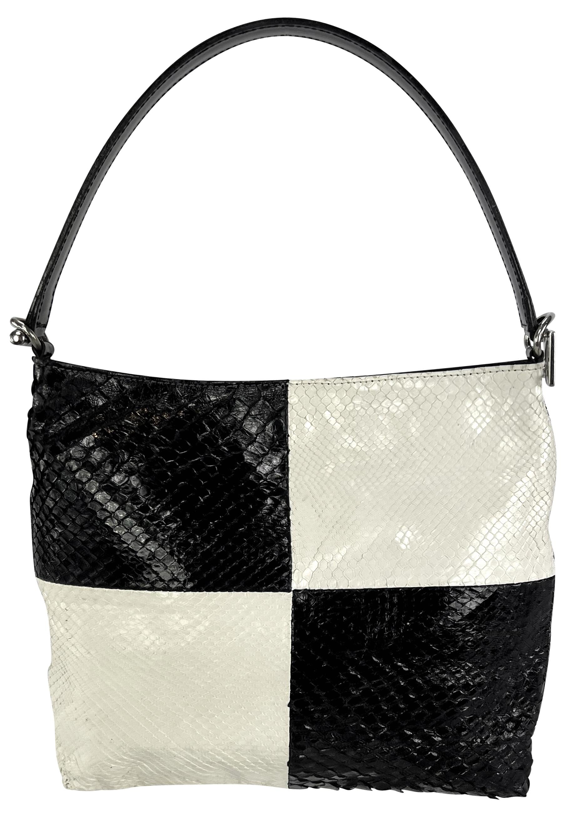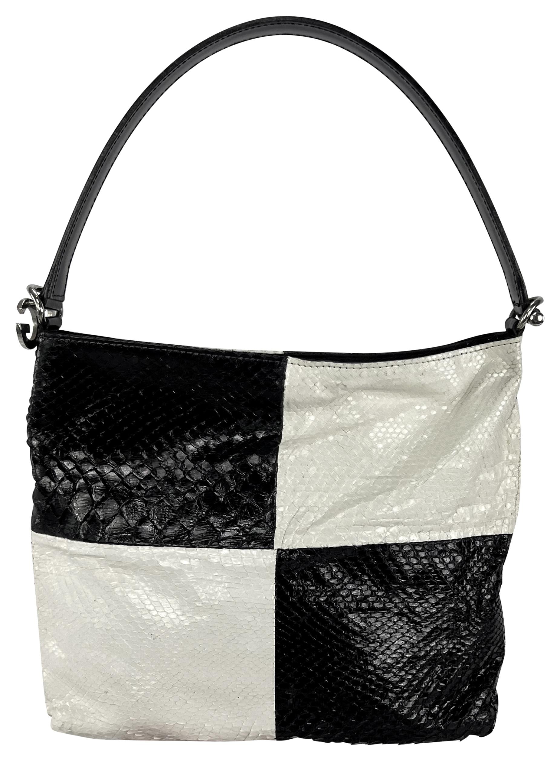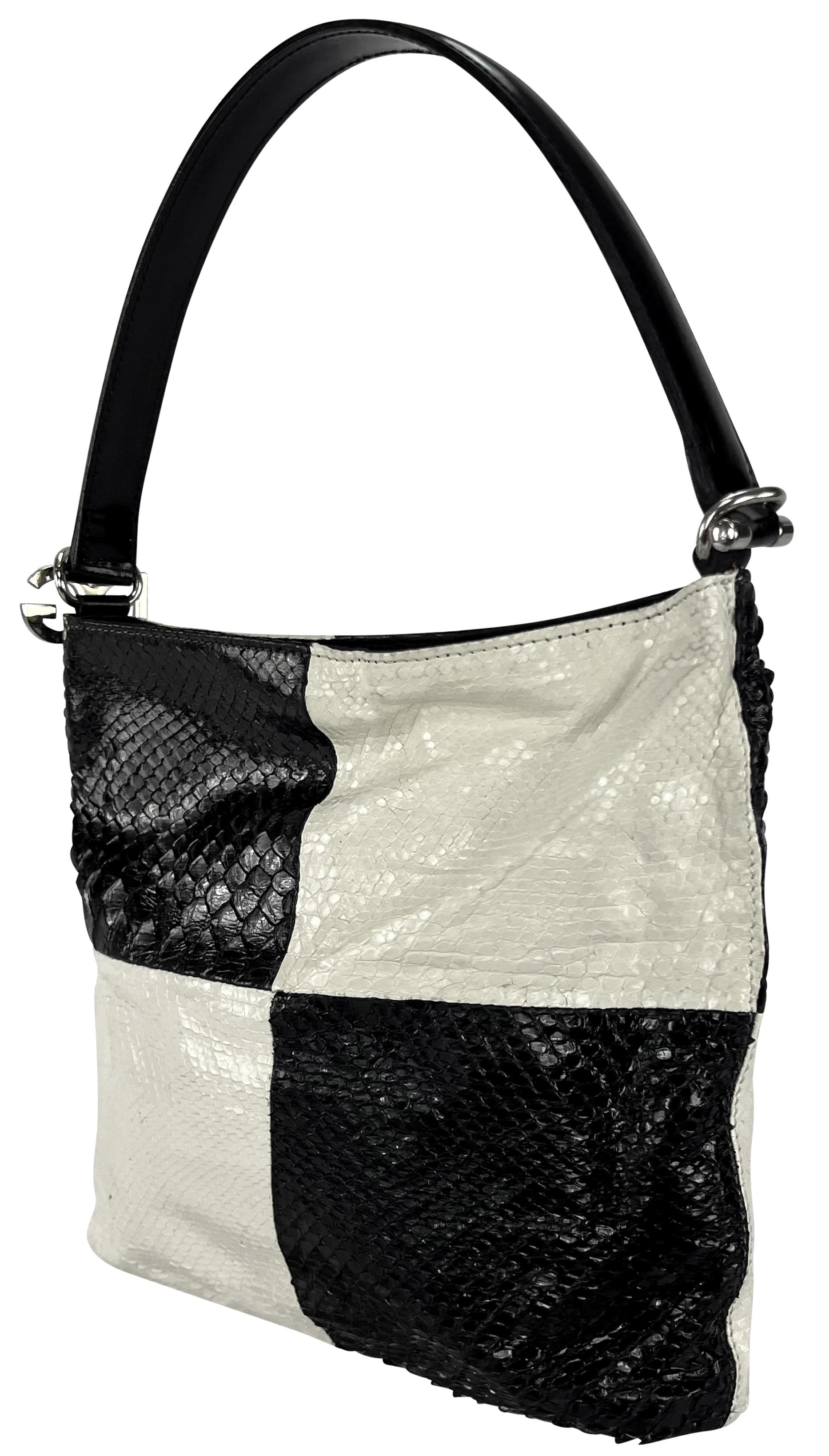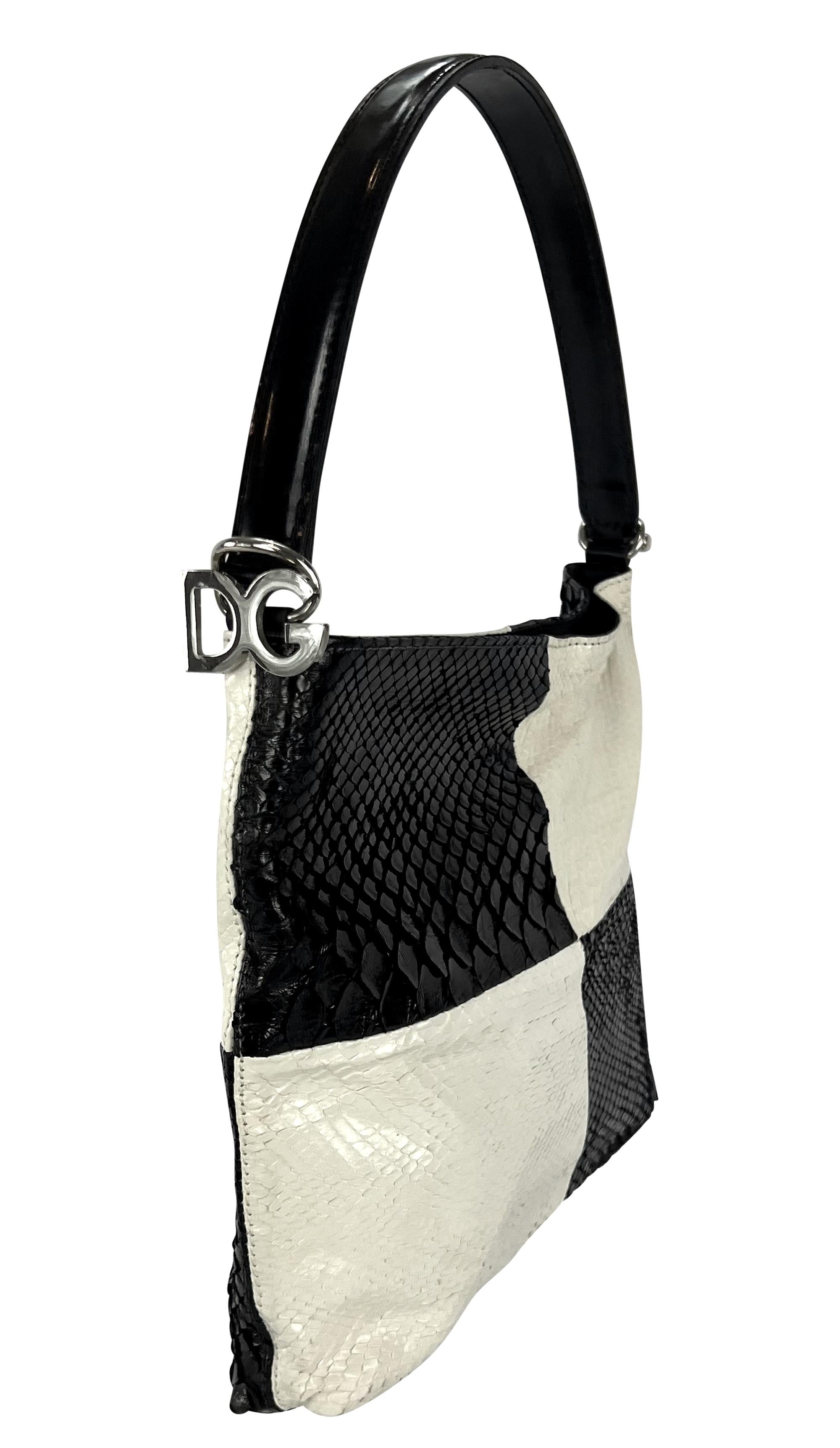 From the 1990s, this chic Dolce & Gabbana bag features a black-and-white check pattern and is crafted from genuine python skin. The sleek shoulder bag includes a leather strap, a magnetic closure, and is adorned with silver-tone 'DG' logo hardware.