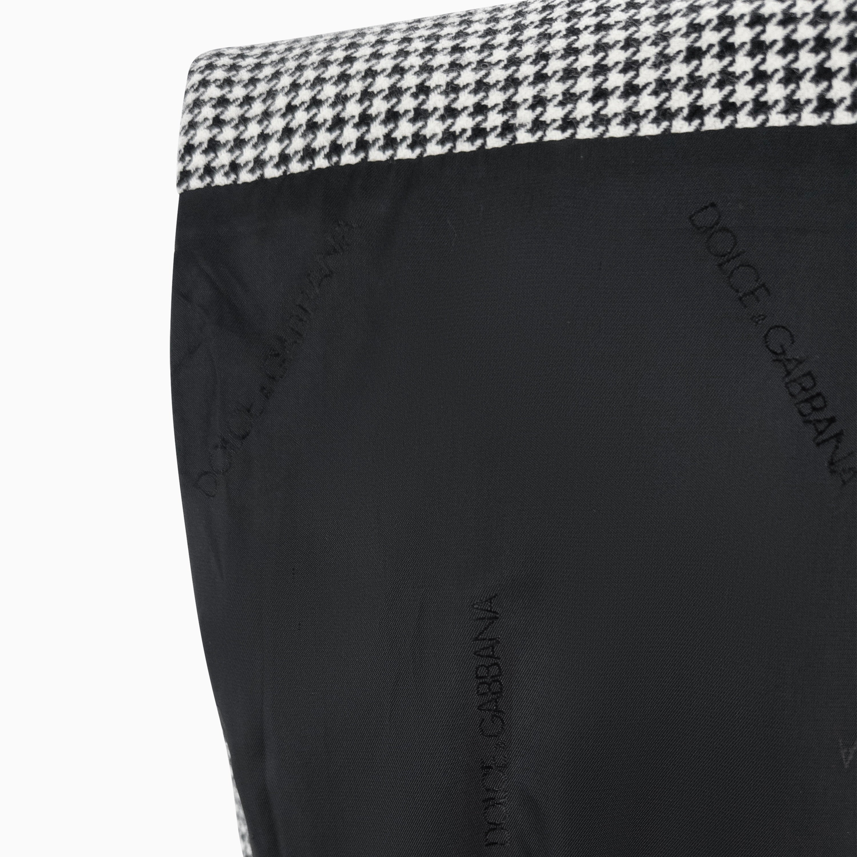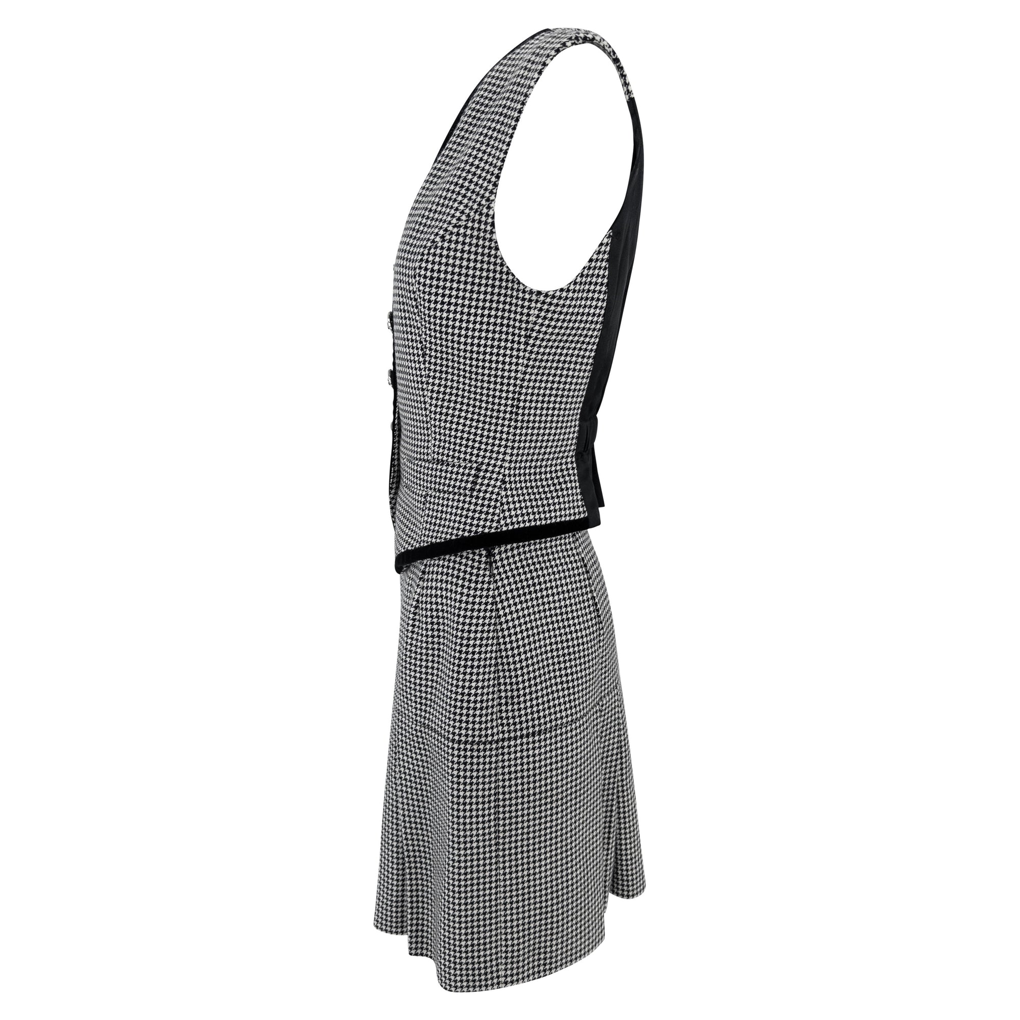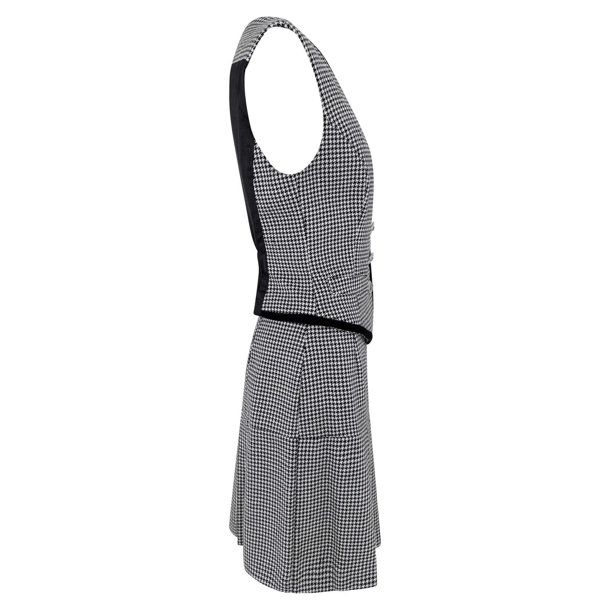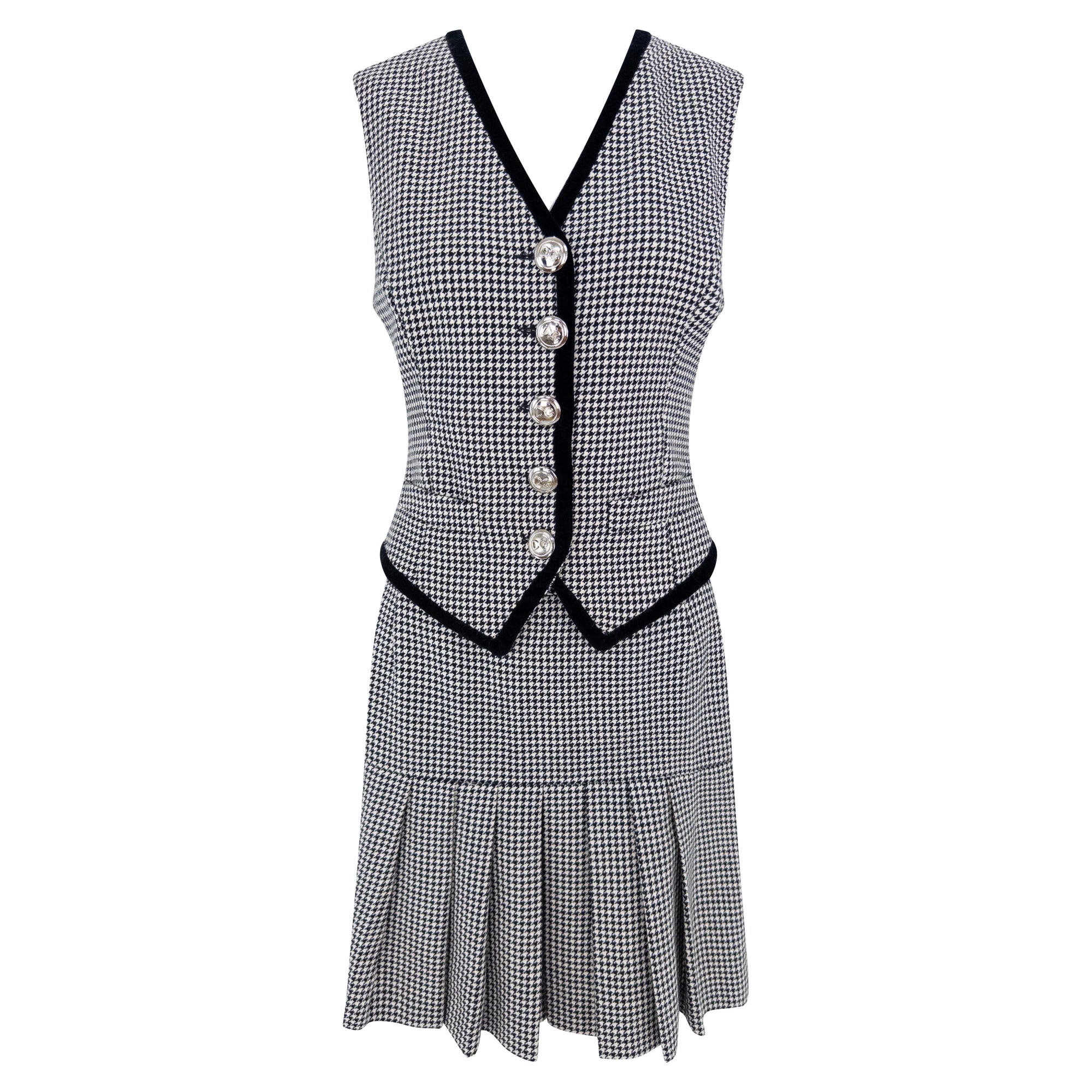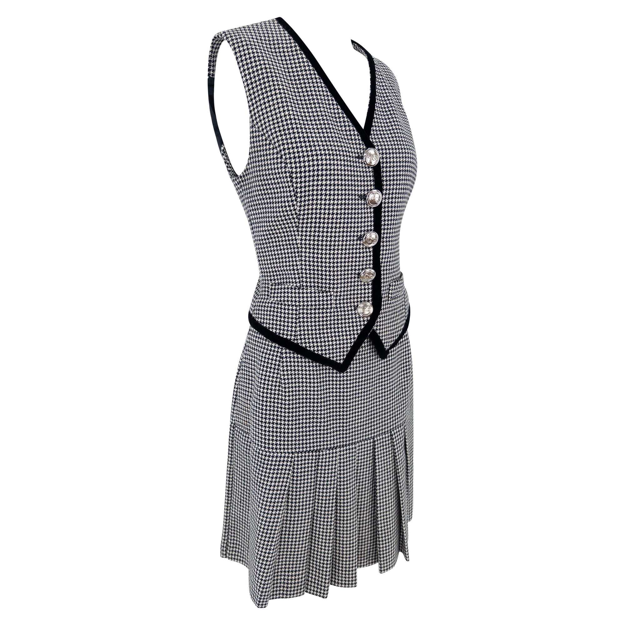 This 1990s Dolce & Gabbana set features a tailored vest and matching pleated skirt, crafted in a classic black and white houndstooth pattern. The vest is detailed with black velvet trim, silver-tone buttons, and an angular cut that accentuates the waist. The back is partially lined in black with an elasticized cinch for added shape. The coordinating skirt falls into sharp pleats, offering movement and structure.