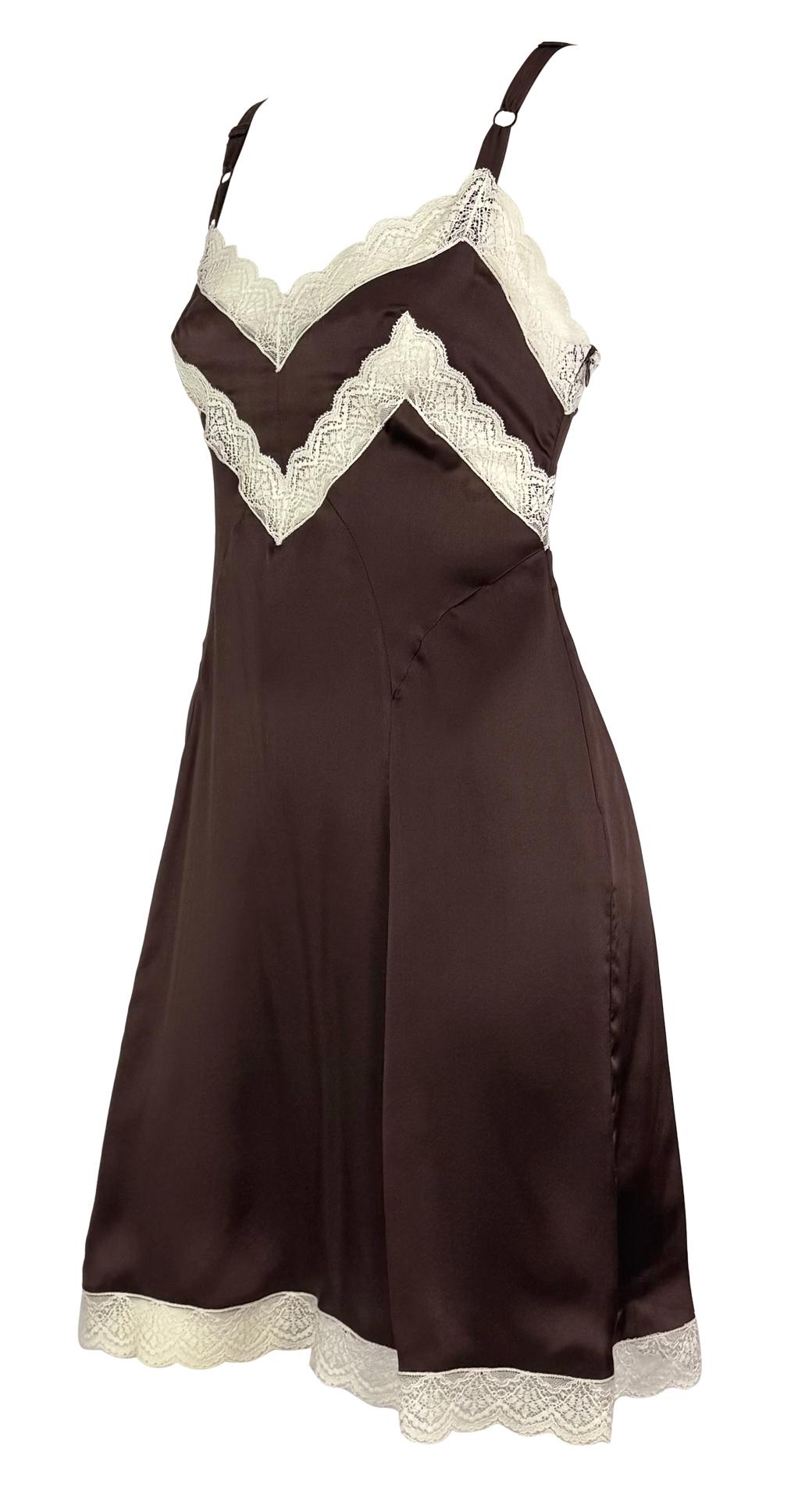 This 1990s Dolce & Gabbana mini slip dress is crafted from brown silk satin with delicate white lace trim. The lingerie-inspired design features adjustable straps, a soft bustline, and a flared hem, showcasing the brand's signature sensual and feminine aesthetic.
