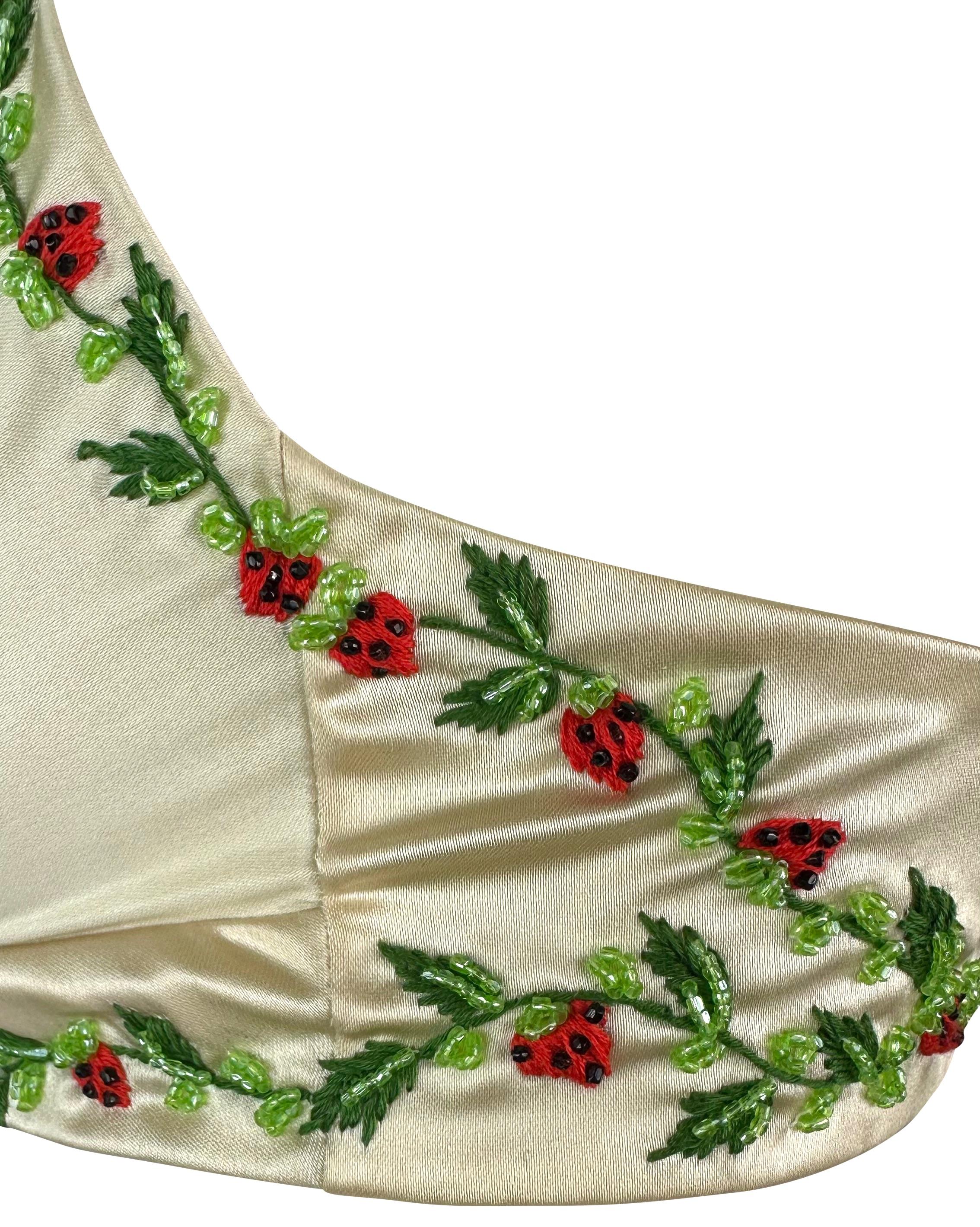 1990s Dolce & Gabbana Creme Satin Strawberry Embroidery Beaded Bralette Crop Top