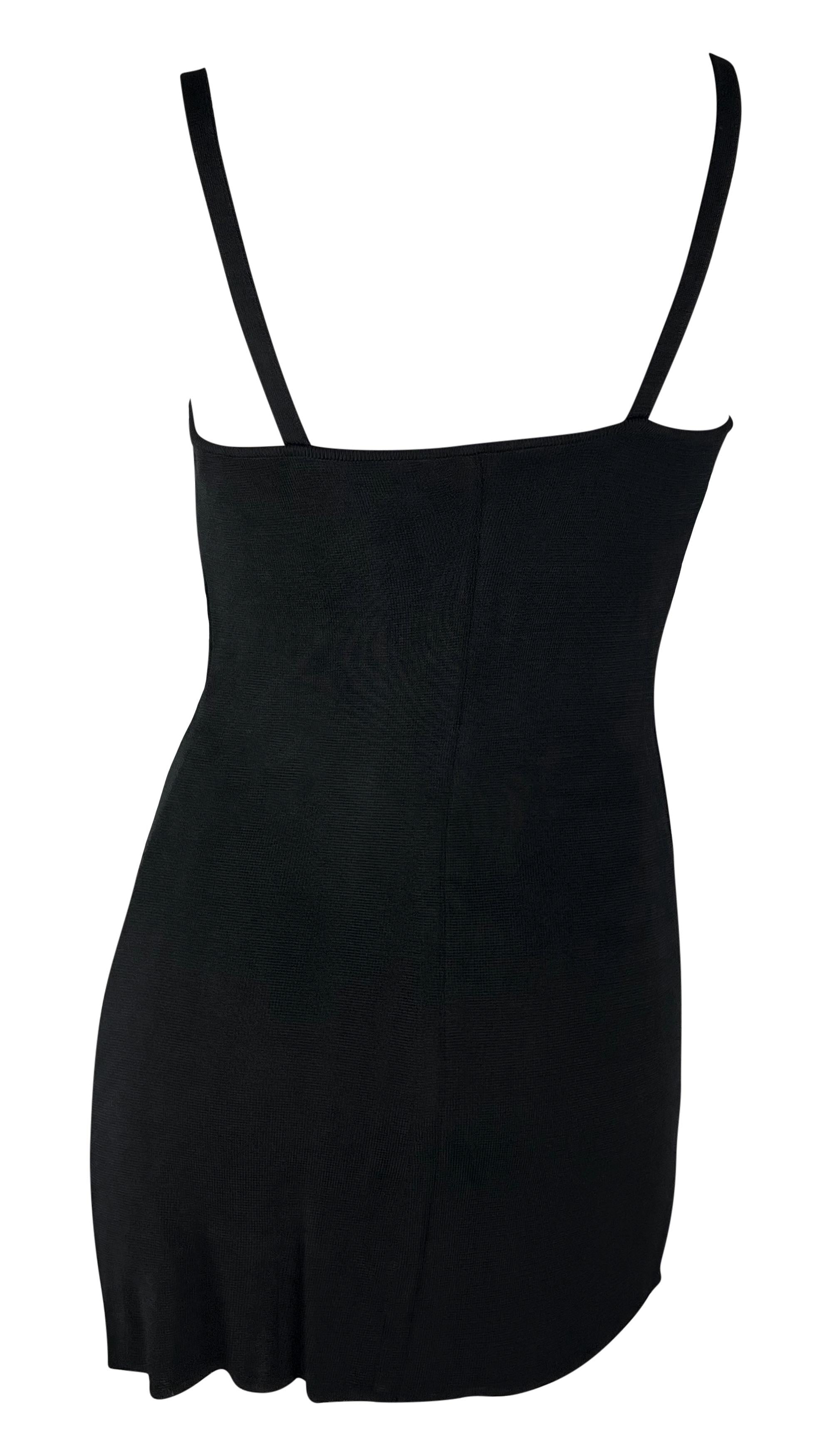 This 1990s Dolce & Gabbana mini dress, crafted from black knit fabric, features a slip-style design. This form-fitting dress is embellished with branded metal accents on the straps.