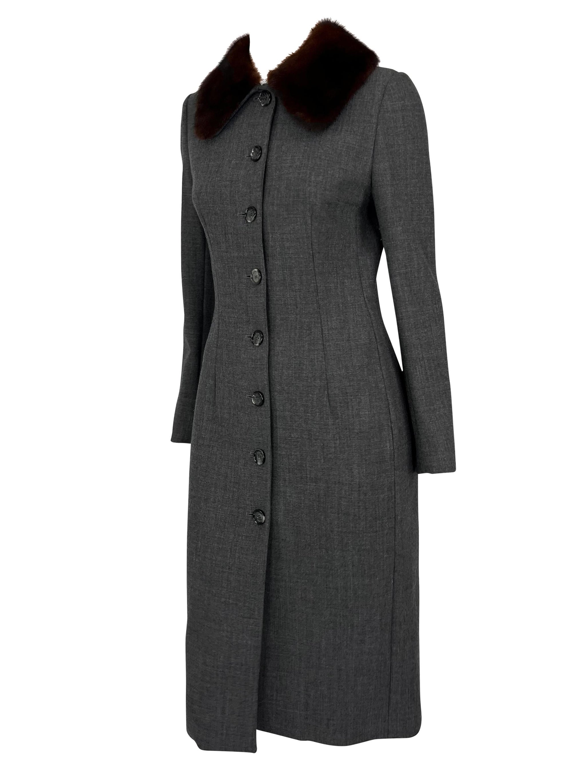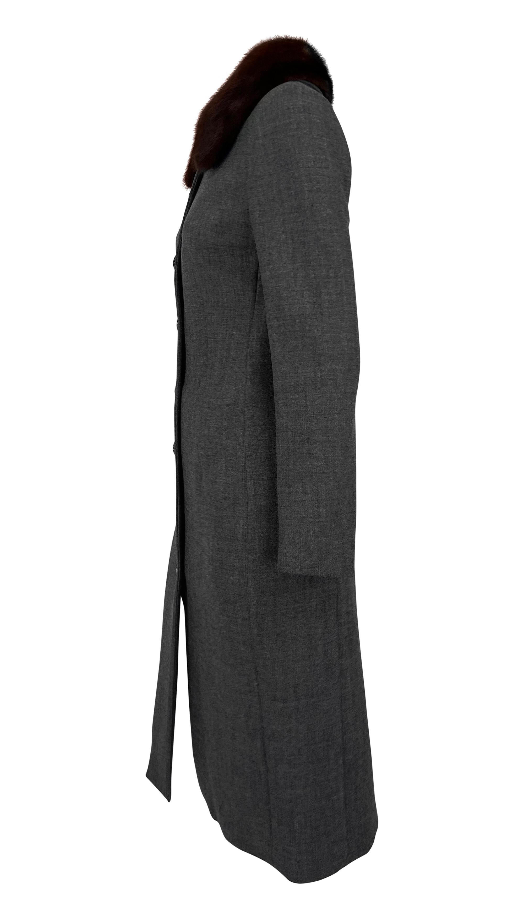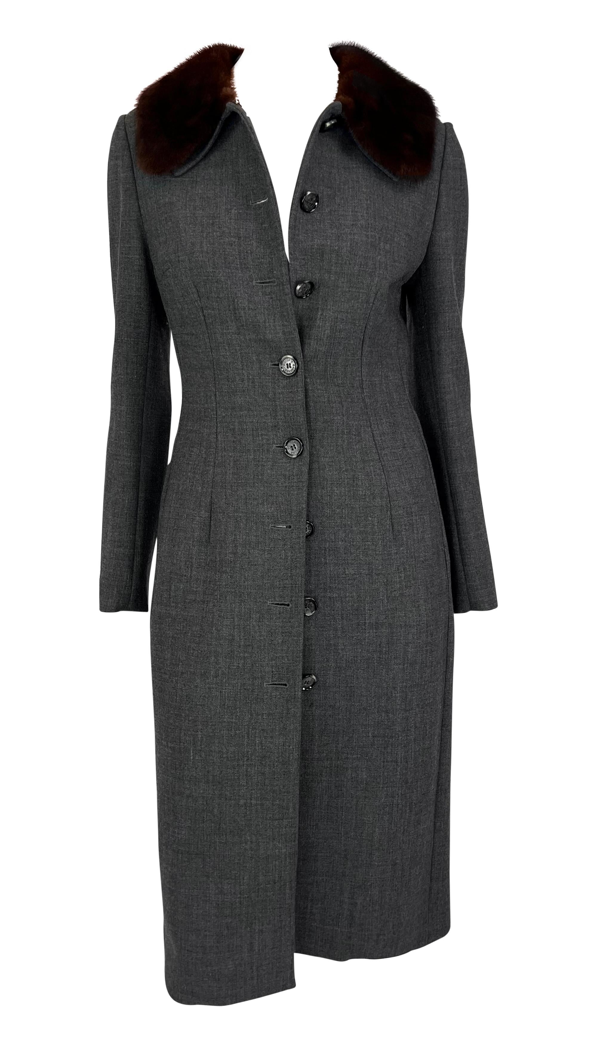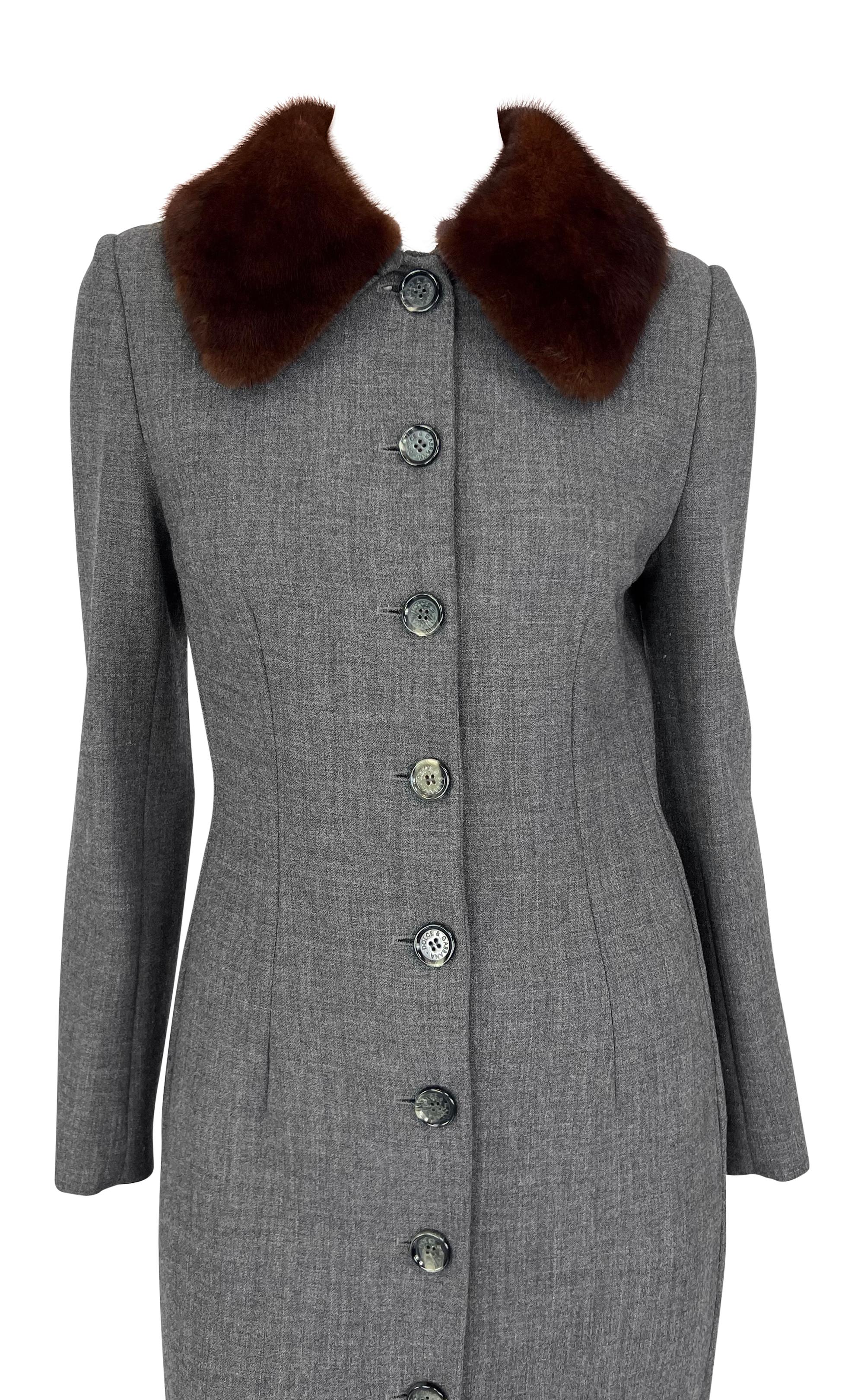 This grey Dolce & Gabbana coat from the 1990s features a tailored design with a button-down front and a genuine sable mink fur trim collar.