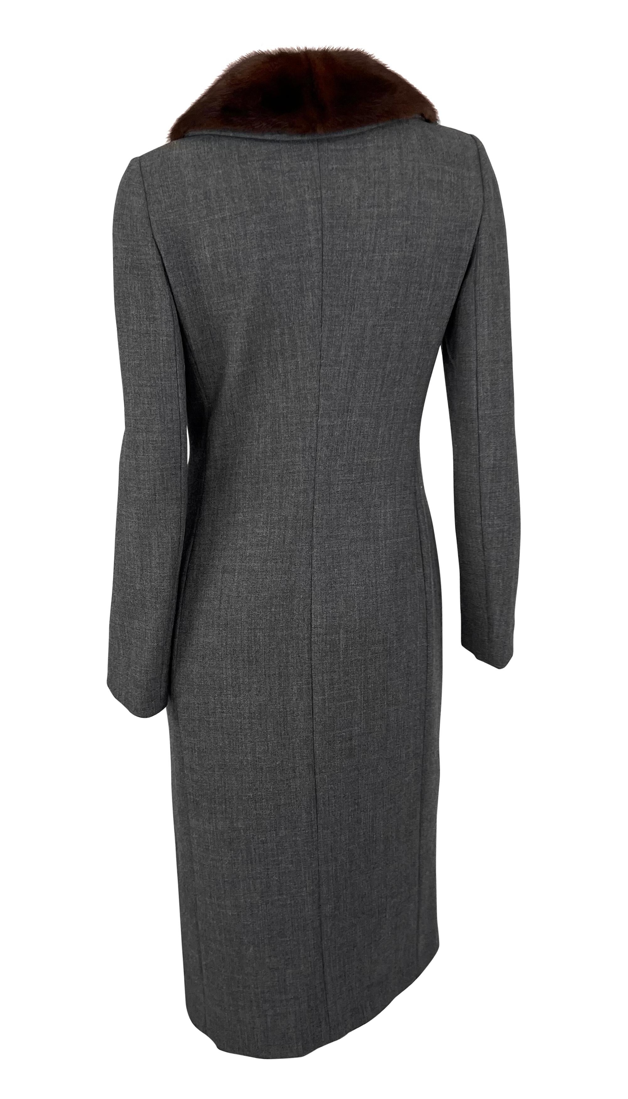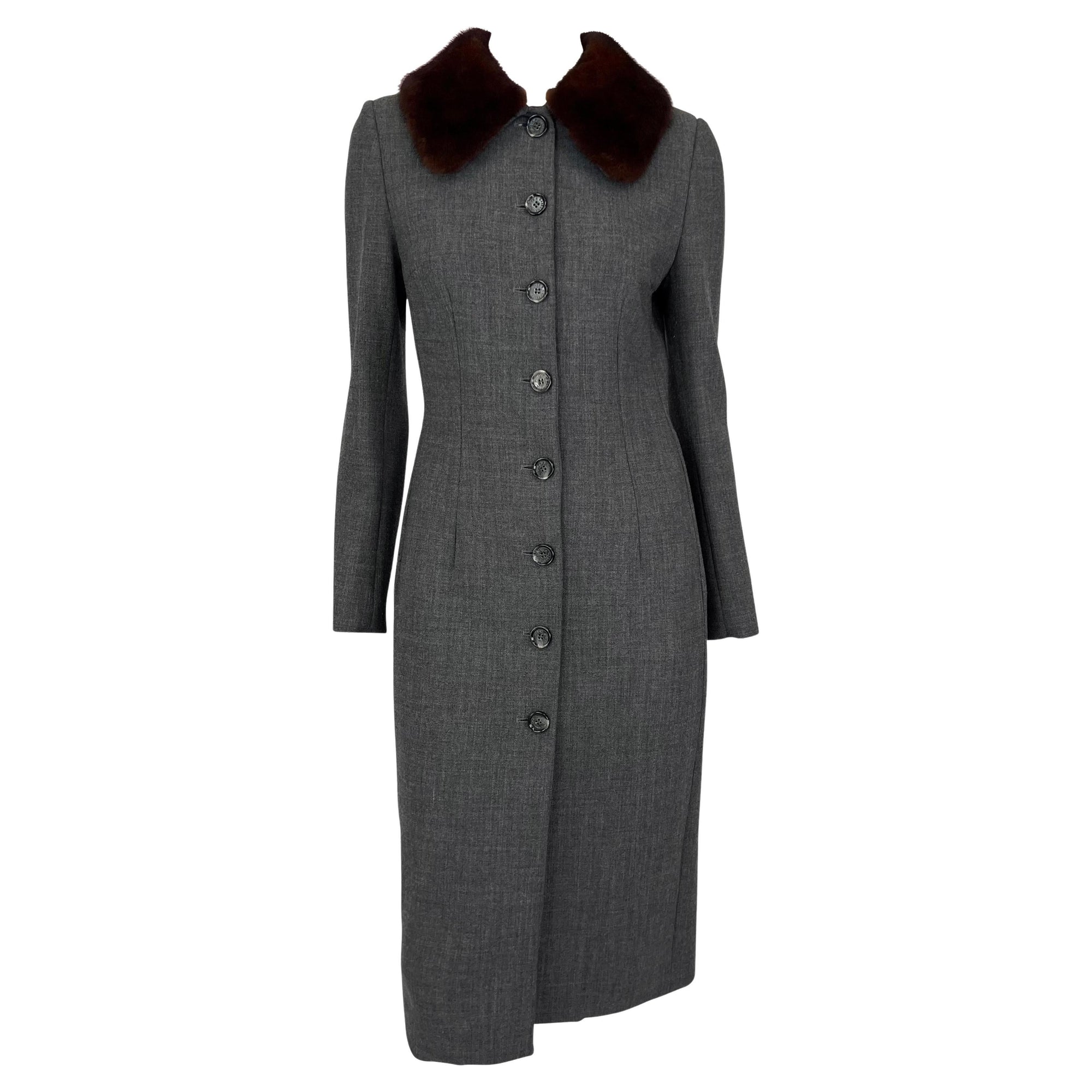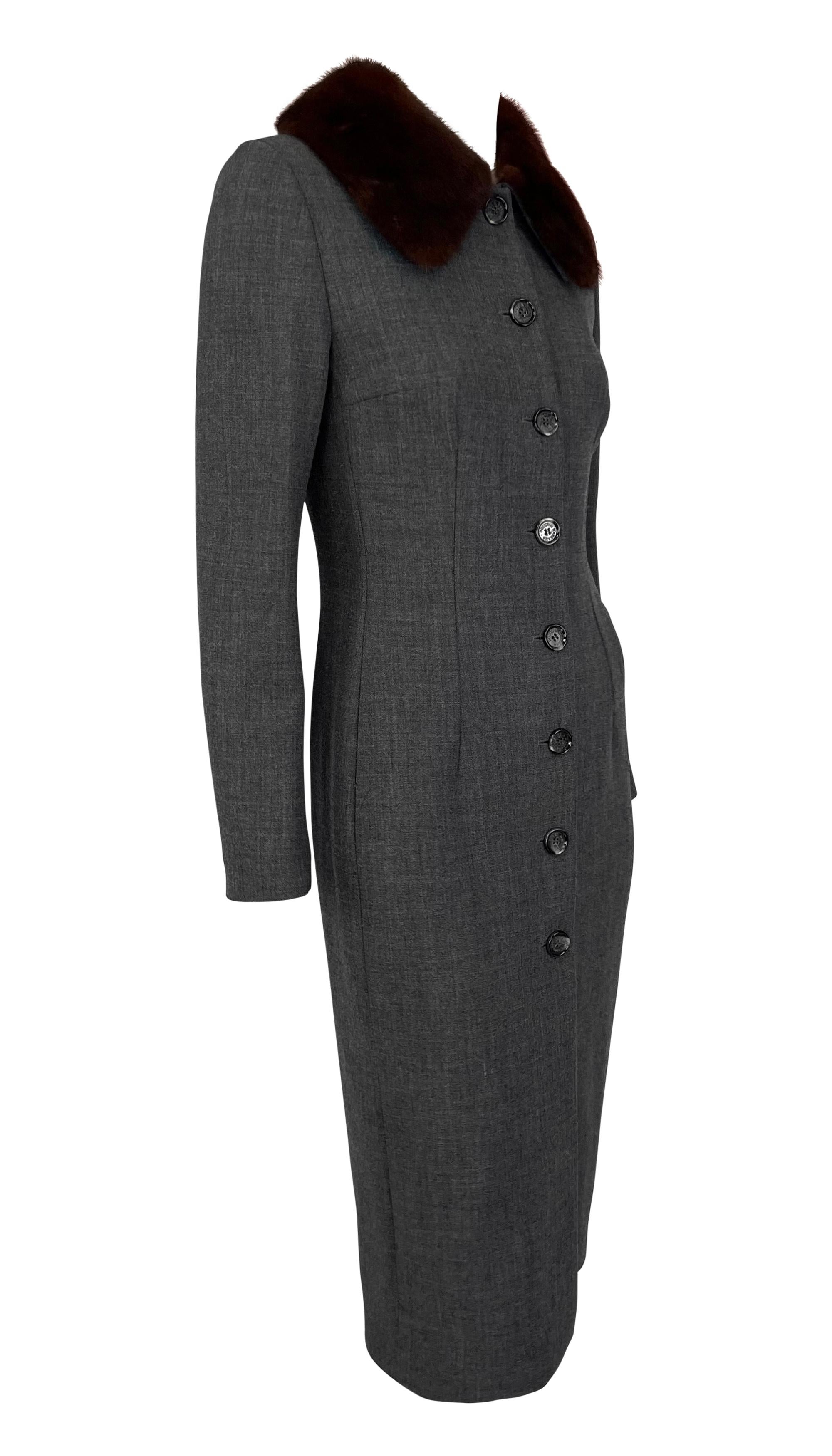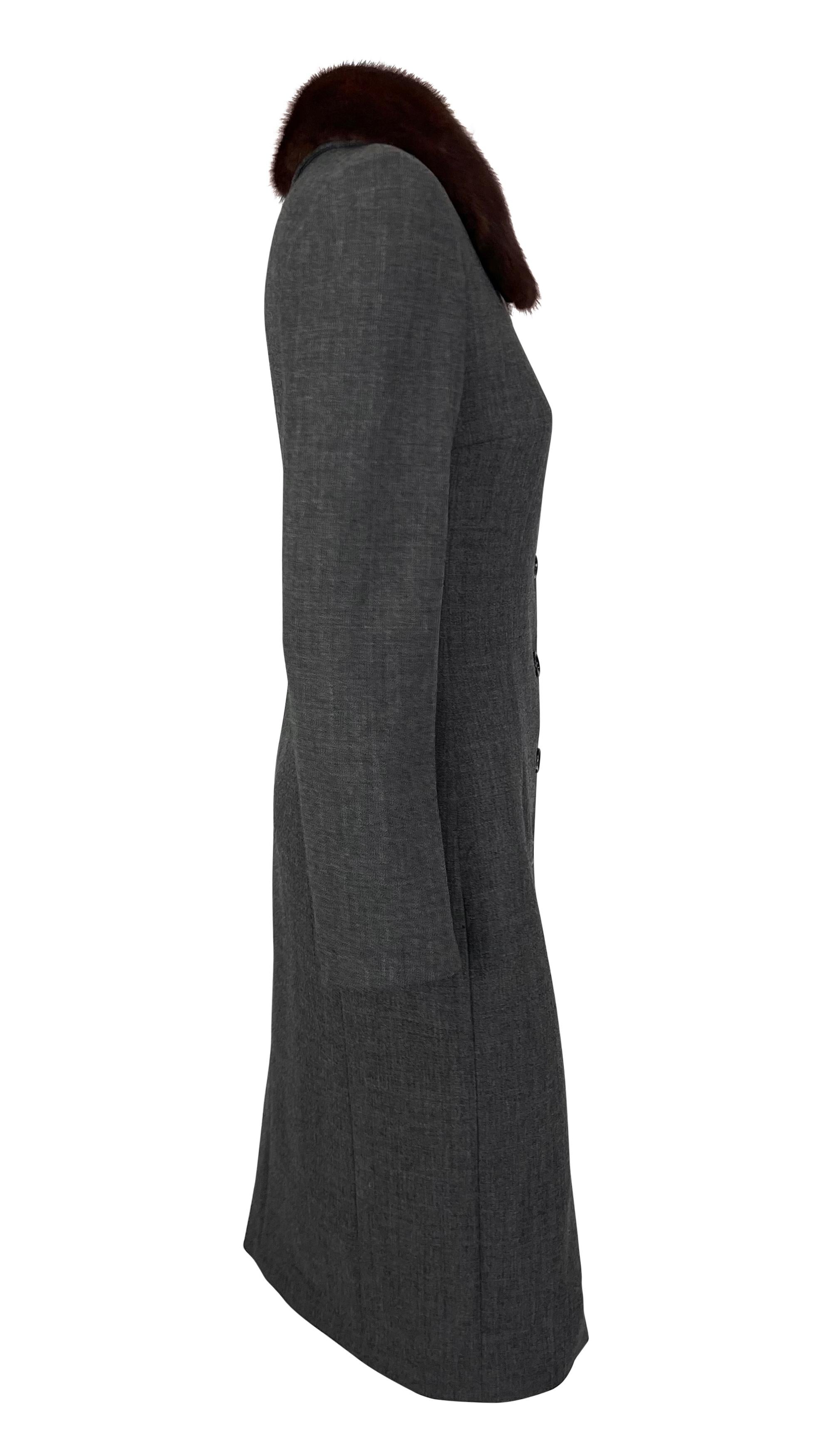 This grey Dolce & Gabbana coat from the 1990s features a tailored design with a button-down front and a genuine sable mink fur trim collar.