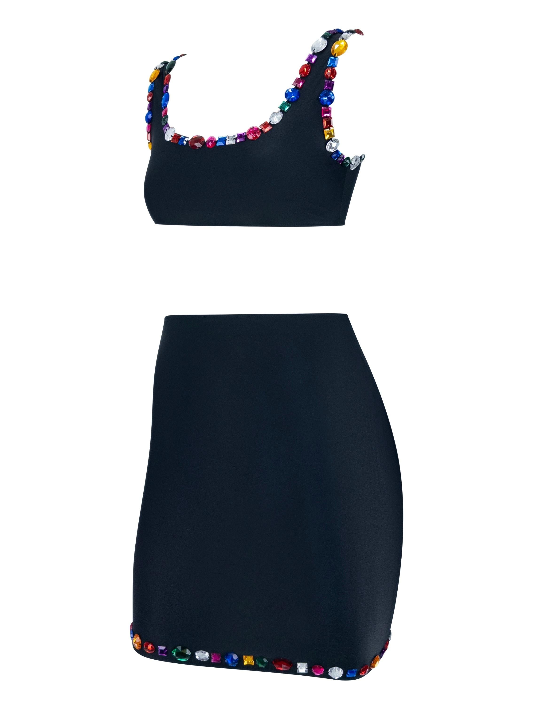 This playful Dolce & Gabbana swim skirt set from the 1990s features a sleek black bikini-style crop top and matching mini skirt, each trimmed with oversized multicolor rhinestones. The bold jeweled embellishments add a vibrant, glamorous touch to the otherwise minimalist silhouette.