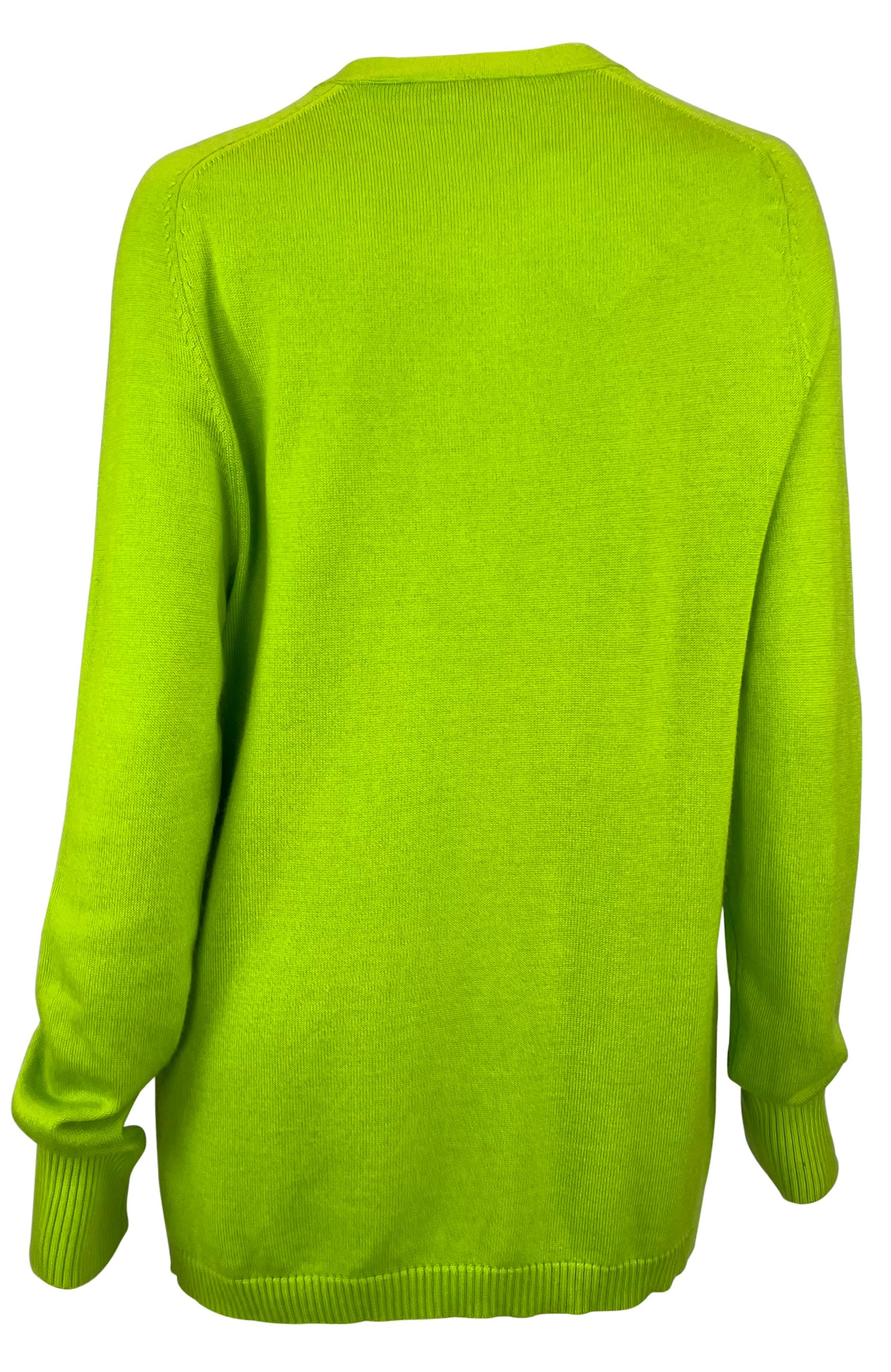 This bright green Donna Karan cardigan features an open-front design with two front pockets and ribbed cuffs. Its long sleeves and relaxed fit make it a versatile and comfortable layering piece, perfect for adding a pop of color to any outfit.