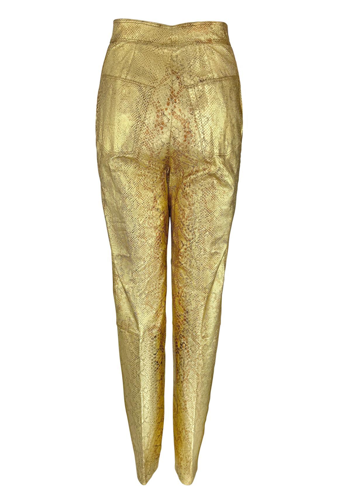 From the 1990s, these Emanuel Ungaro pants are crafted from gold metallic leather embossed with a bold snakeskin motif. Featuring a high-rise waist and tapered leg.