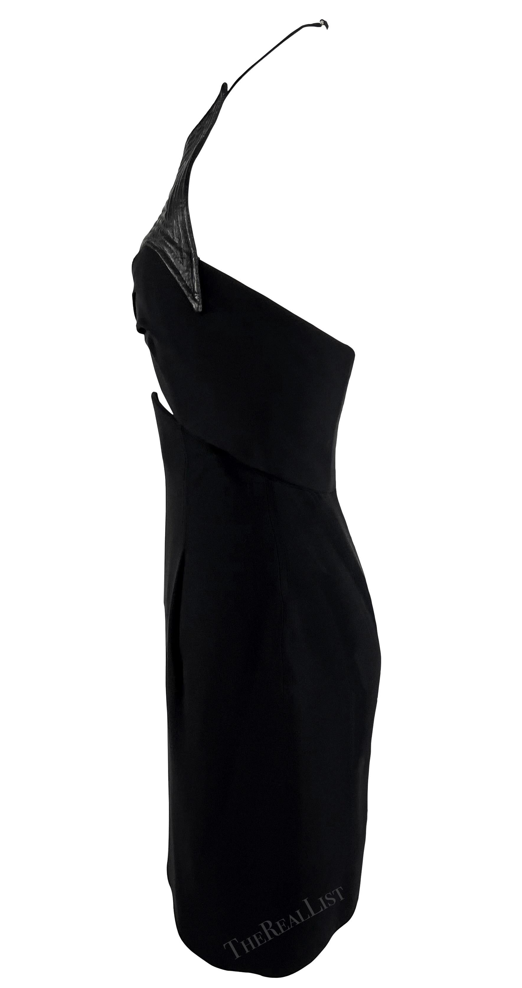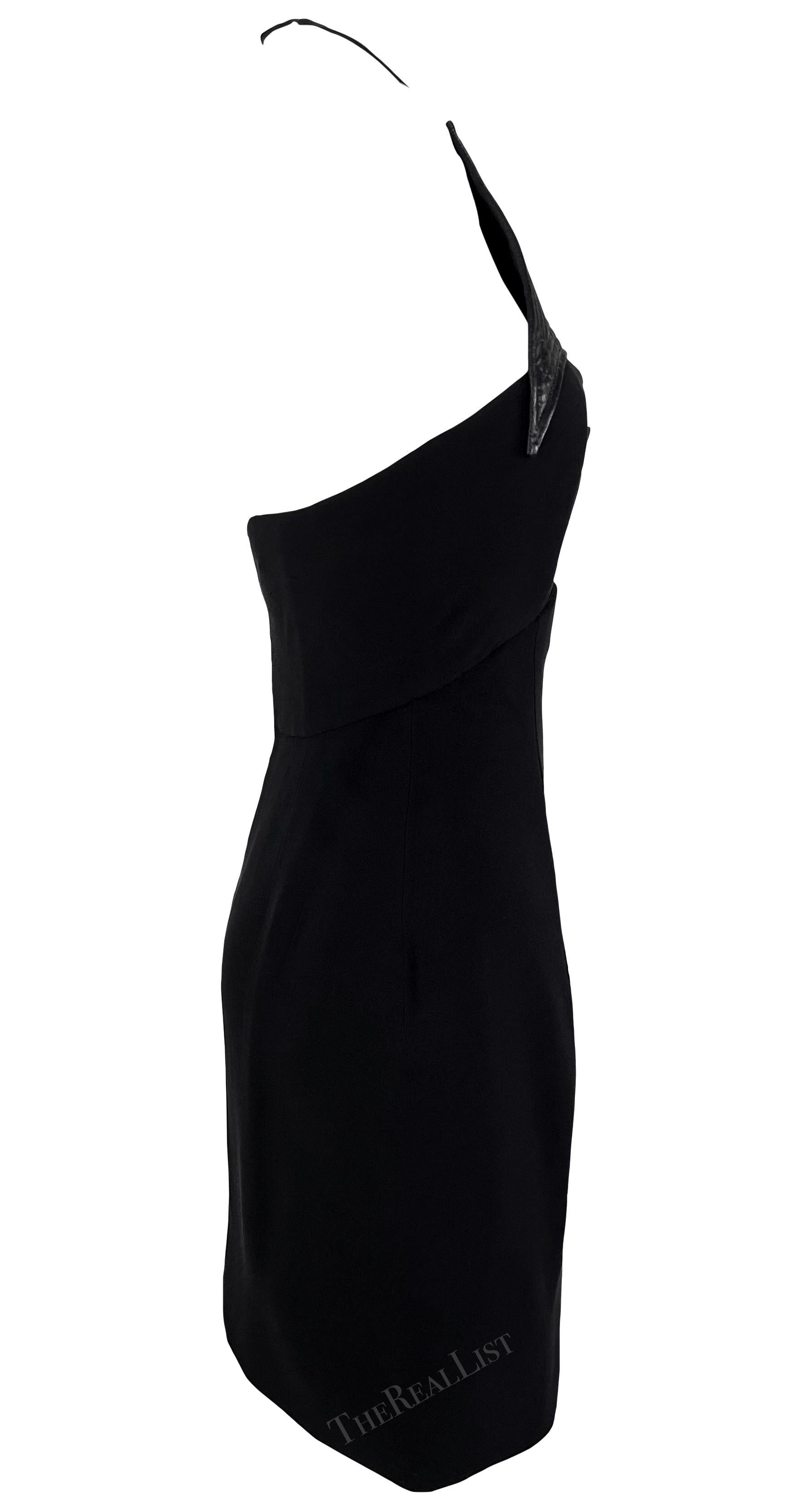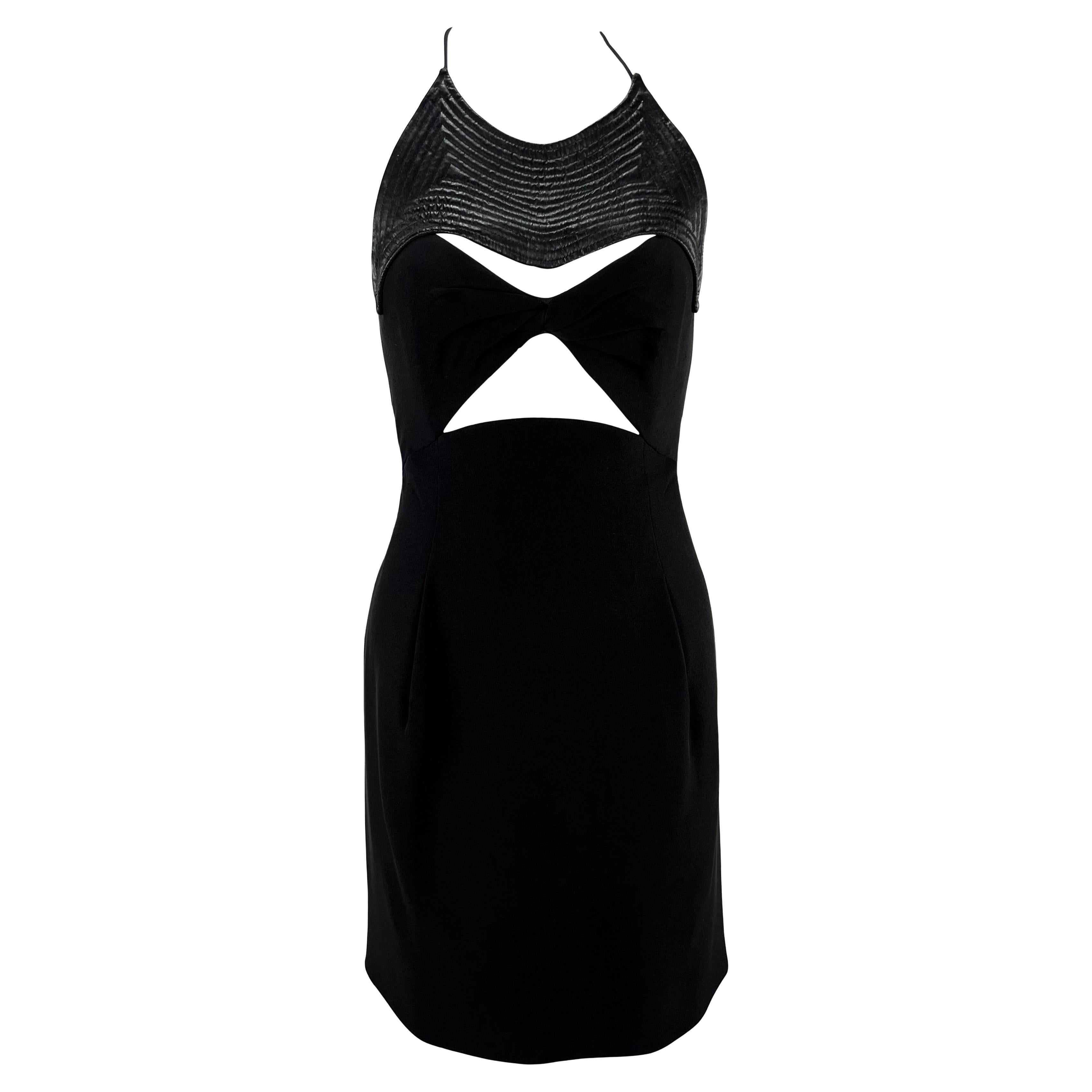 This Geoffrey Beene little black dress from the 1990s is a chic addition to any wardrobe. This mini dress features a halterneck style with thin neck straps, cutouts at the bust, and a semi-exposed back. This sexy little dress is elevated with a shiny quilted accent above the bust.