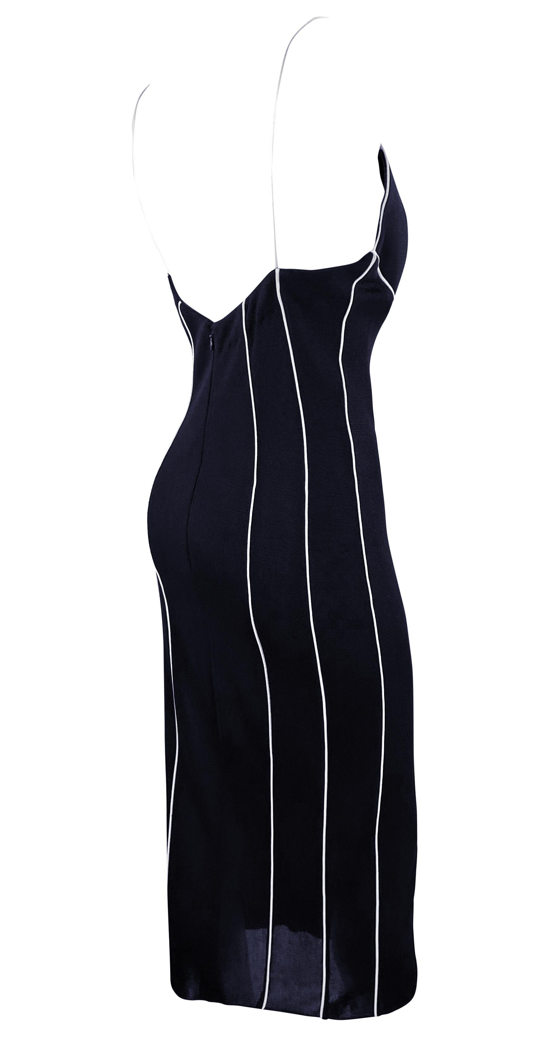 From the 1990s, this gorgeous navy blue Gianfranco Ferré slip dress is the perfect classic bombshell dress. This chic, form-fitting dress features a princess neckline, spaghetti straps, a below-the-knee hem, and a semi-exposed back. The white straps match the white linear seams that define the female form.