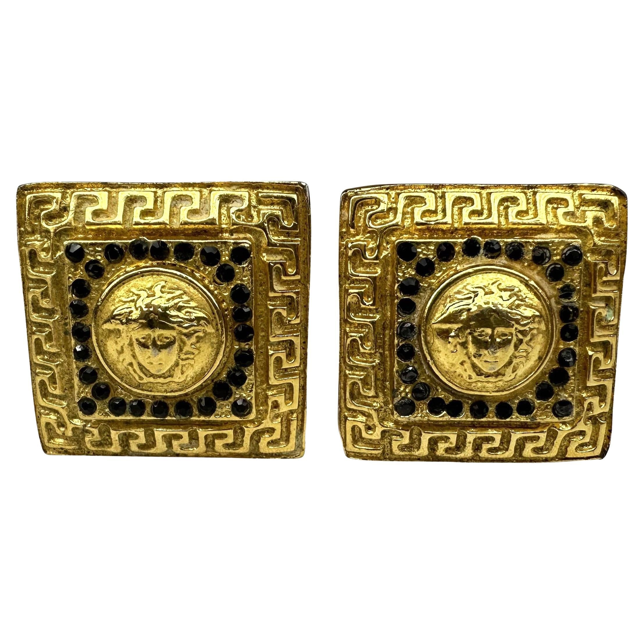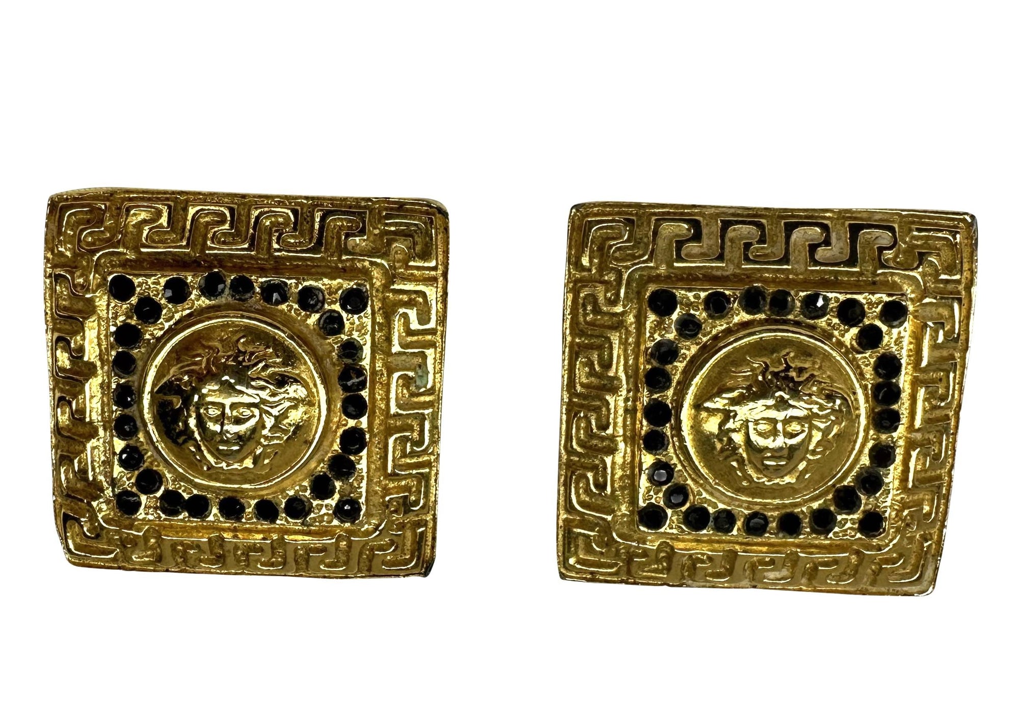 Presenting a pair of large gold-tone Gianni Versace Medusa clip-on earrings designed by Gianni Versace. From the 1990s, these fabulous large square earrings feature a Greek key border and are complete with a large Versace Medusa logo surrounded by black rhinestones.