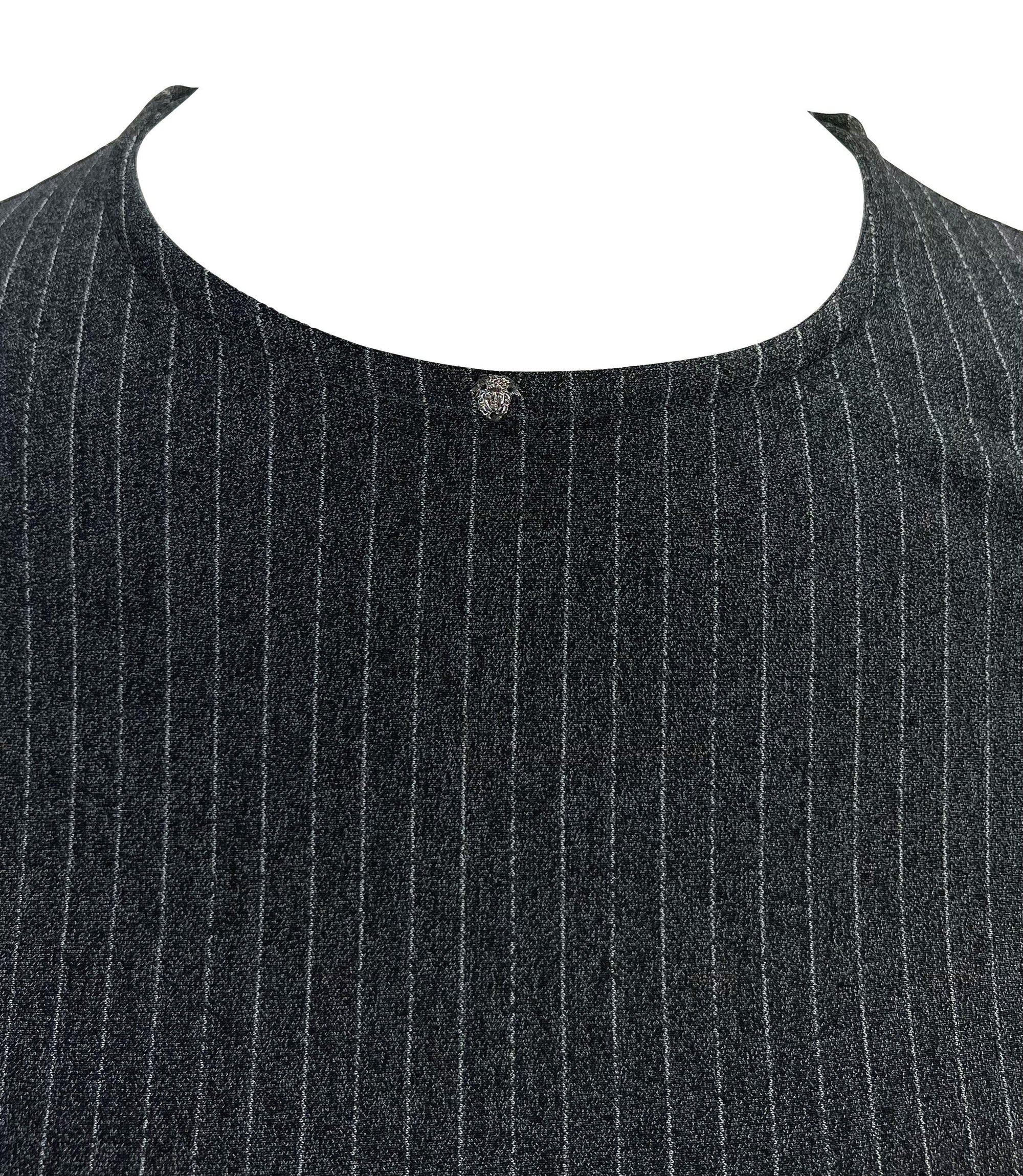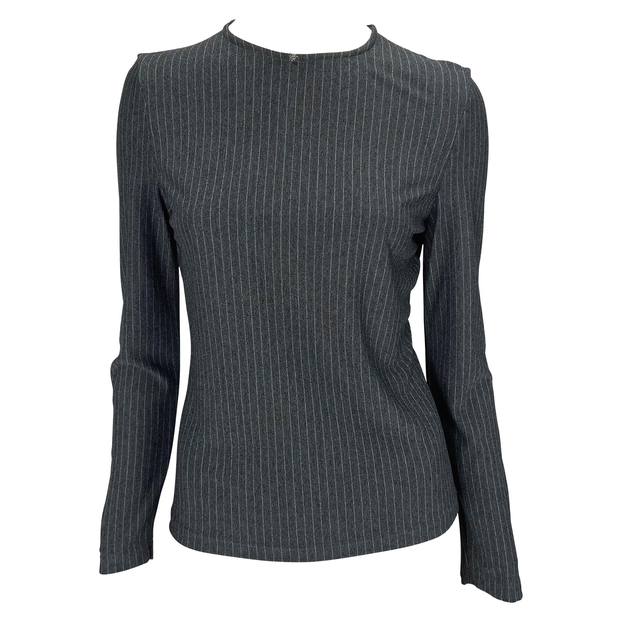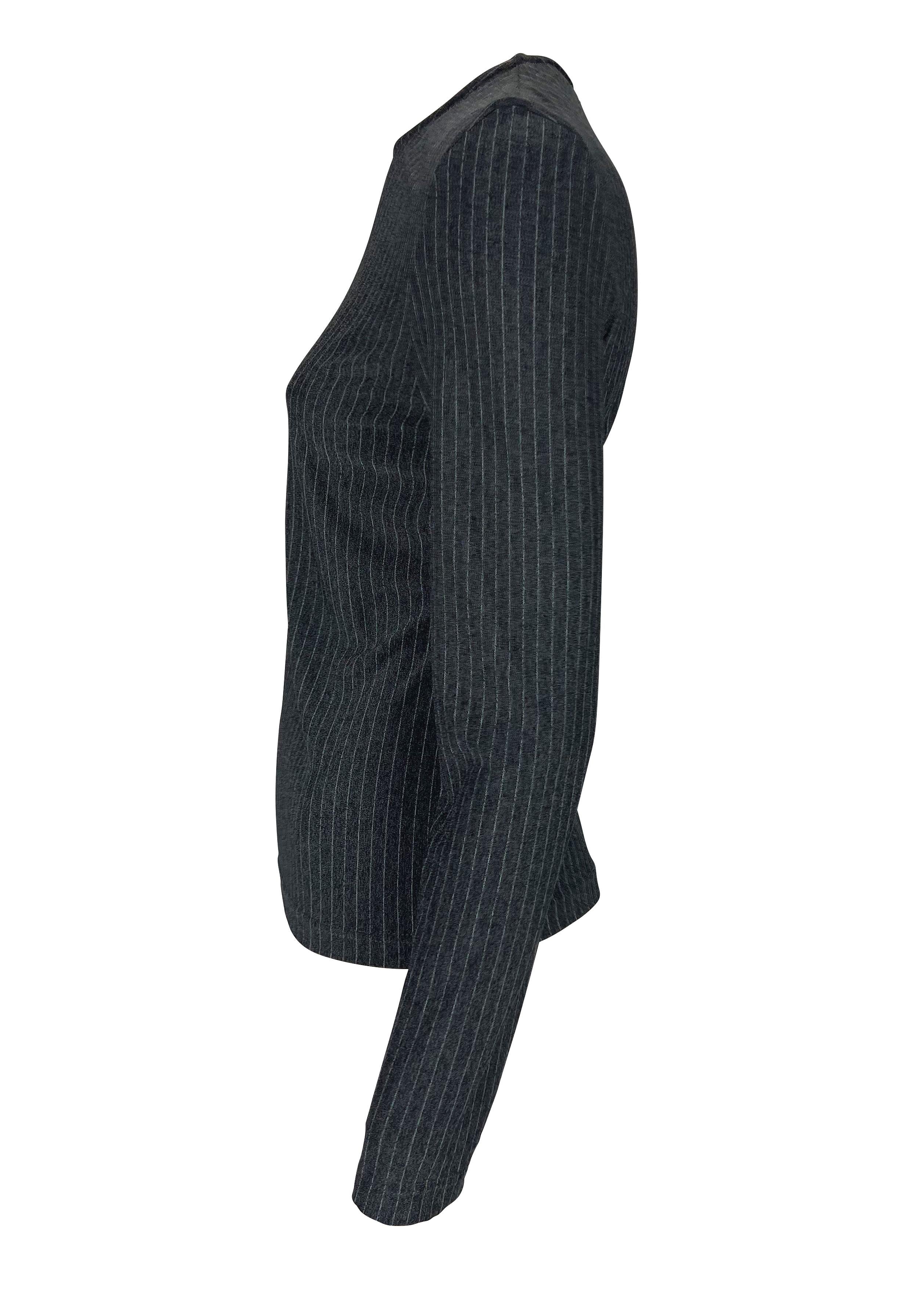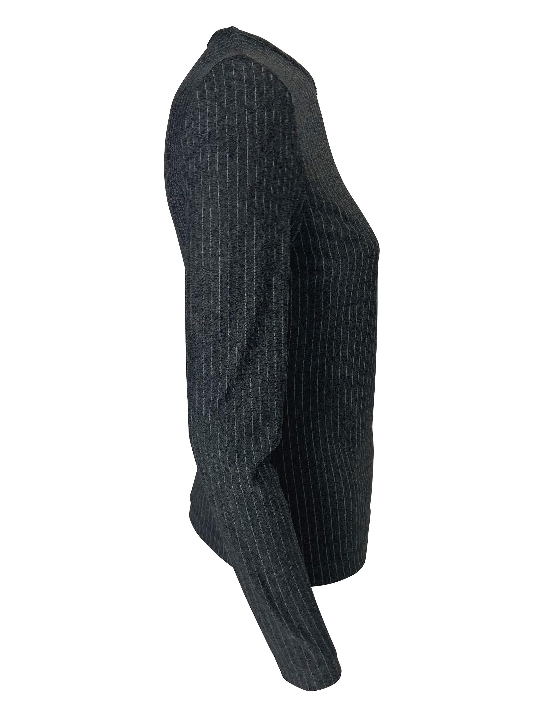 Presenting a grey pinstripe Gianni Versace Couture long sleeve shirt, designed by Donatella Versace. From the late 1990s, this form-fitting stretch top features a crew neckline and is made complete with a mini Versace Medusa at the neckline. Add this perfectly chic top to your wardrobe!