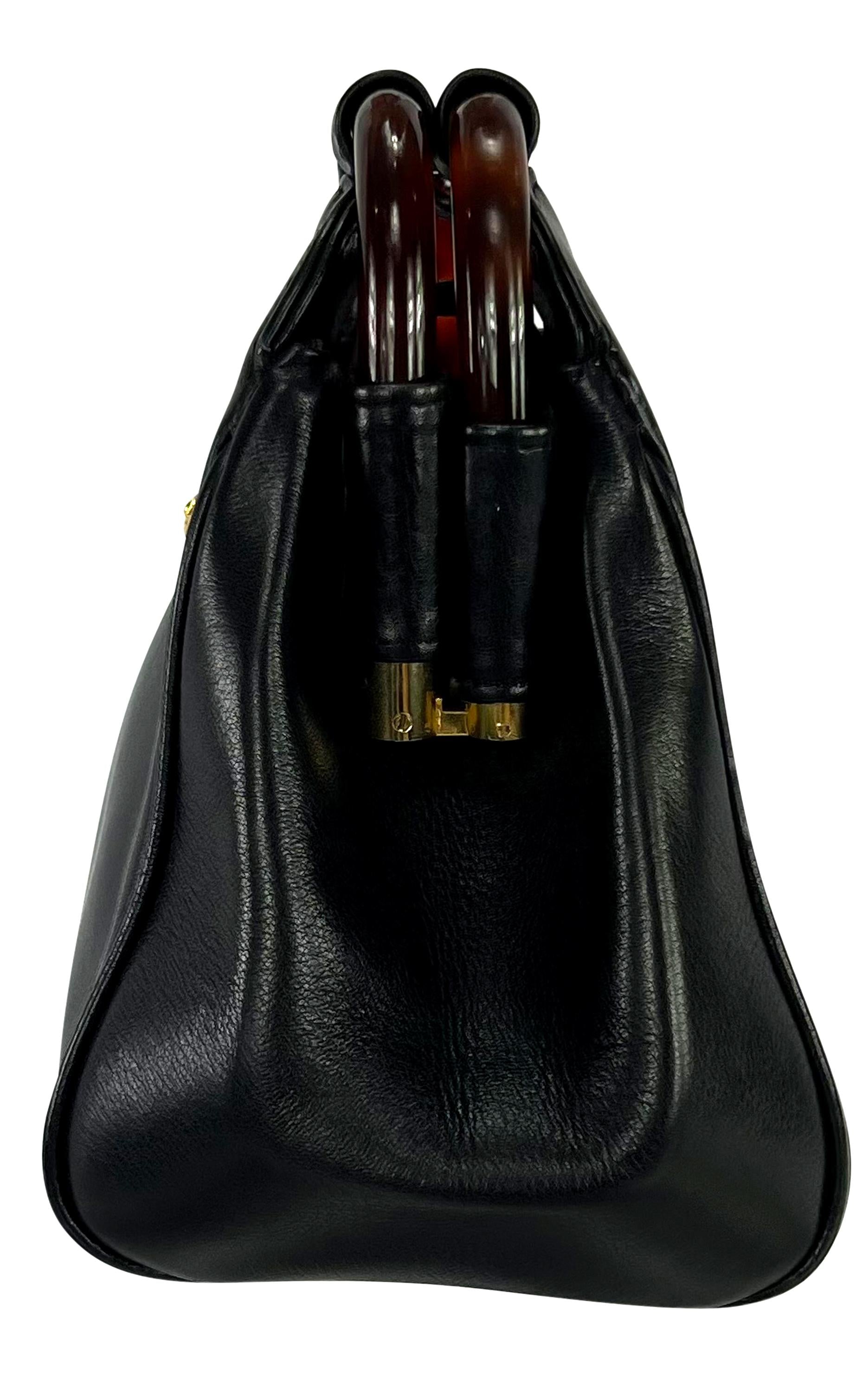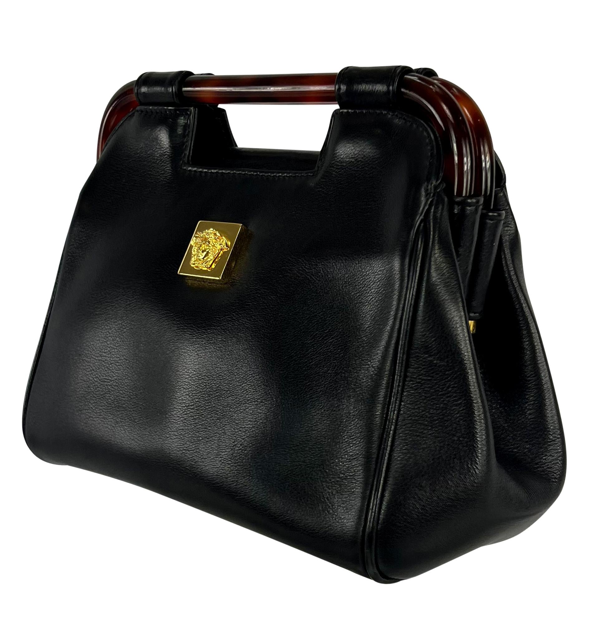 In the 1990s, Gianni Versace designed this unique top-handle bag for his namesake brand. This small black leather bag features a gold-tone Medusa emblem on the front and is complete with a faux tortoiseshell handle.