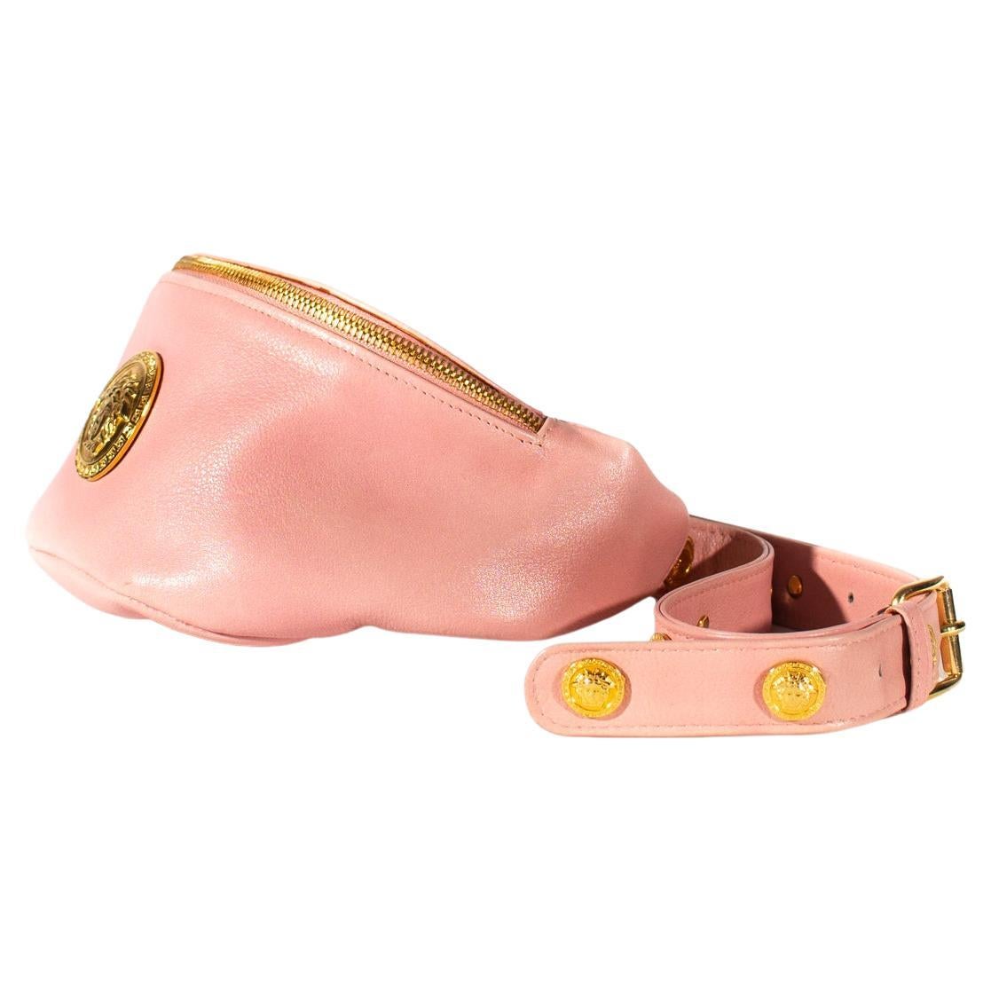 Presenting Constructed with soft light pink leather, this vintage Gianni Versace waist bag screams Versace. Embellished with gold Medusa coins, this bum bag is perfect for elevating any outfit. This bag can be worn in several ways with an adjustable leather strap. The zipper is constructed of a Greek Key and Medusa medallion pull, which opens the pouch-designed by Gianni Versace and made in Italy circa the 1990s.