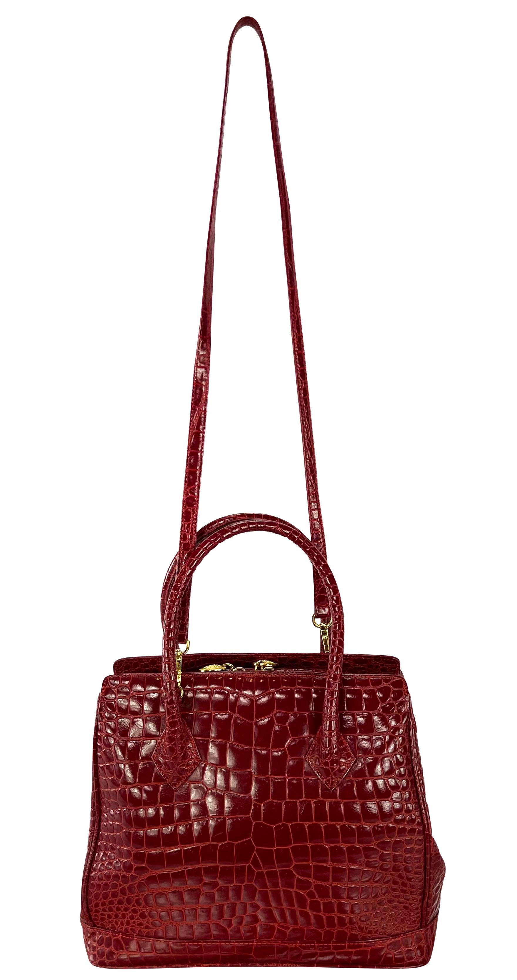 This vibrant red crocodile-embossed Gianni Versace top-handle bag, designed in the 1990s. Constructed of bright red leather, it prominently features a gold-tone Medusa at the front and has an extra strap, allowing it to be styled and worn in multiple ways. This capacious Gianni Versace tote is an easy work bag or travel companion.