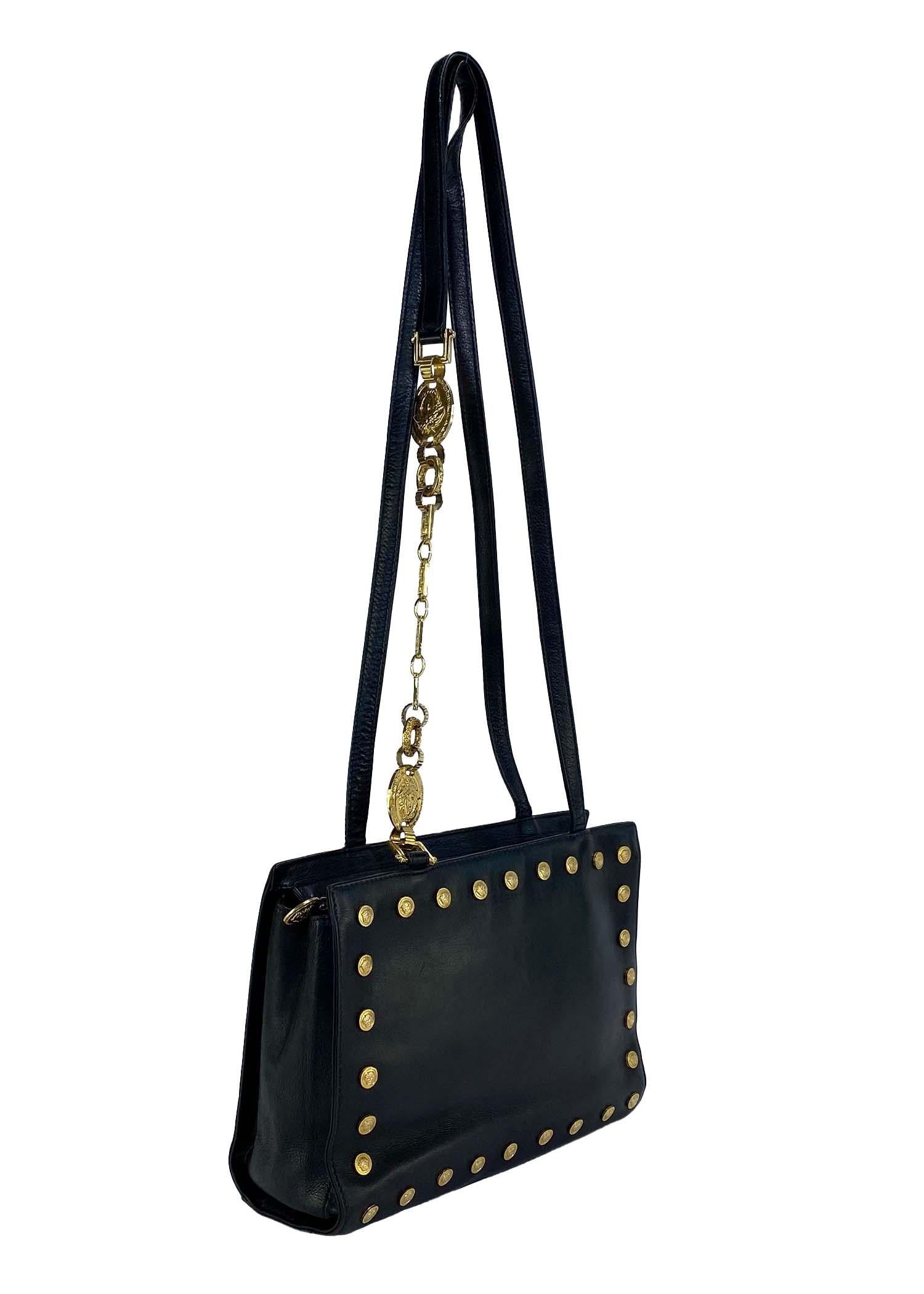 Presenting a classically Gianni Versace Couture purse designed by Gianni Versace. This bag was created in the early/mid-1990s, constructed entirely of black leather, and featured a border of small Medusa logo medallions with a large gold-colored chain at the strap. This bag could be versatile as a crossbody or shoulder bag. It is thoughtfully made and complete with a gold Medusa medallion zipper pull.