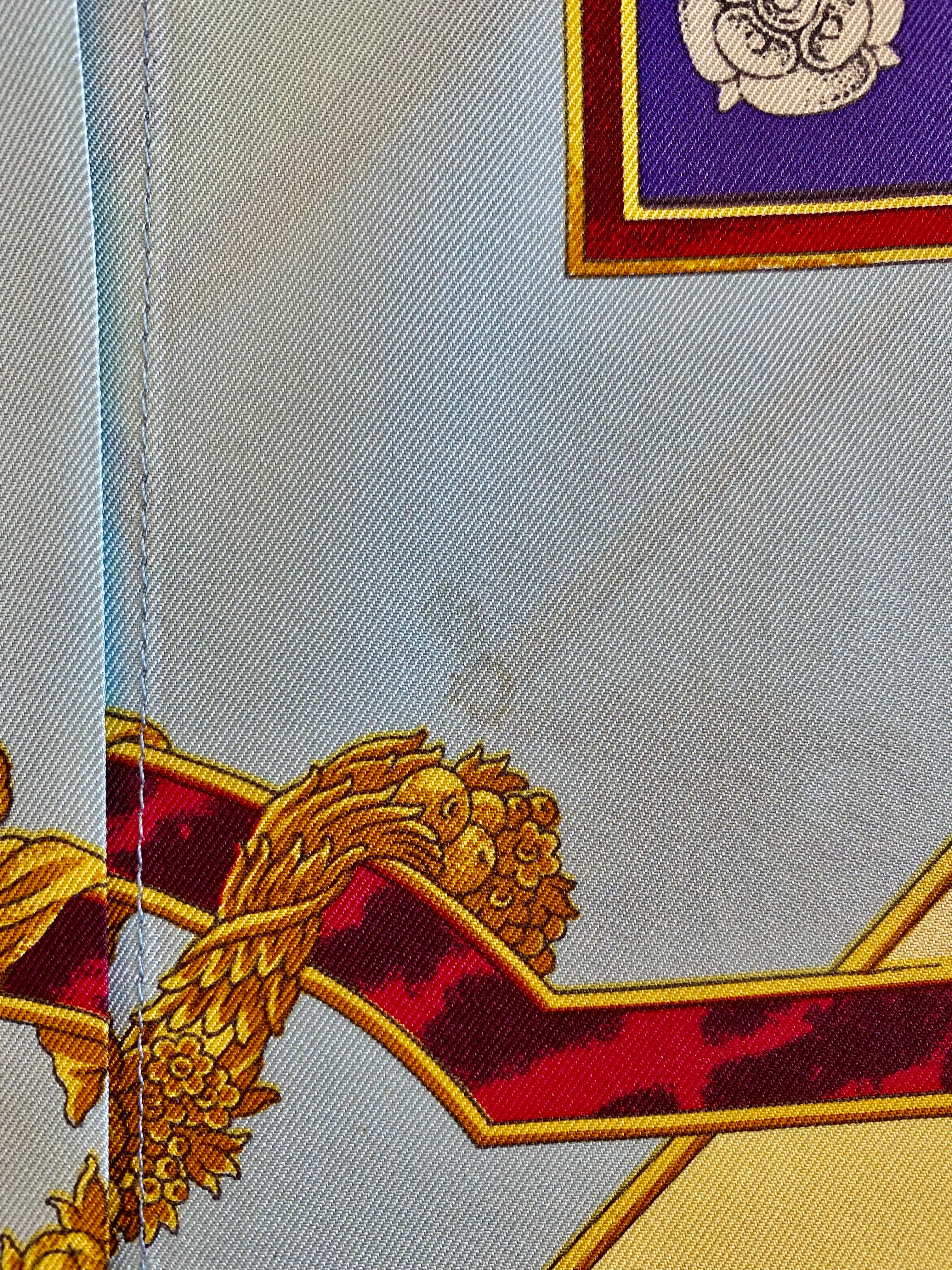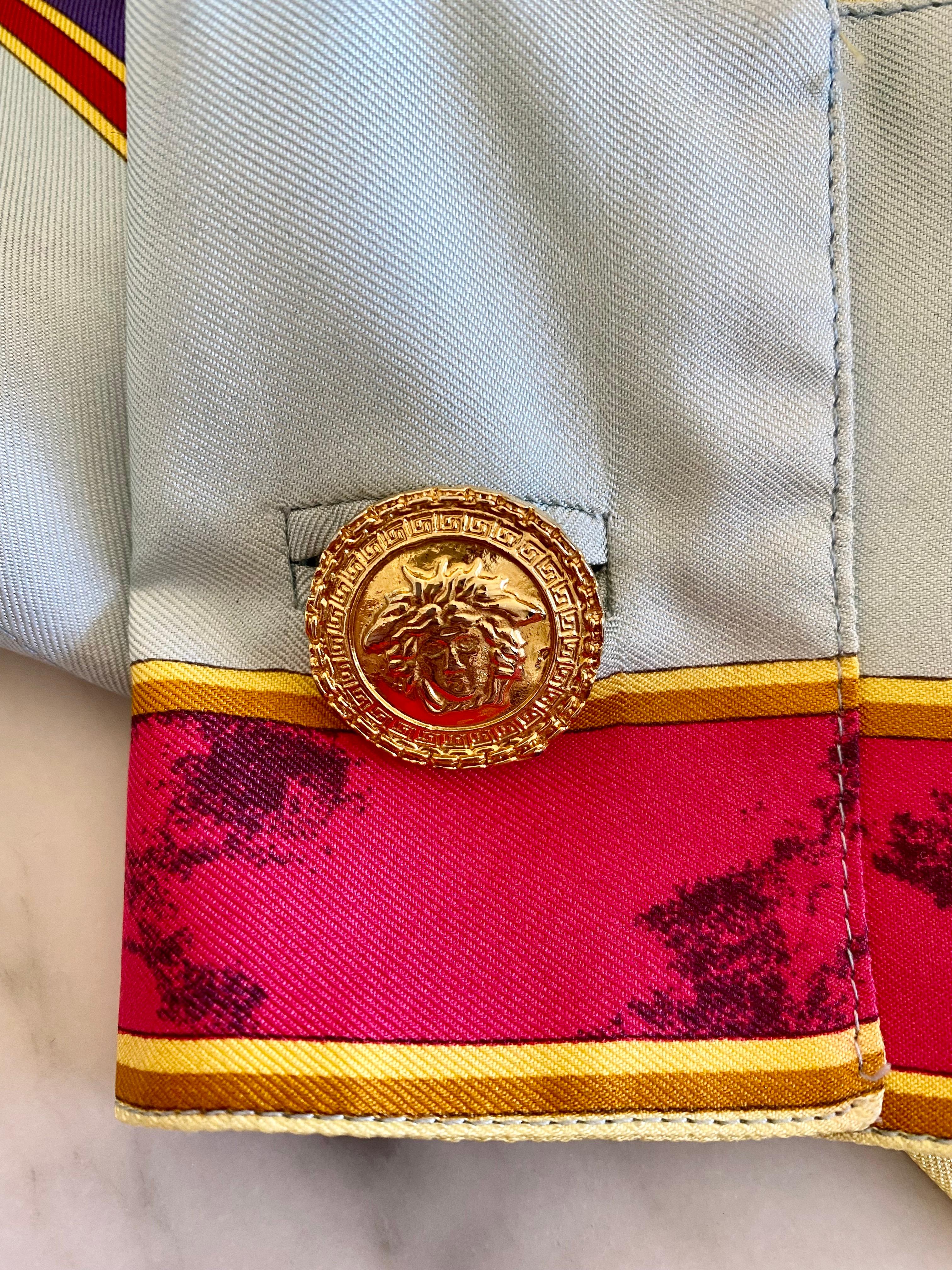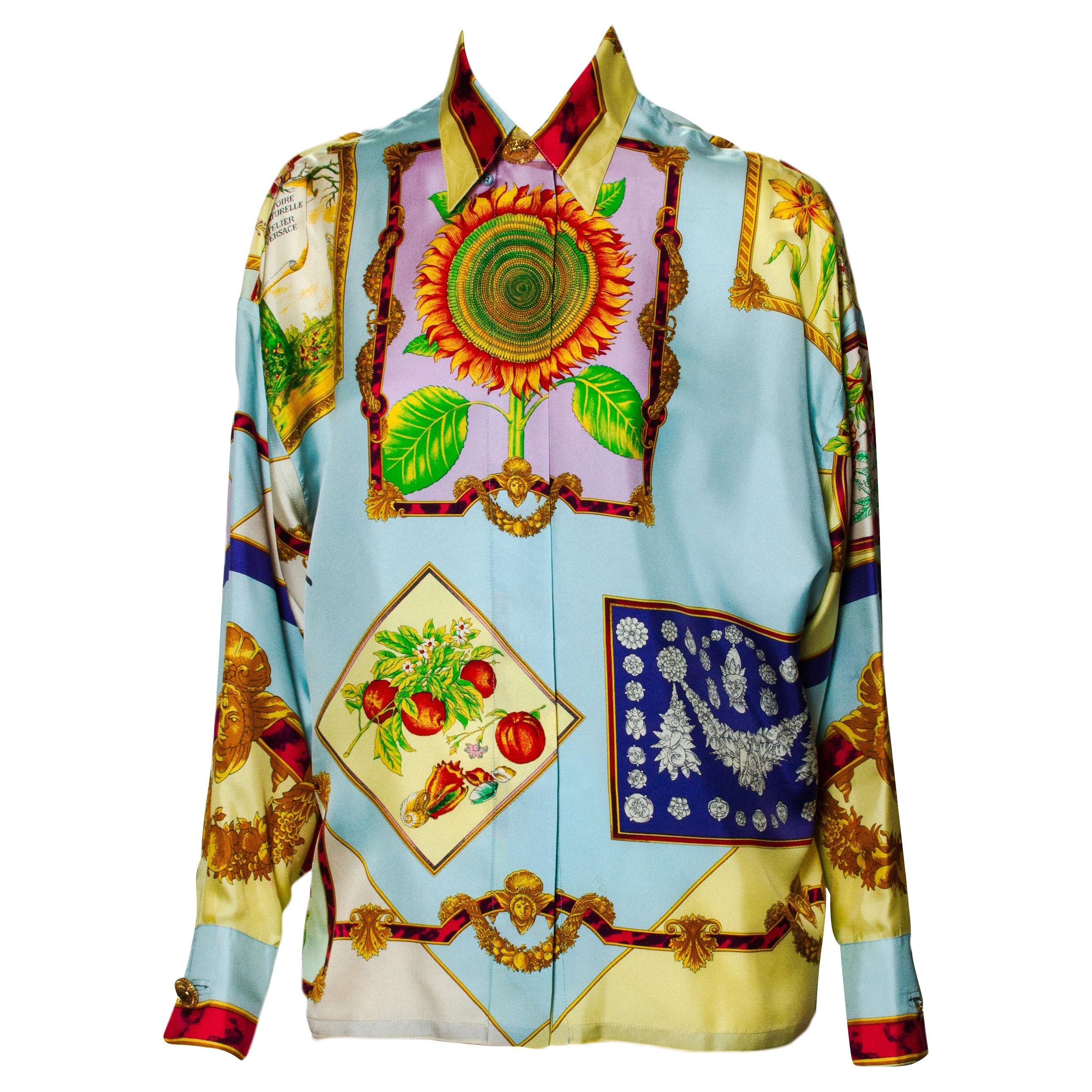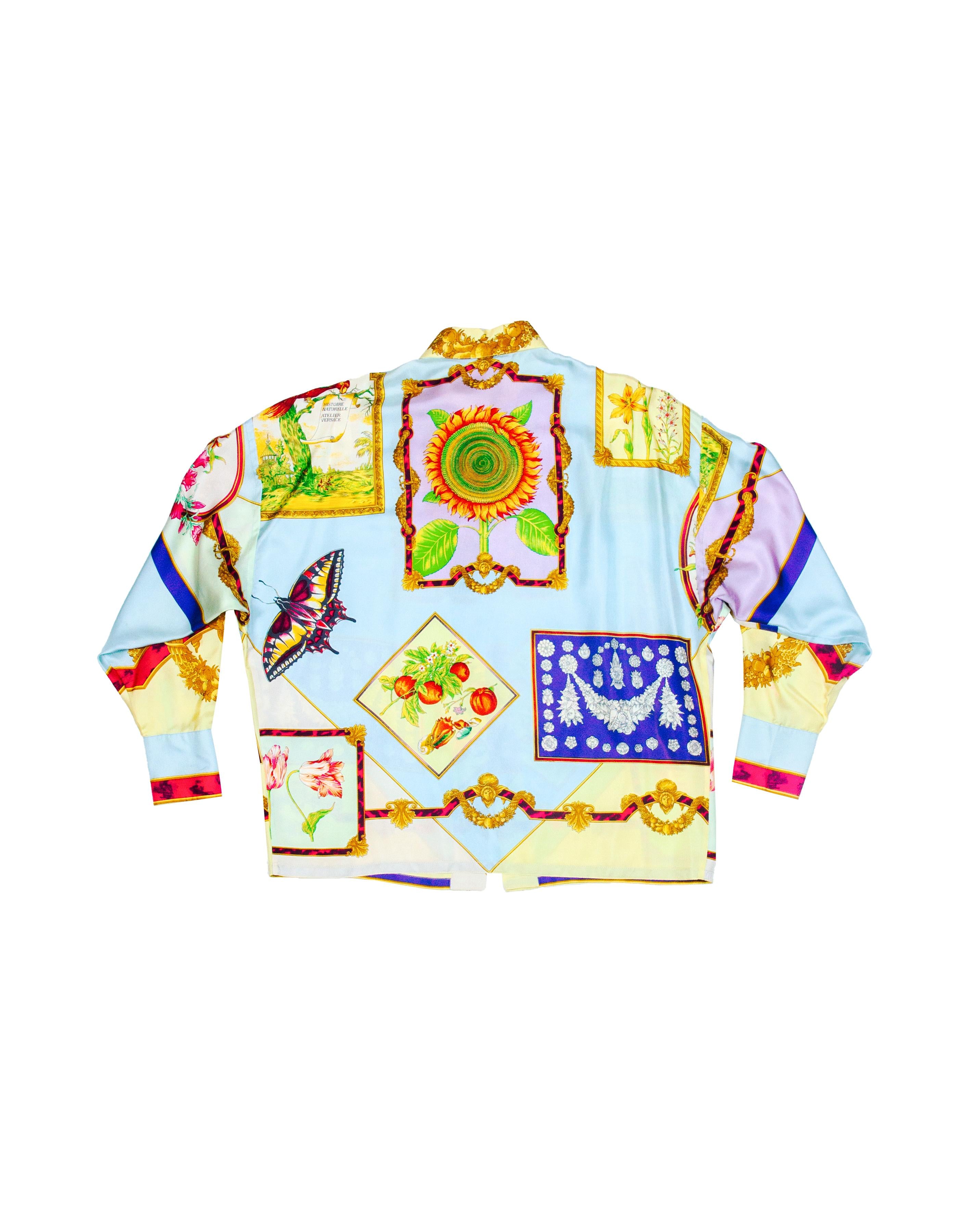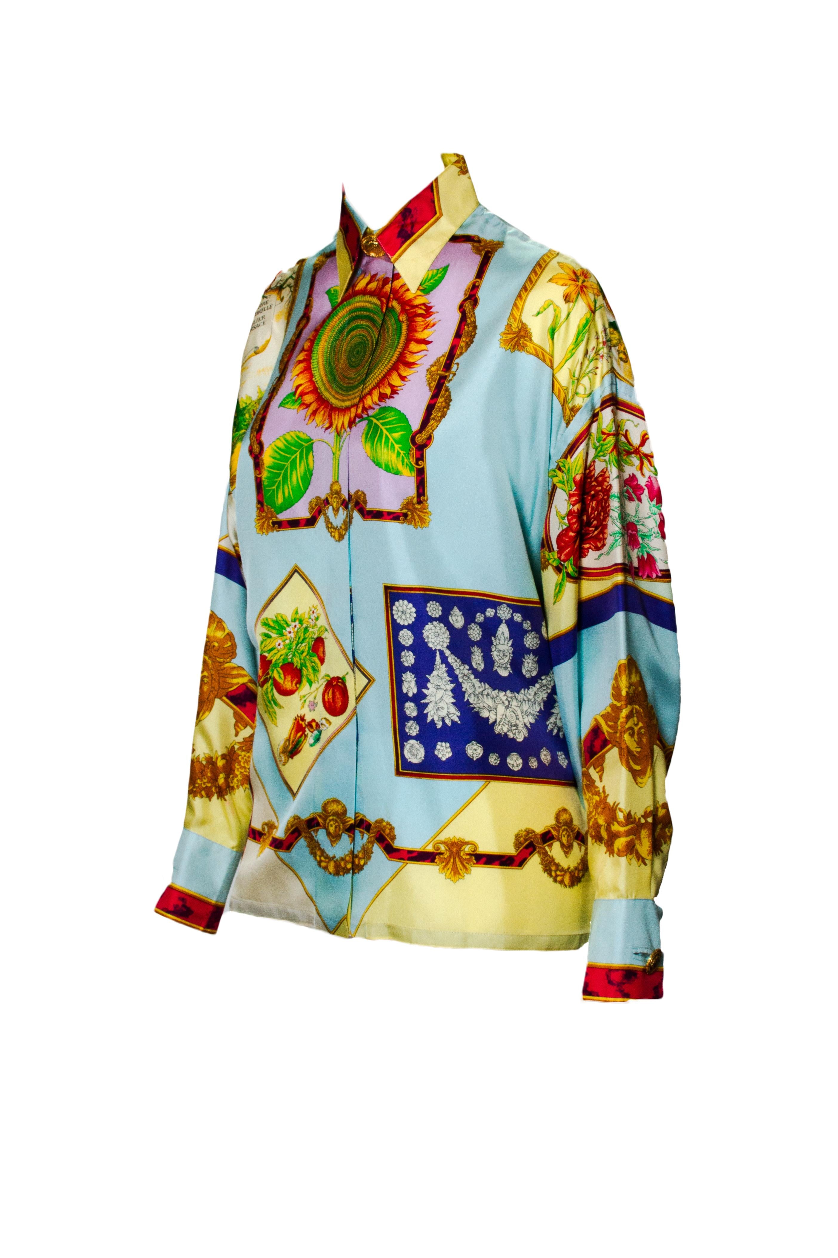 This bright silk collared shirt features an Atelier Versace original print. With large flowers on the front and back of the blouse, other images on the shirt include flora and fauna themes. The shirt additionally has an elaborate theme throughout. Large gold-colored Versace Medusa buttons are on the collar and cuffs.