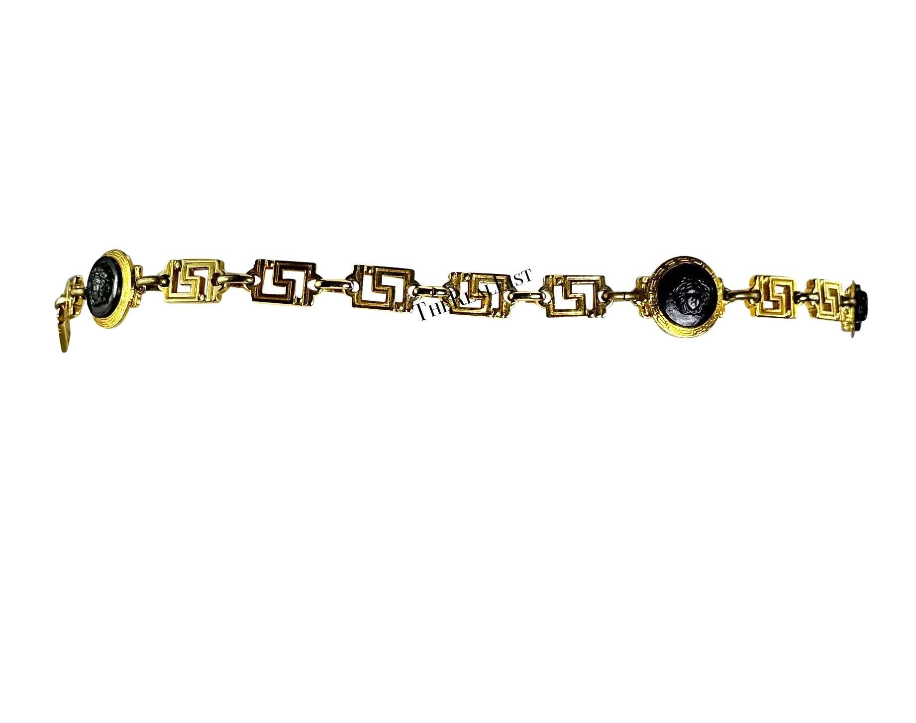 Presenting a beautiful gold-tone Gianni Versace chain link belt designed by Gianni Versace. From the 1990s, this incredible belt features a Greek key link broken up black Versace Medusa reliefs with a double layer chain at the front. This chic belt is the perfect vintage 1990s Versace for any wardrobe.