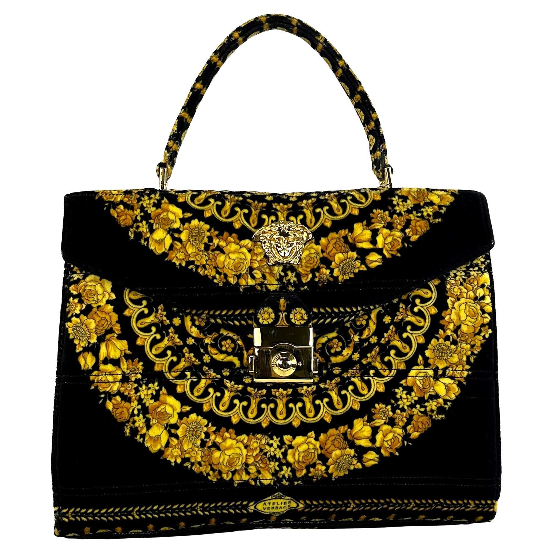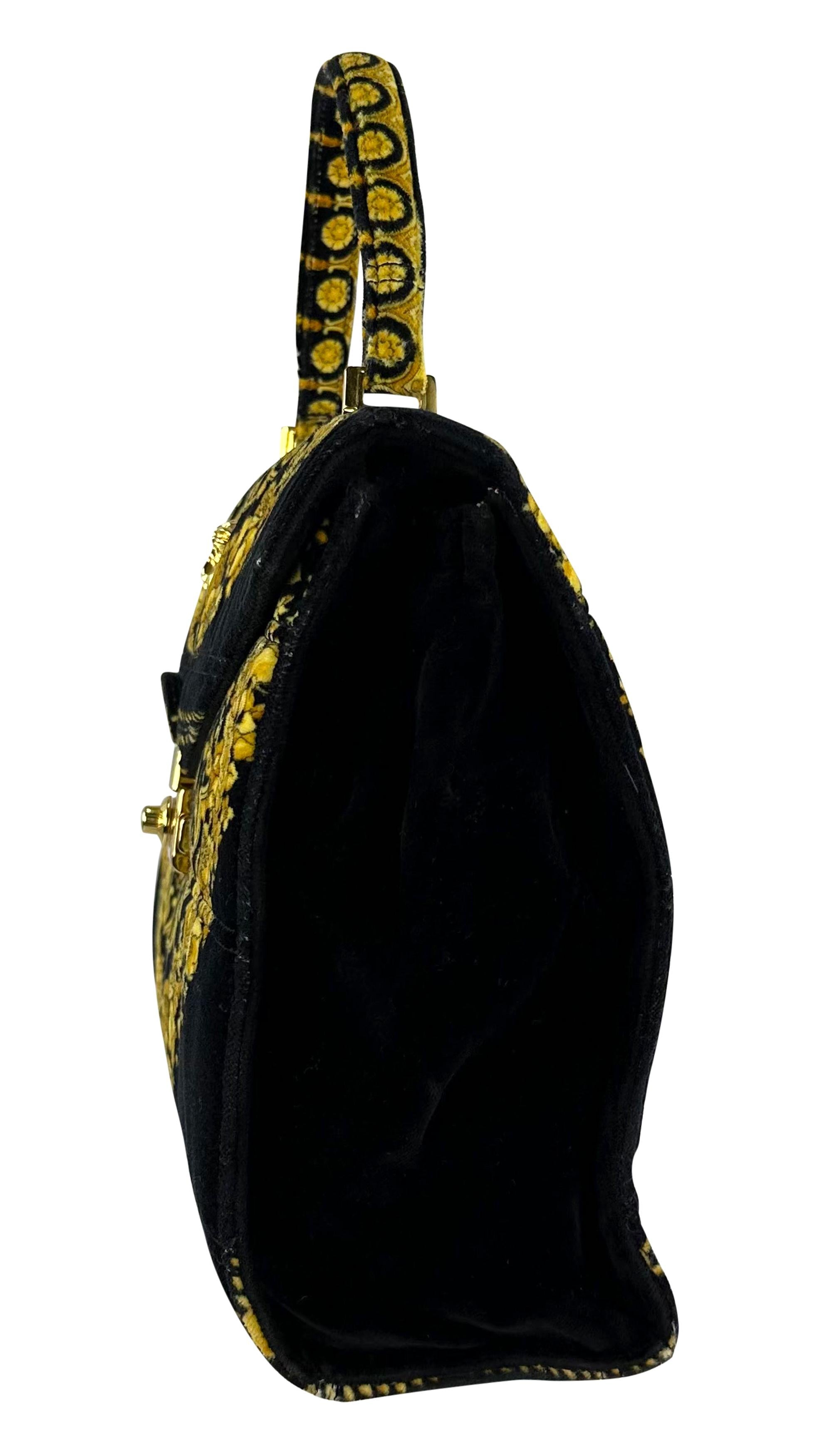 1990s Gianni Versace Gold Baroque Atelier Pattern Black Velvet Top Handle Bag