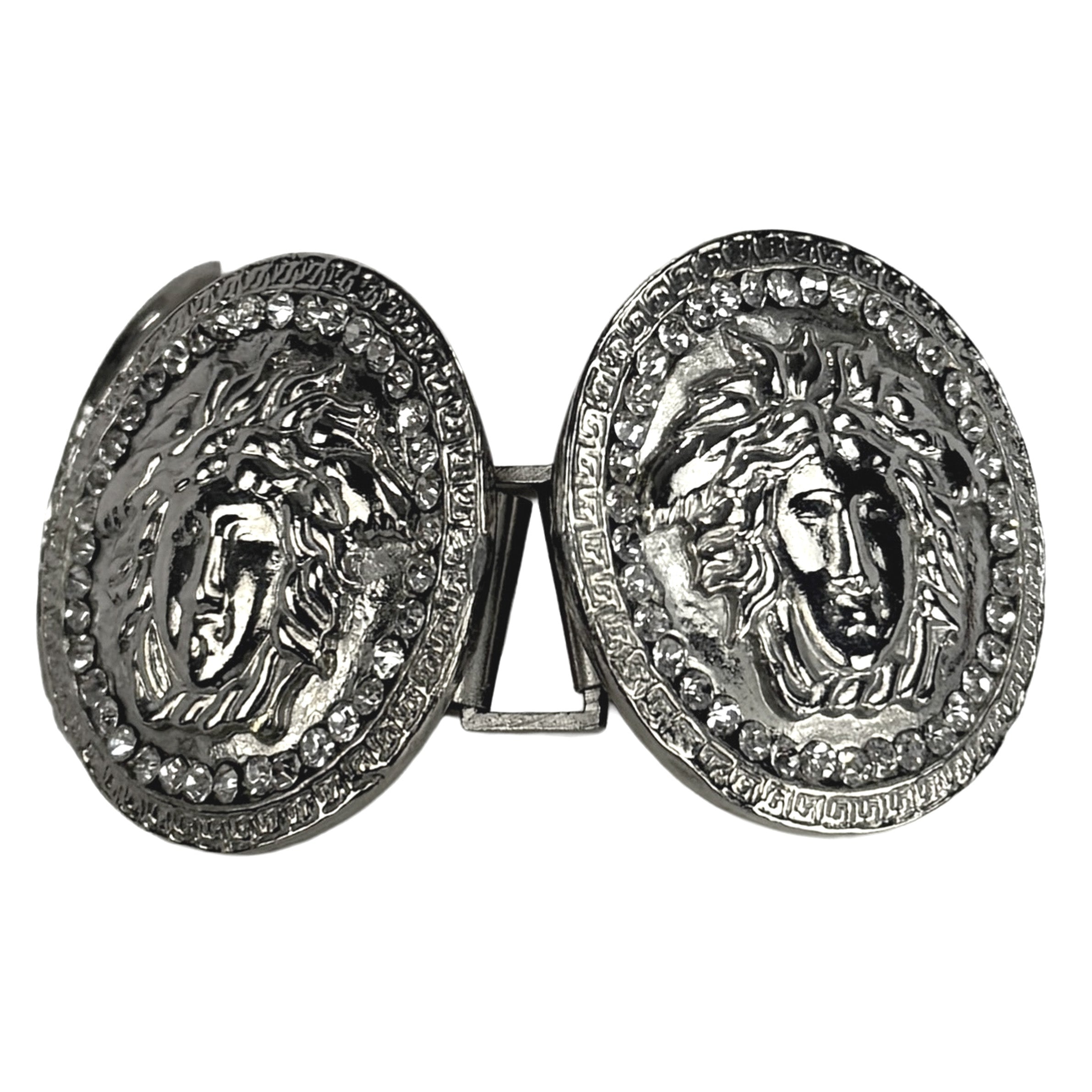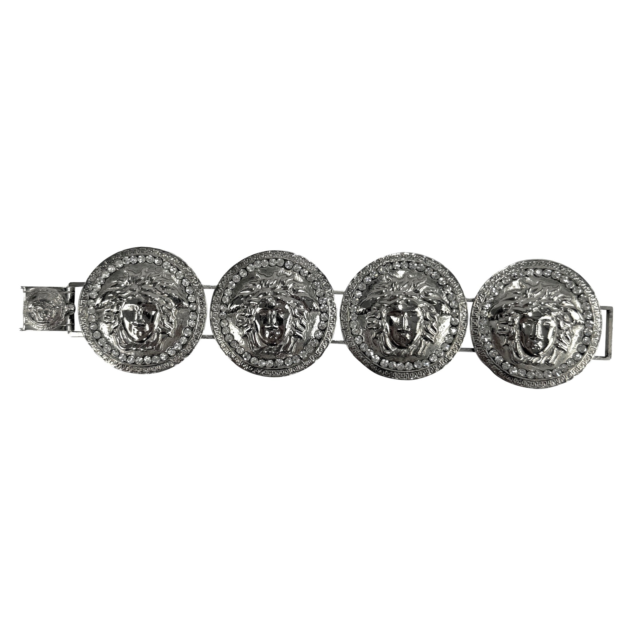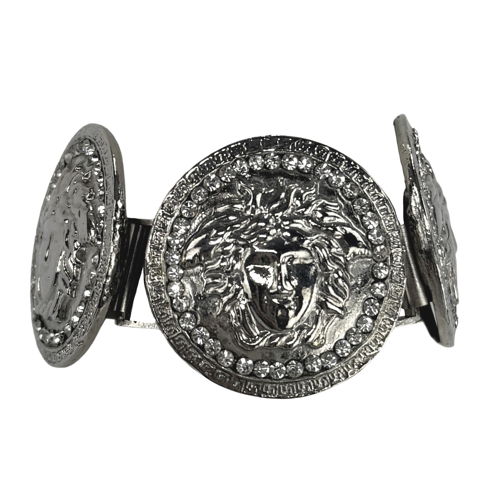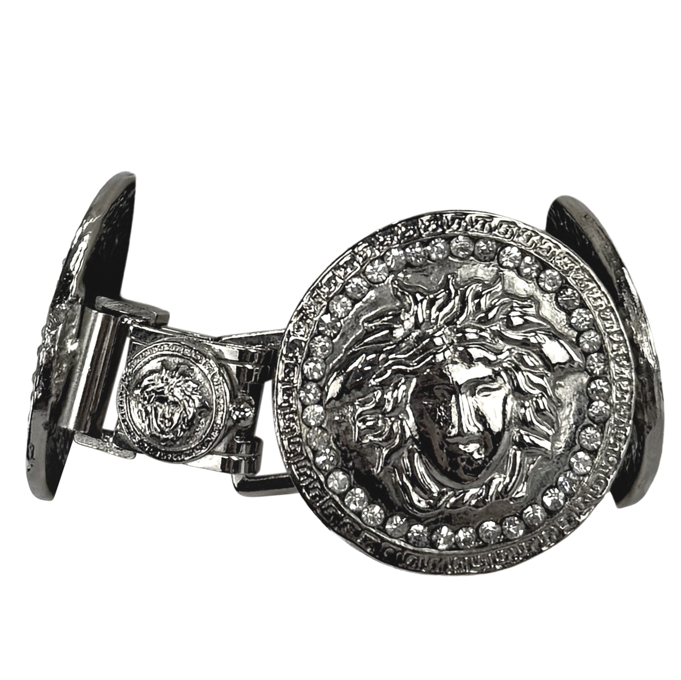 1990s Gianni Versace Rhinestone Medusa Medallion Silvertone Bracelet