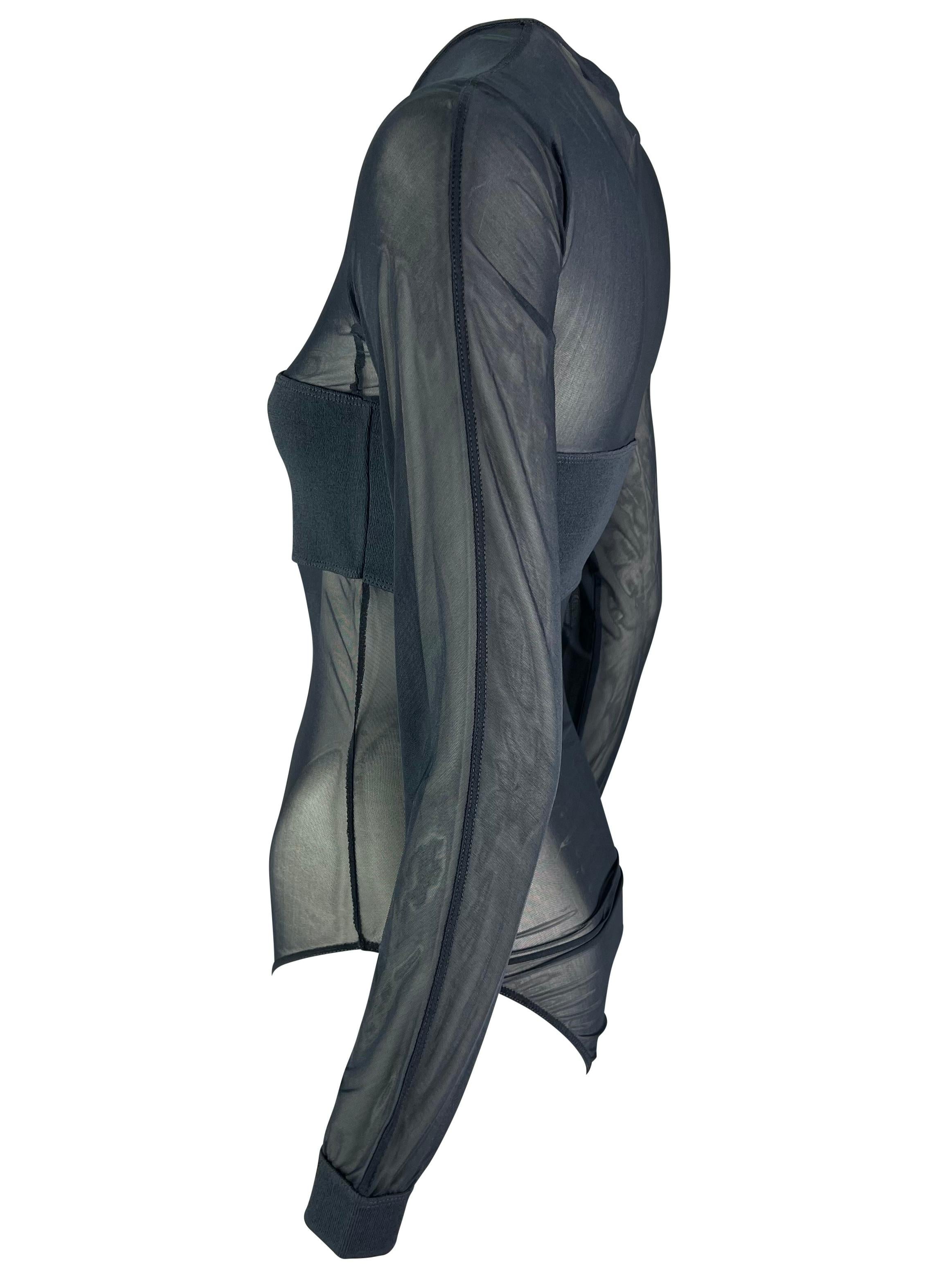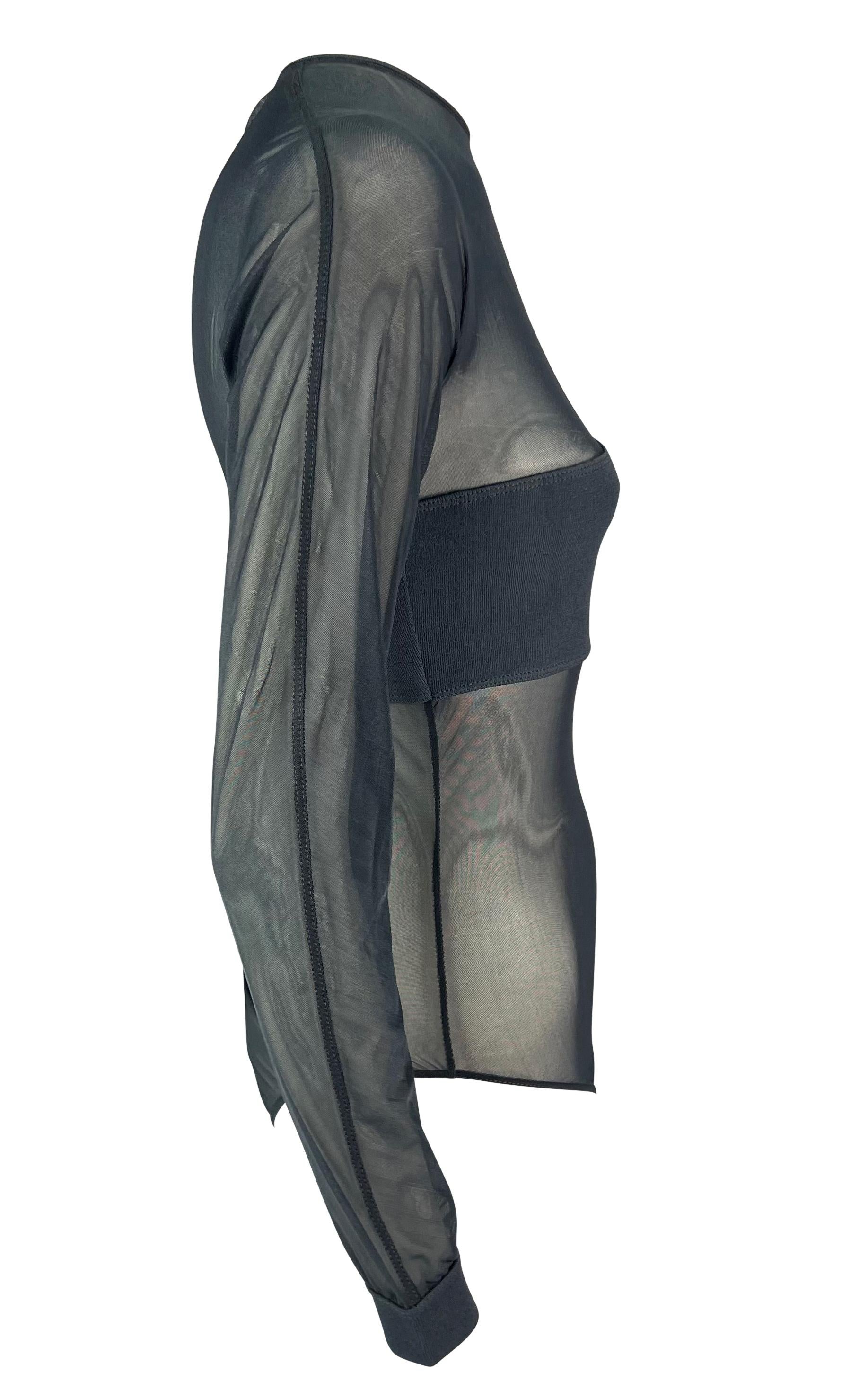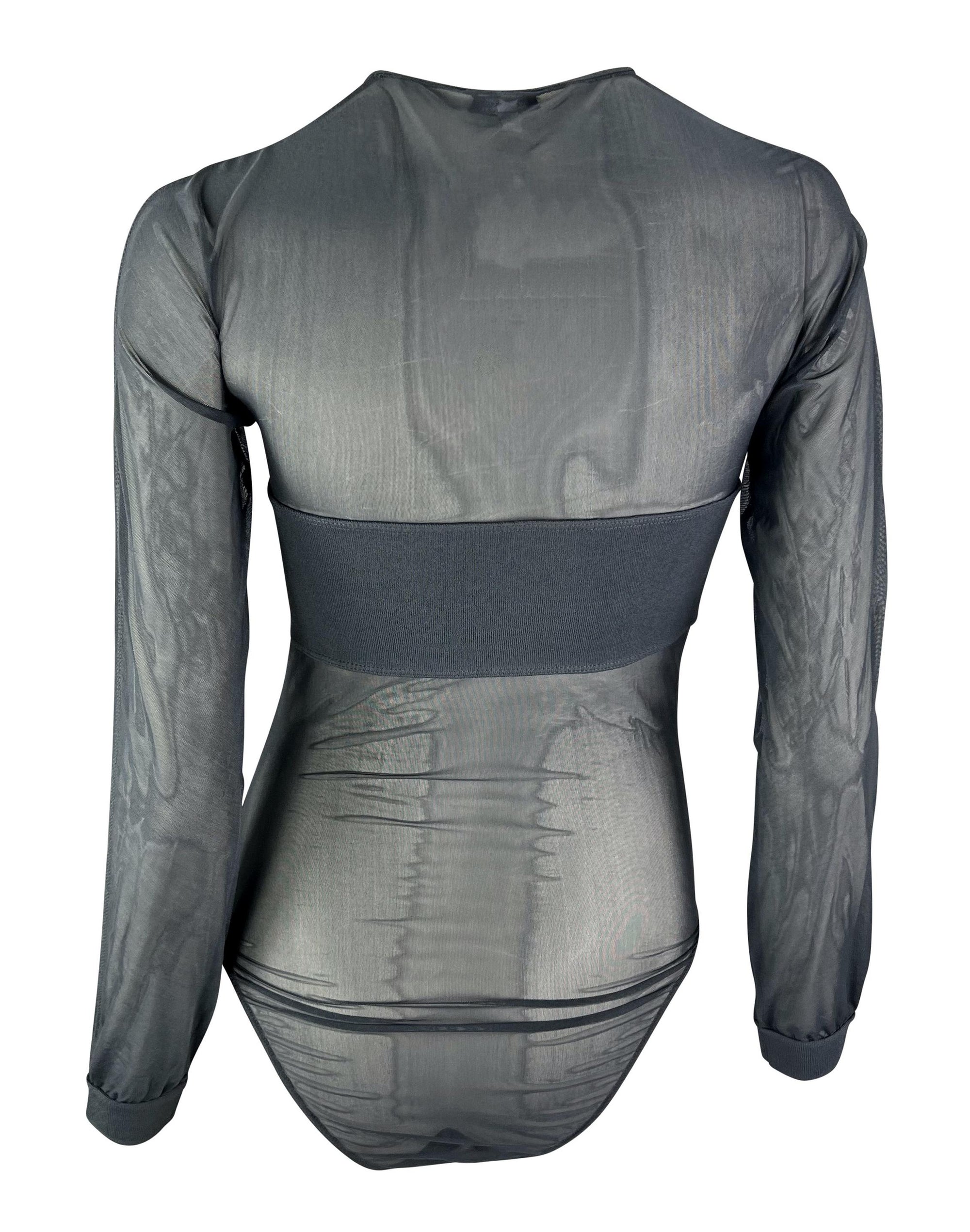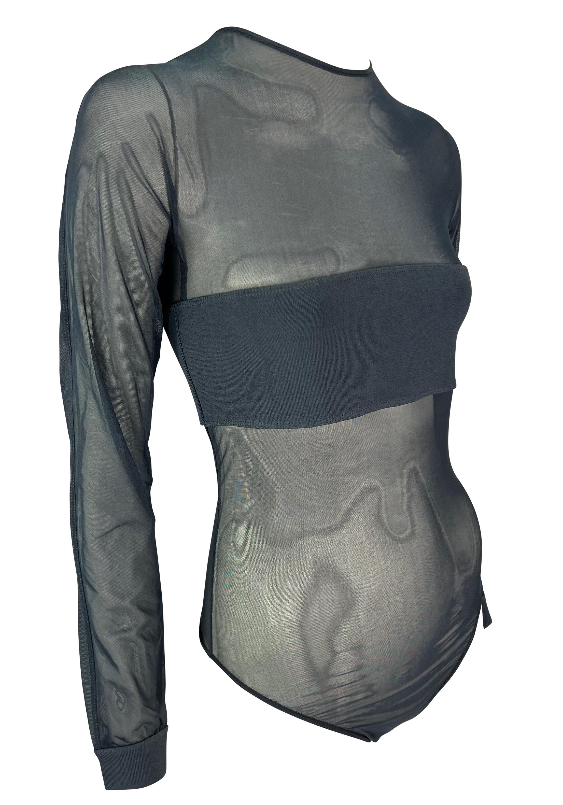 This dark grey sheer long sleeve bodysuit from the 1990s by Giorgio Armani features a sleek, minimalist design. The bodysuit is crafted from a semi-transparent mesh fabric, offering a fitted silhouette with ribbed cuffs and a bandeau-style band across the bust.