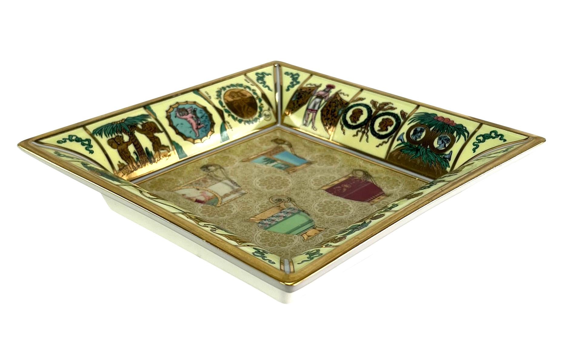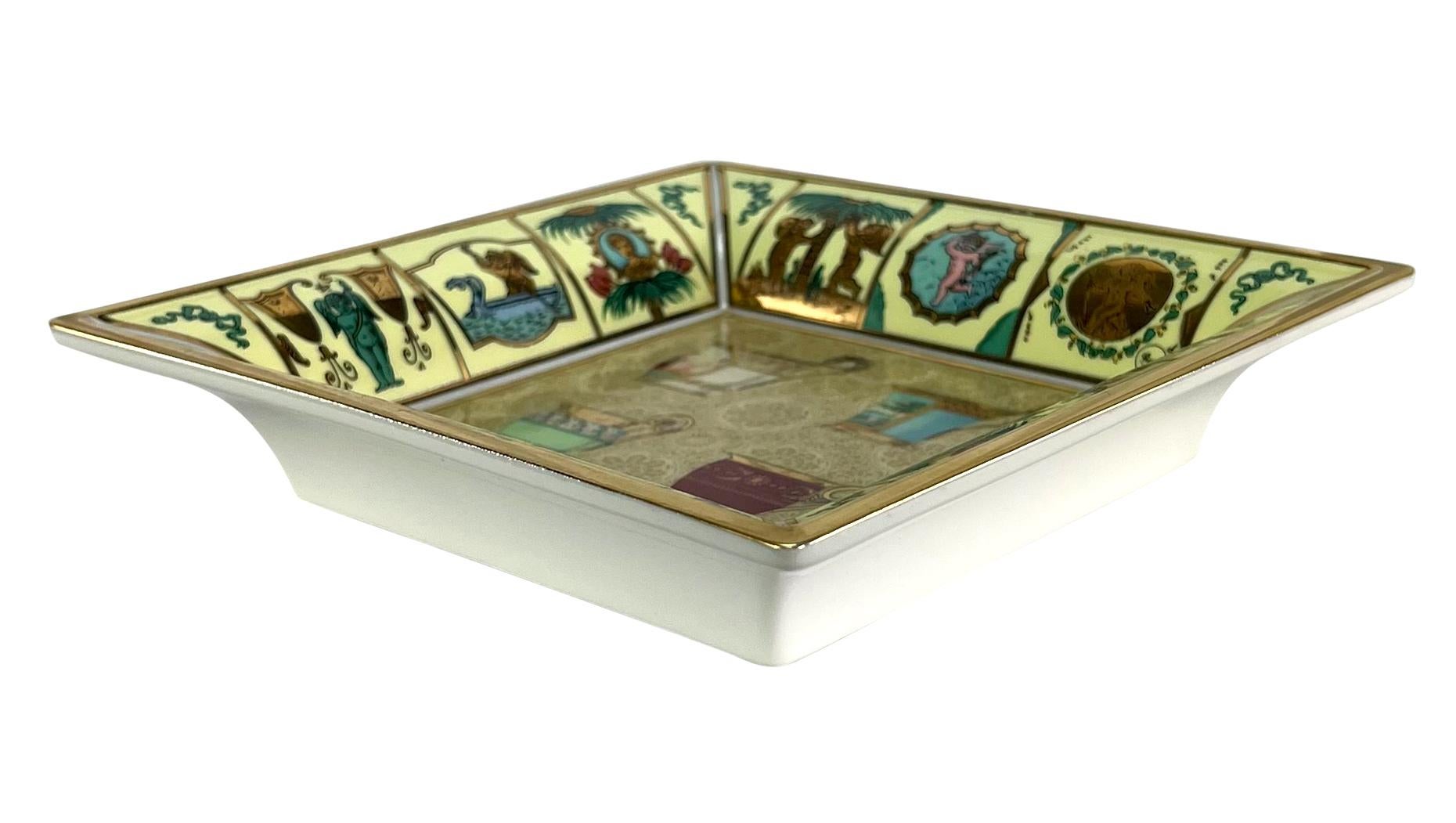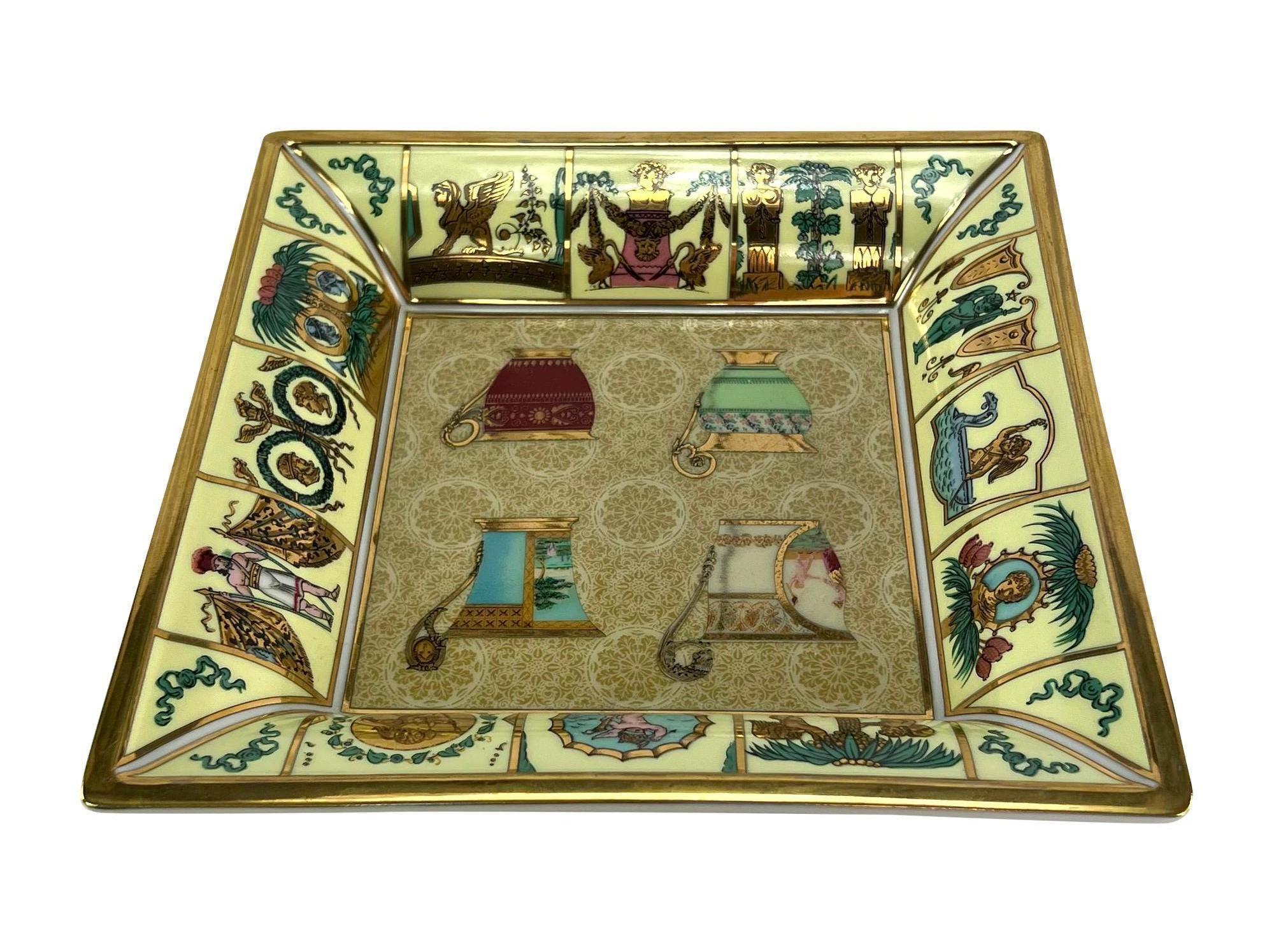 From the 1990s, this glamorous gilded Gucci dish can be a trinket, key, or ashtray. This square tray features gold gilding throughout and boasts a demitasse cup motif.