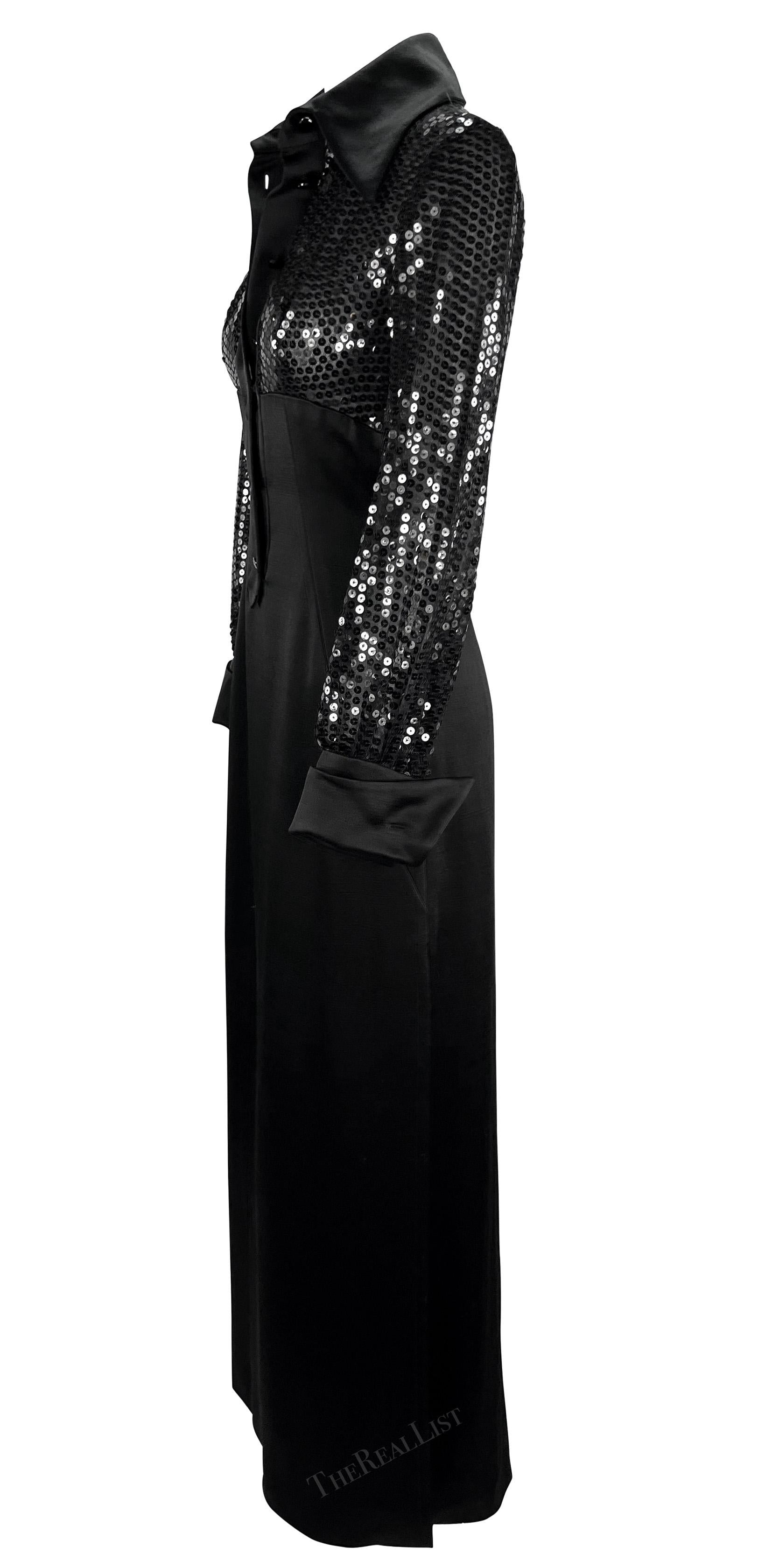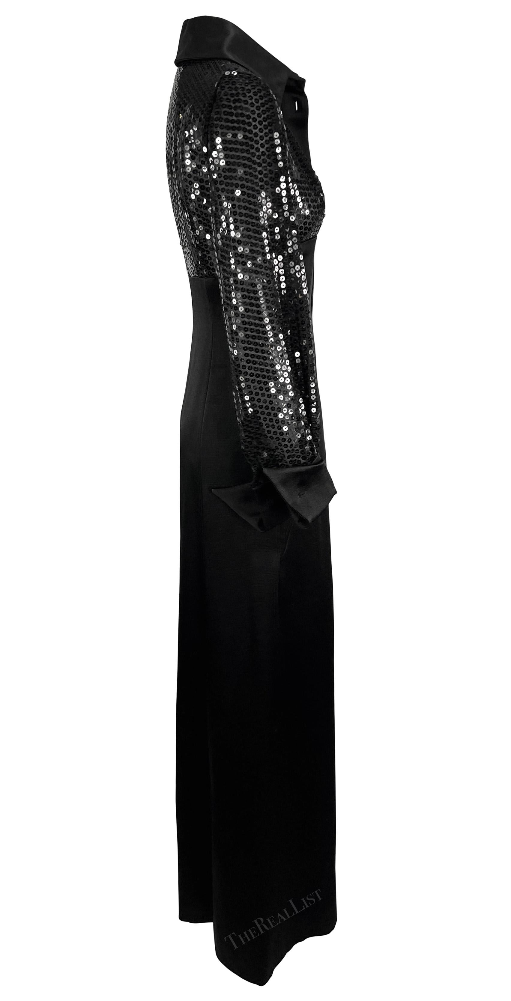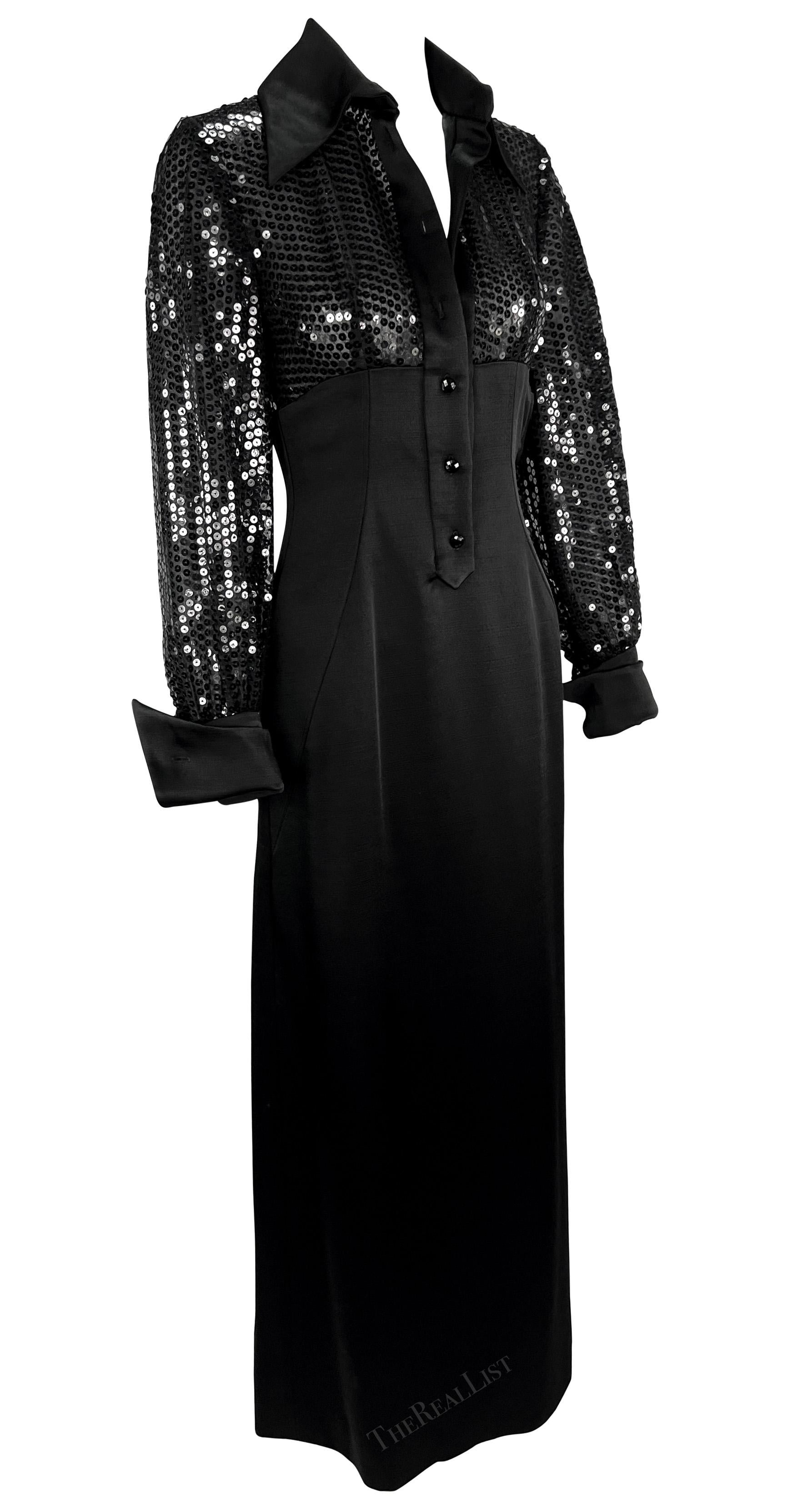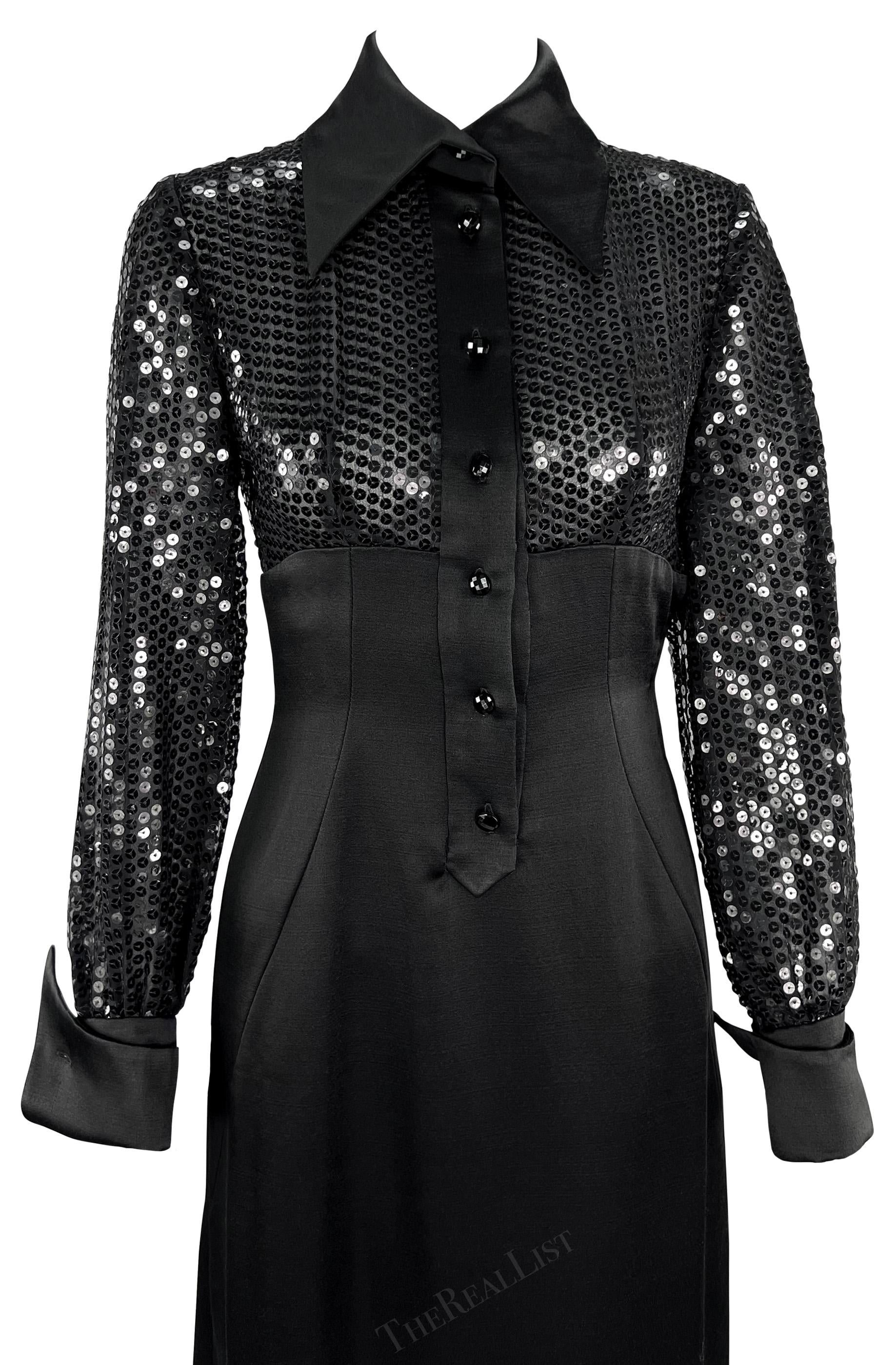 From the 1990s, this gorgeous black satin Jacques Fath collared gown handmade demi-couture gown showcases all the exquisite details of a true haute couture garment. This gown's bust and sleeves are adorned with black sequins, set against a semi-sheer black chiffon fabric. The dress is equipped with a fold-over collar and a front button-down closure that creates a plunging neckline. Its French cuffs, along with the collar, are made from shiny black satin, perfectly matching the body and skirt of the dress. This elegant and timeless gown is the perfect refined yet sexy dress to wear to your next elevated event.