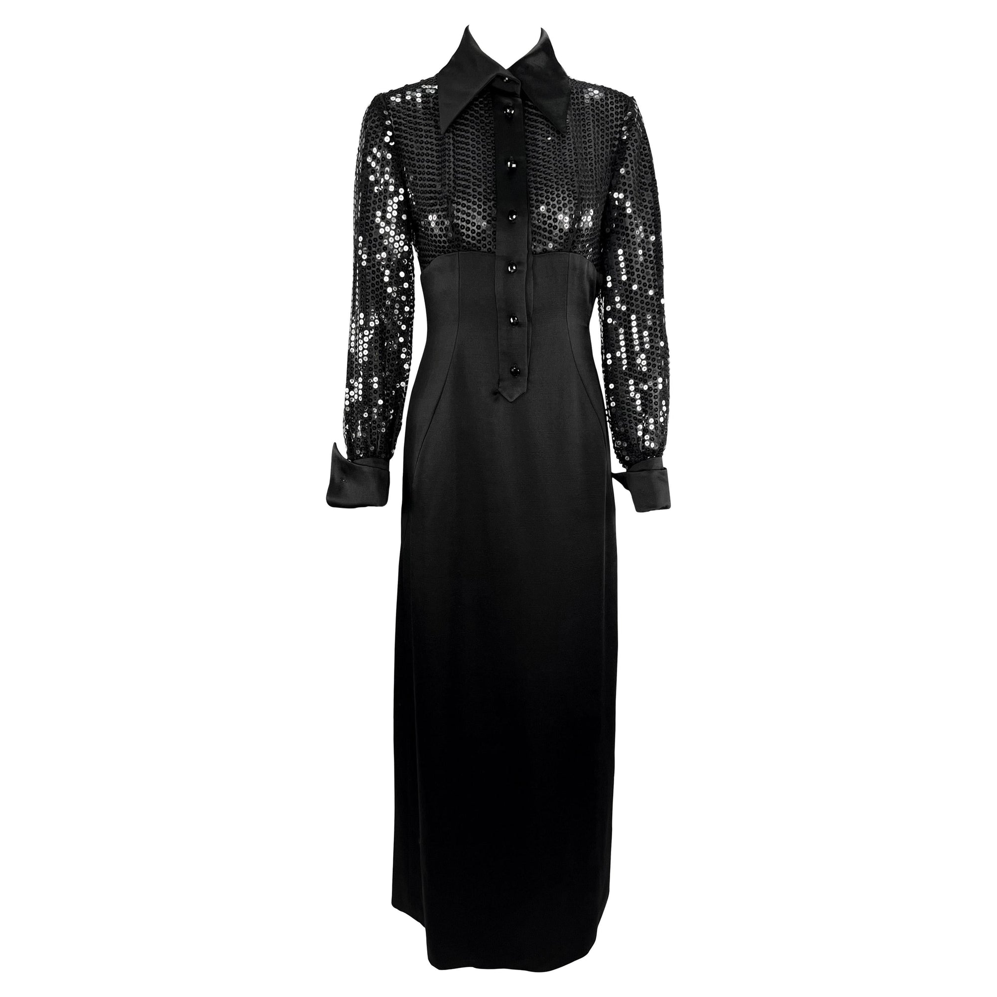 1990s Jacques Fath Sheer Black Sequin Plunging Satin French Cuff Collared Gown