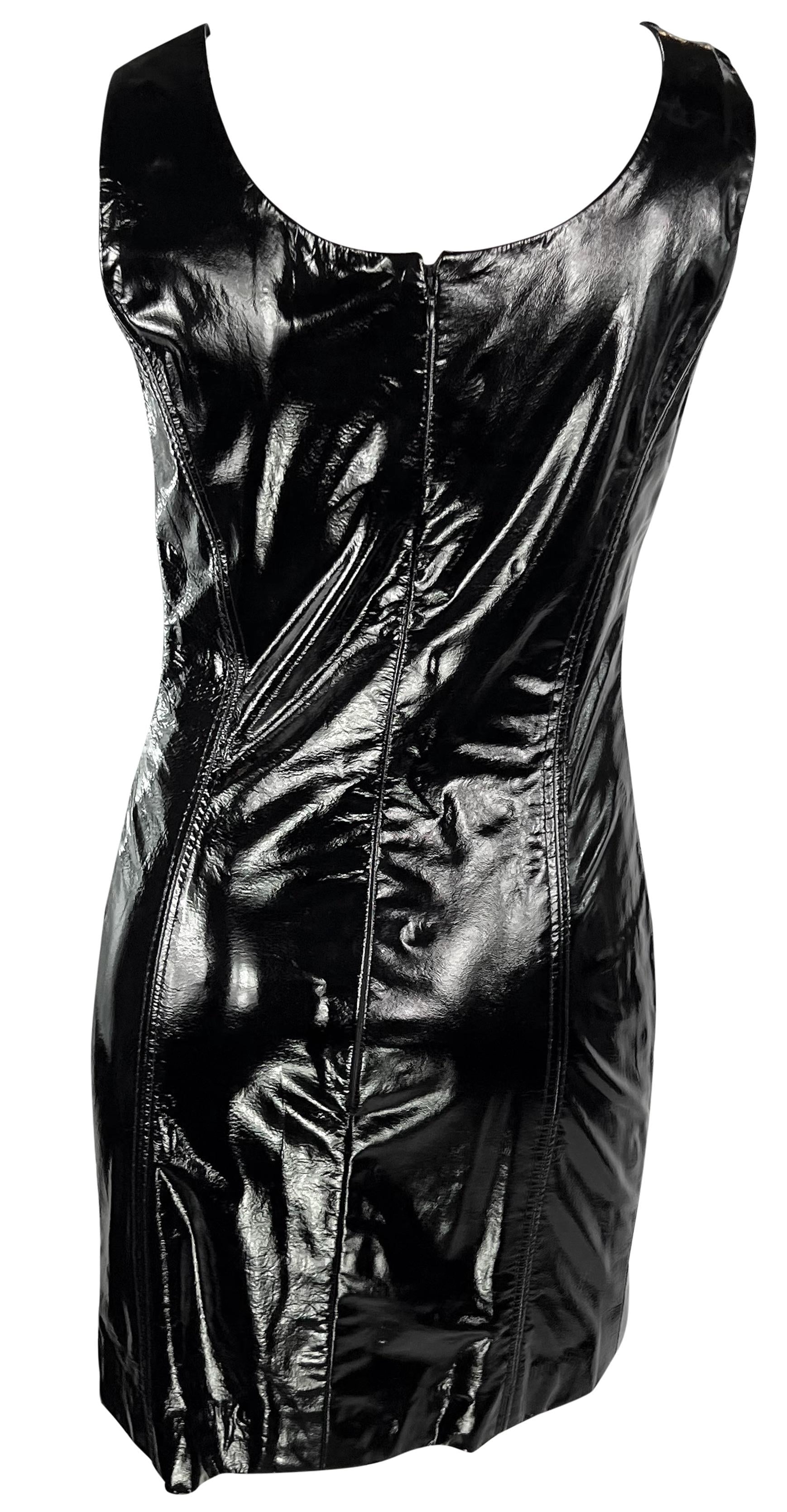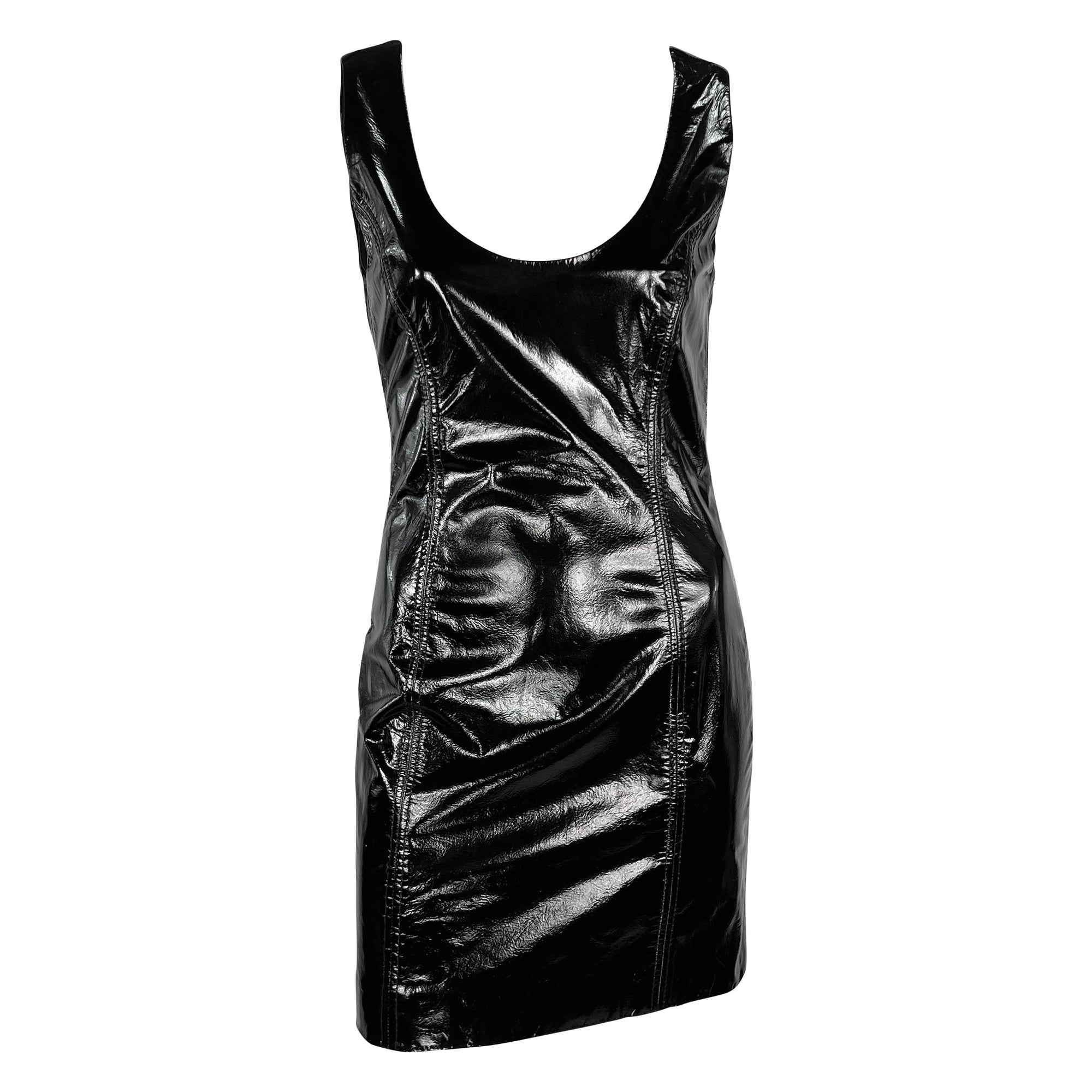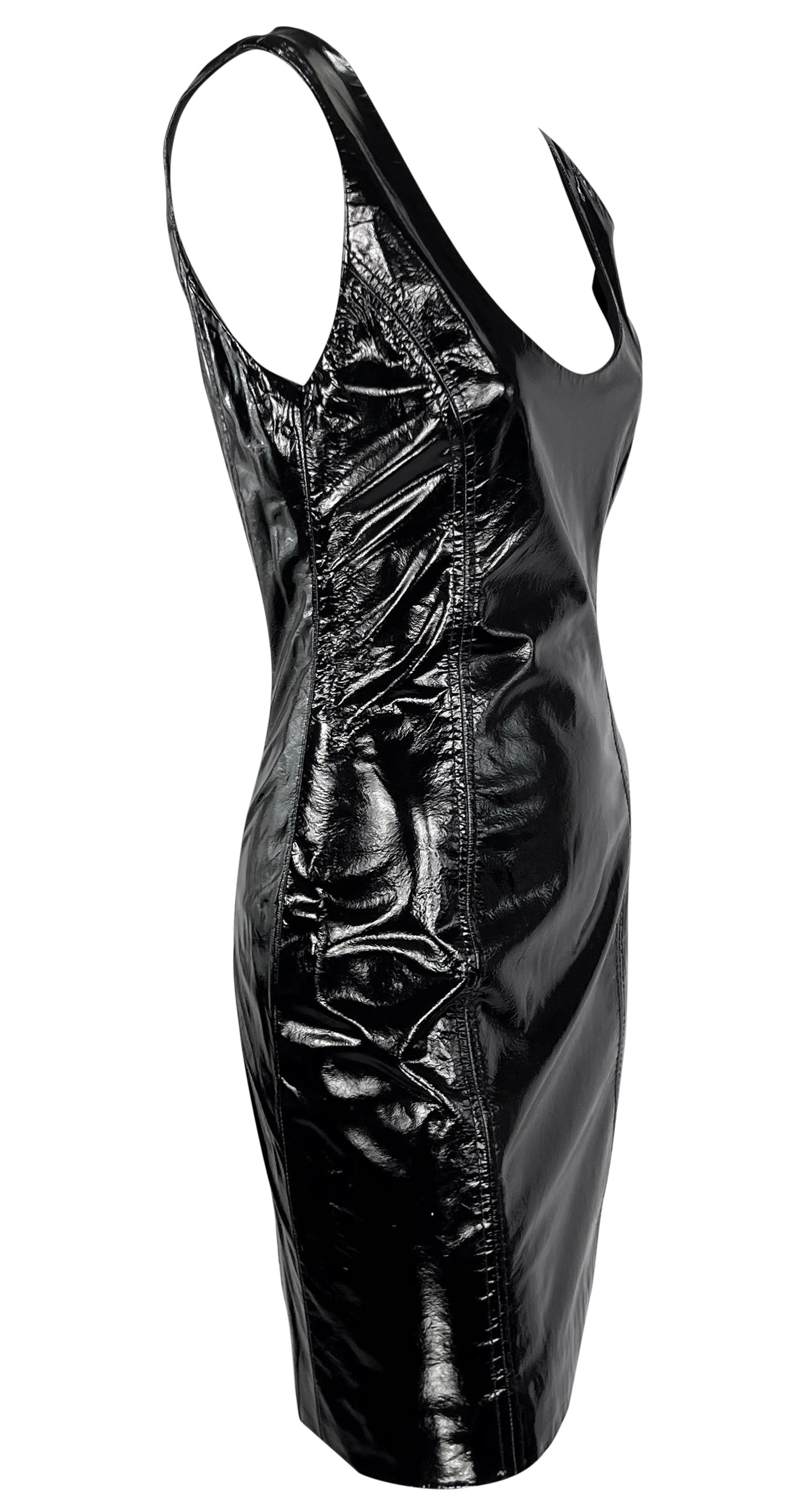 From the 1990s, this black patent leather Galanos mini dress is the perfect sexy LBD. Constructed entirely of black patent leather, this fitted mini dress features wide shoulder straps and a scoop necklace.