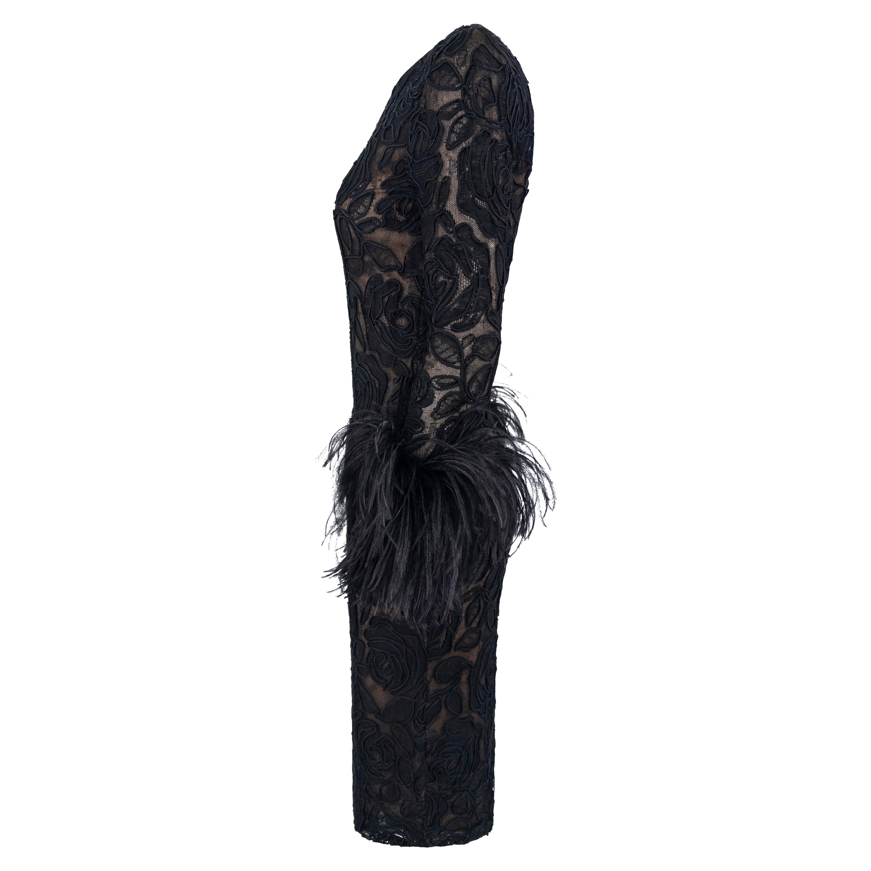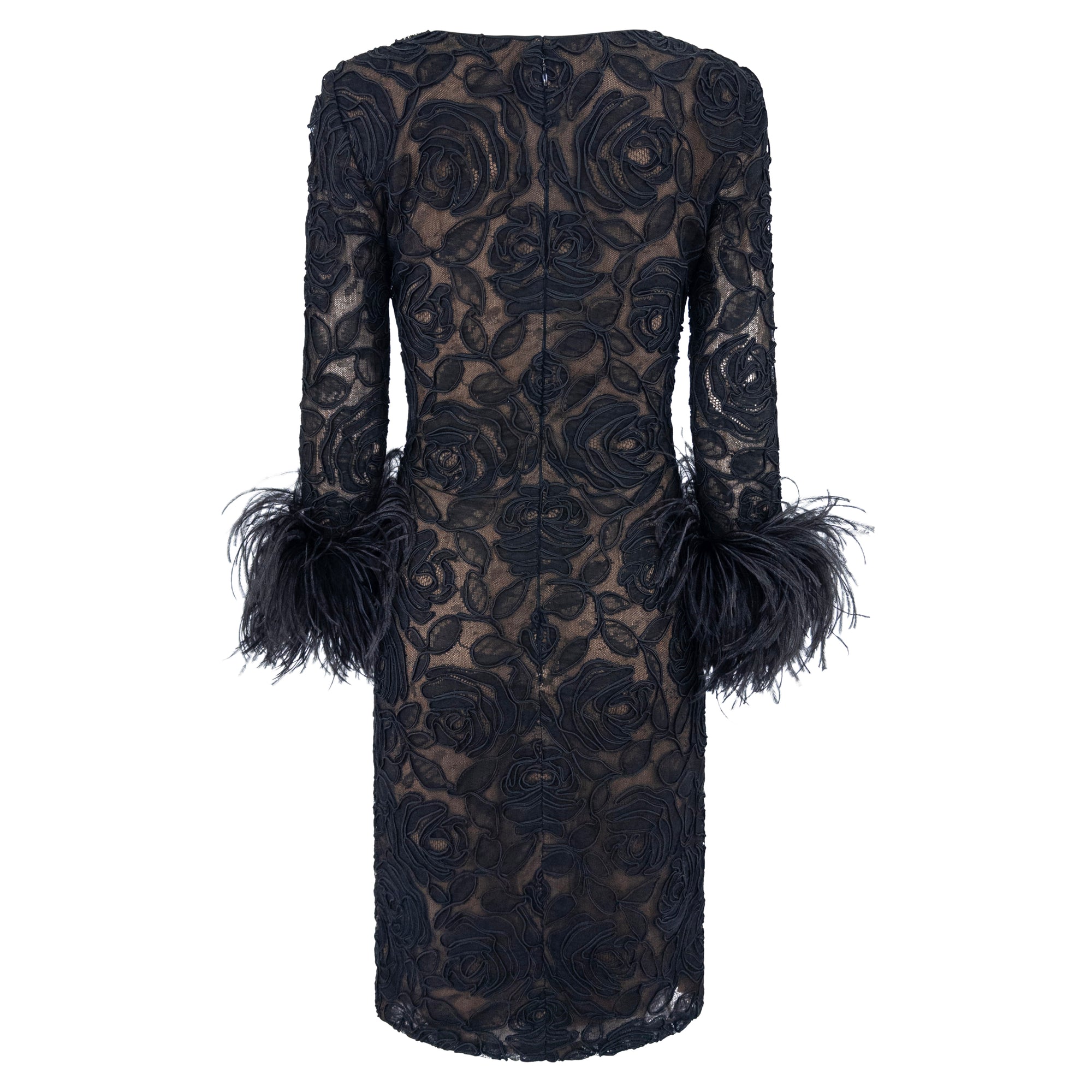 1990s Oscar de la Renta Black Lace Marabou Ostrich Feather Cuff Dress