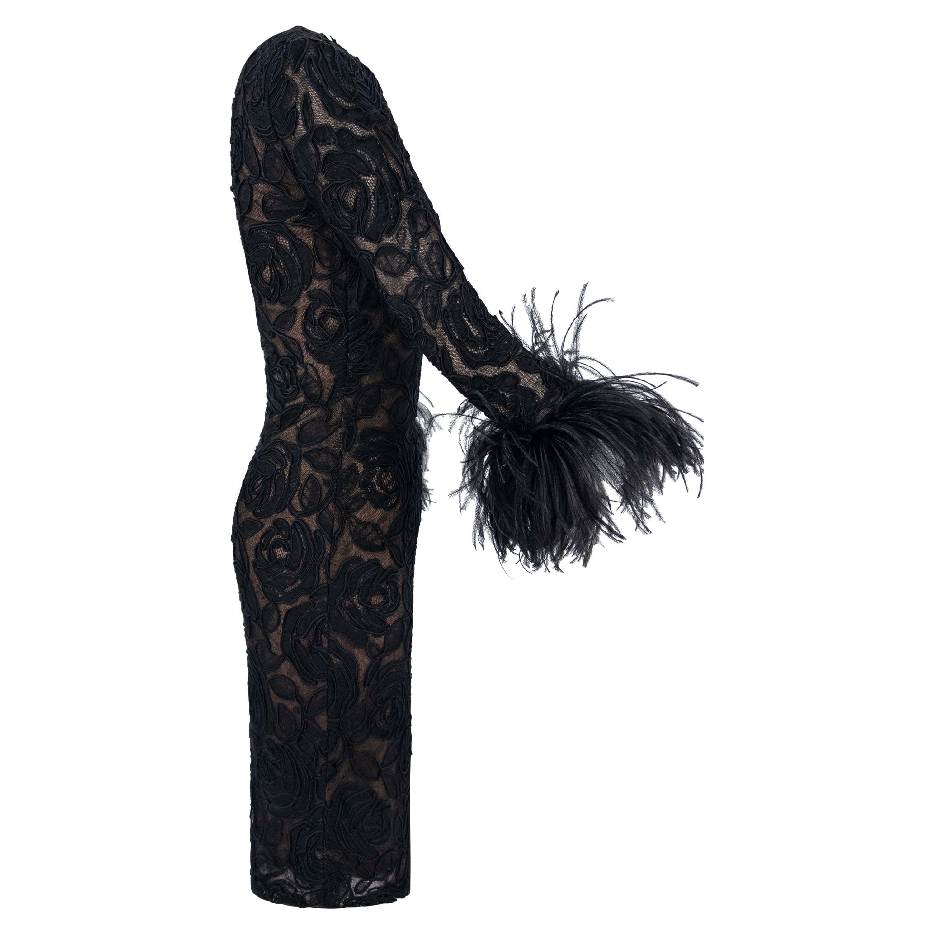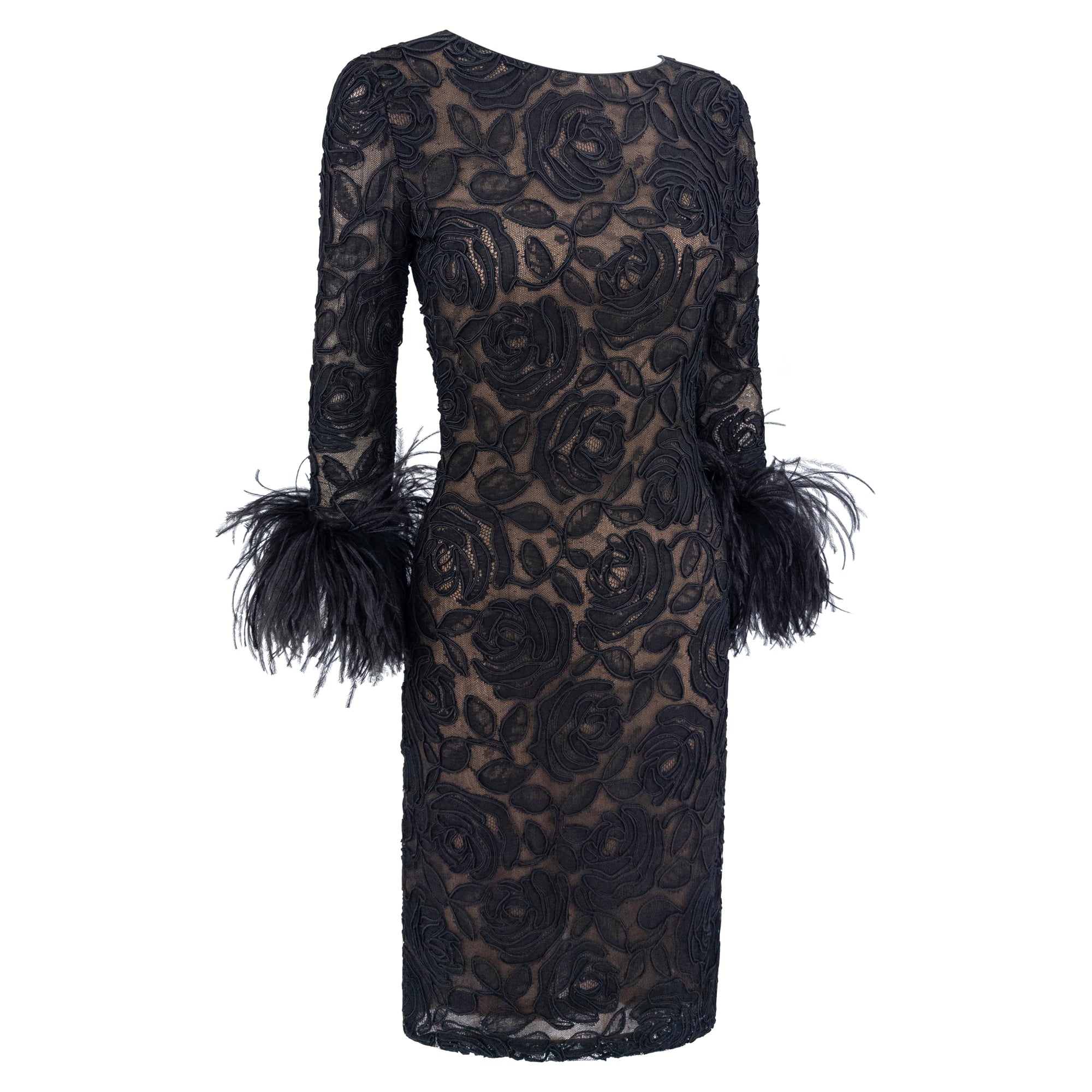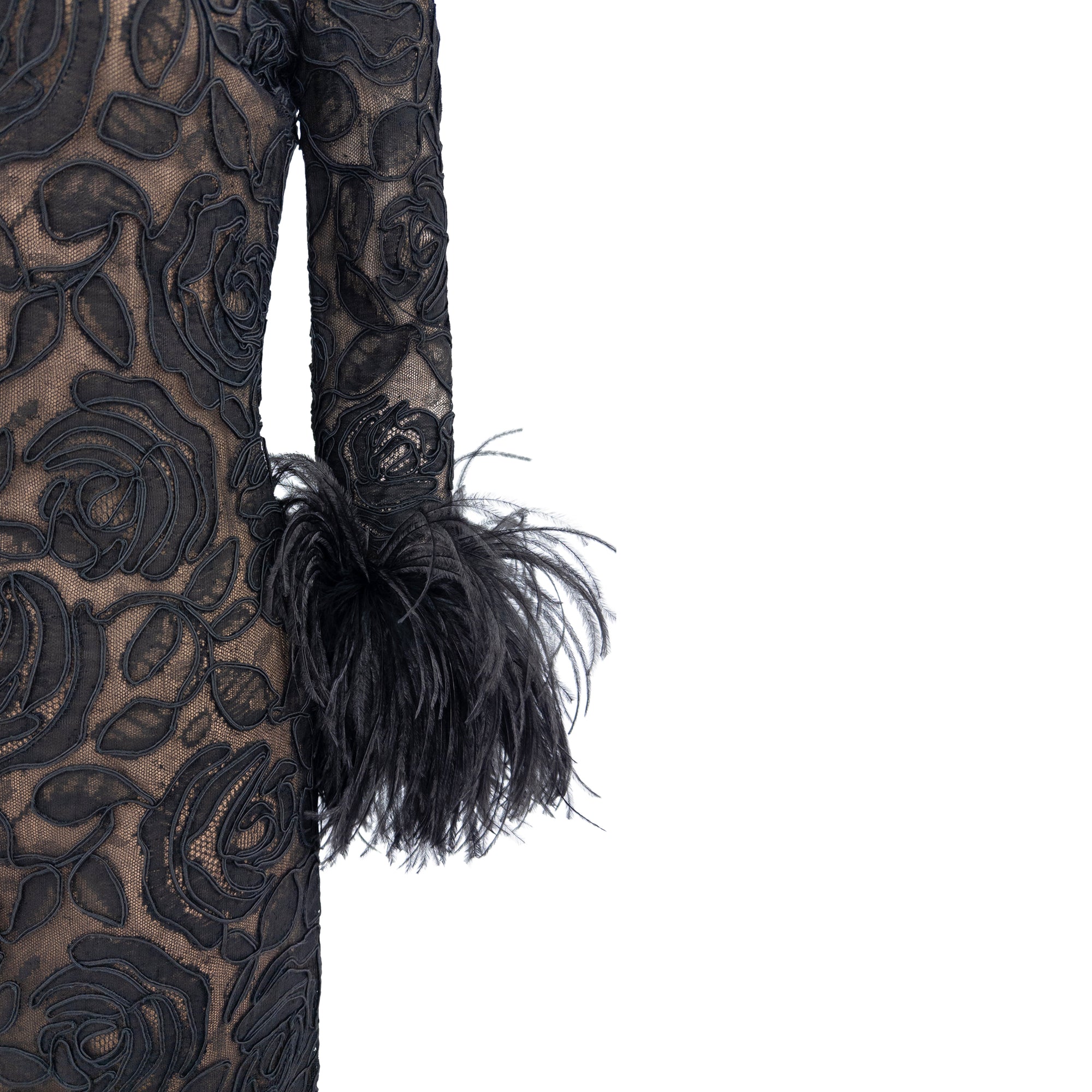 This Oscar de la Renta cocktail dress from the 1990s is crafted from sheer black lace with an intricate rose motif layered over a nude underlay, creating a striking play of texture and transparency. The fitted silhouette is finished with dramatic marabou ostrich feather cuffs at the wrists.
