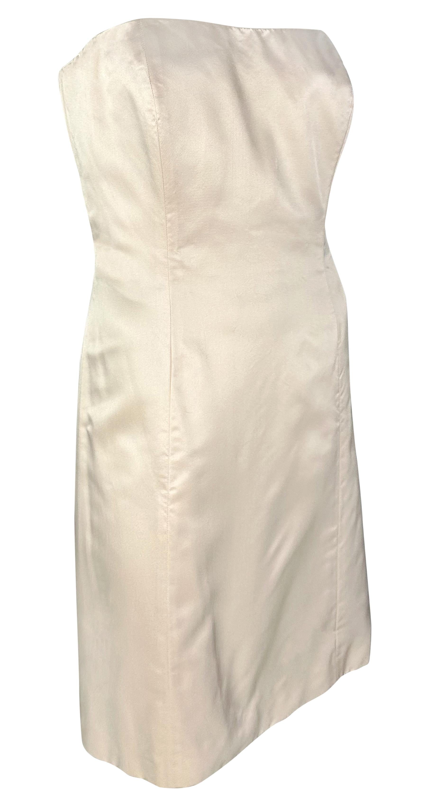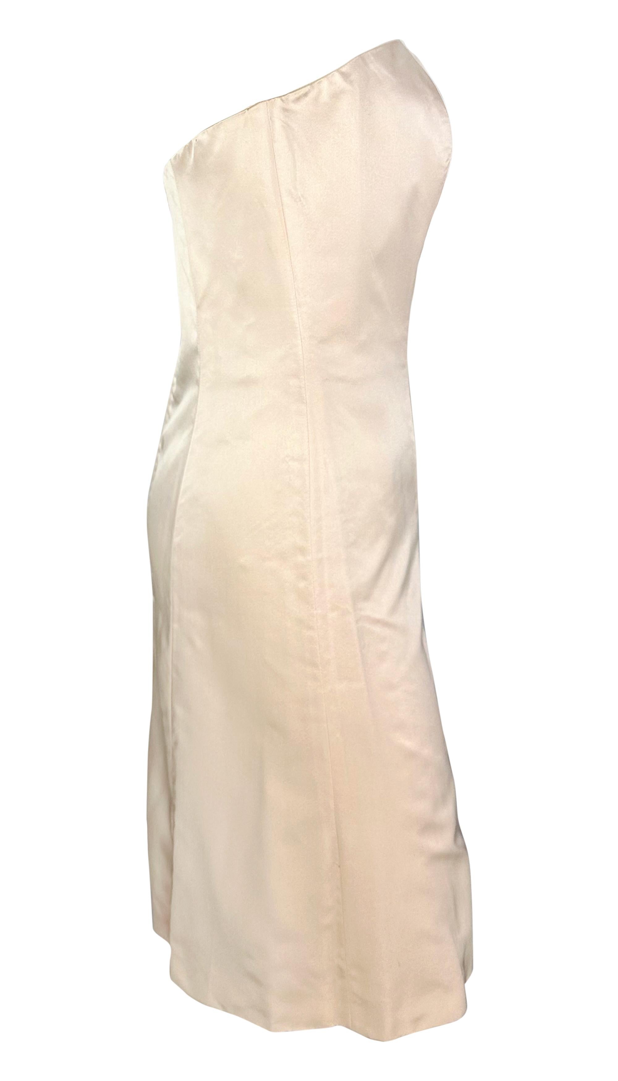 This 1990s Oscar de la Renta strapless mini dress is crafted in pastel pink with a classic flare silhouette. The dress features a structured bodice and an A-line skirt, offering a simple yet elegant design.