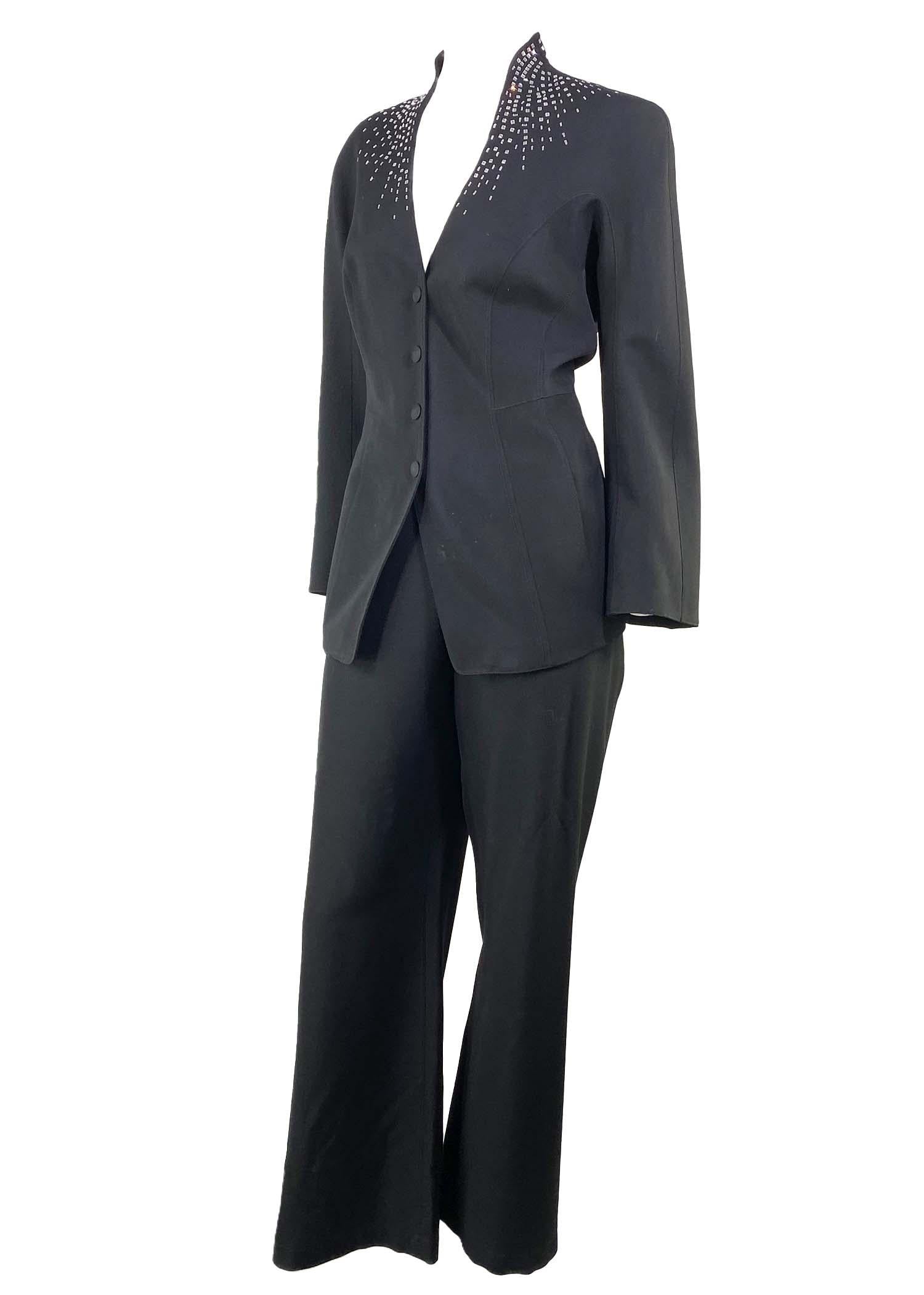 Presenting a rhinestone Thierry Mugler pantsuit designed by Manfred Mugler. From the 1990s, this suit features masterful design and tailoring. The blazer features a stand-up collar, snap closures, and rhinestones around the neck and nape of the jacket. The pants and blazer are constructed of wool and are the perfect example of Mugler's iconic figural and exaggerated designs.