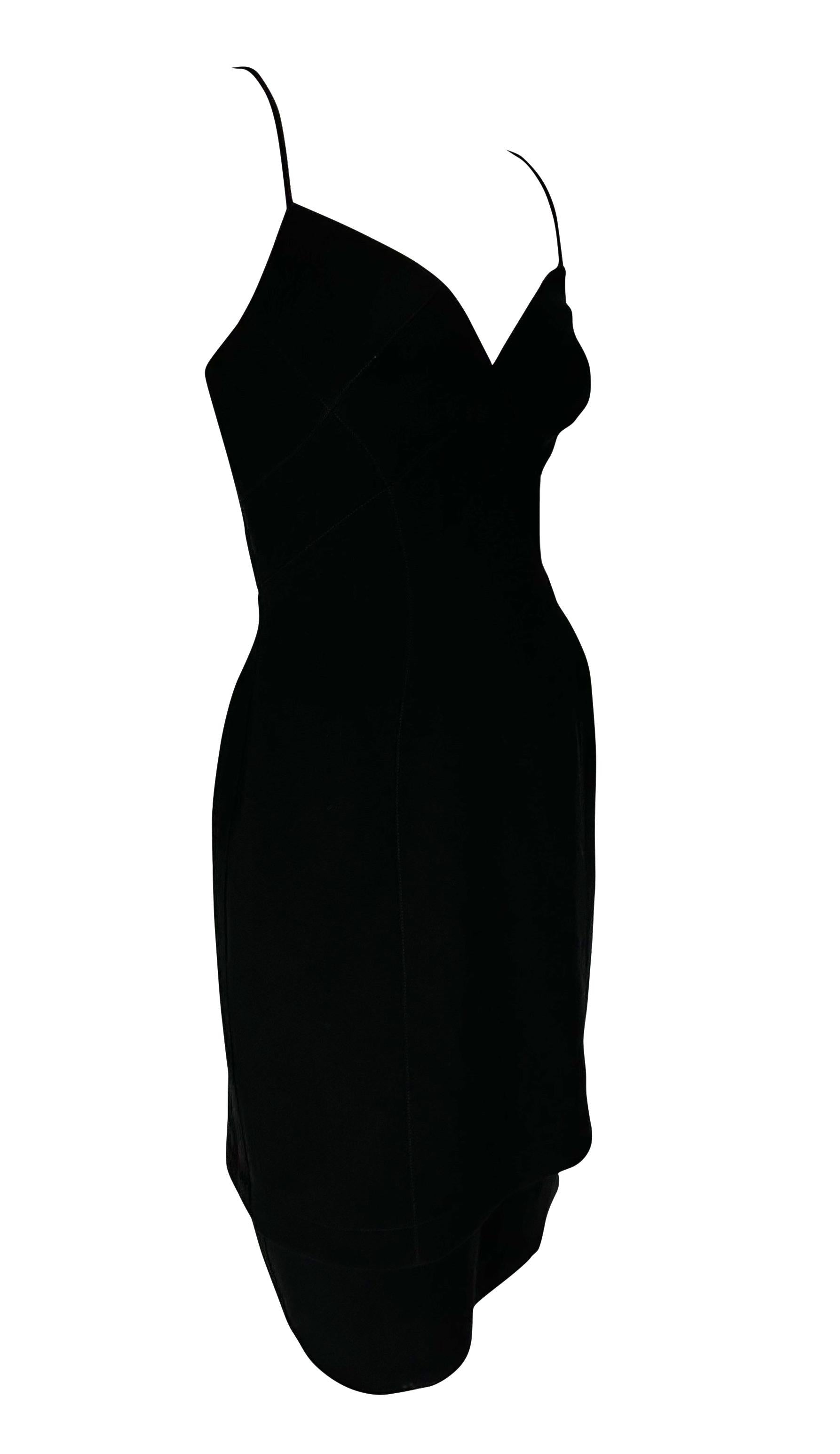 Presenting a beautiful black Thierry Mugler cocktail dress designed by Manfred Mugler. This simple and oh-so-sexy dress features a sweetheart neckline, spaghetti straps, and a layered hem. The perfect little Thierry Mugler black dress, this effortlessly chic and timeless piece is the perfect addition to any wardrobe.