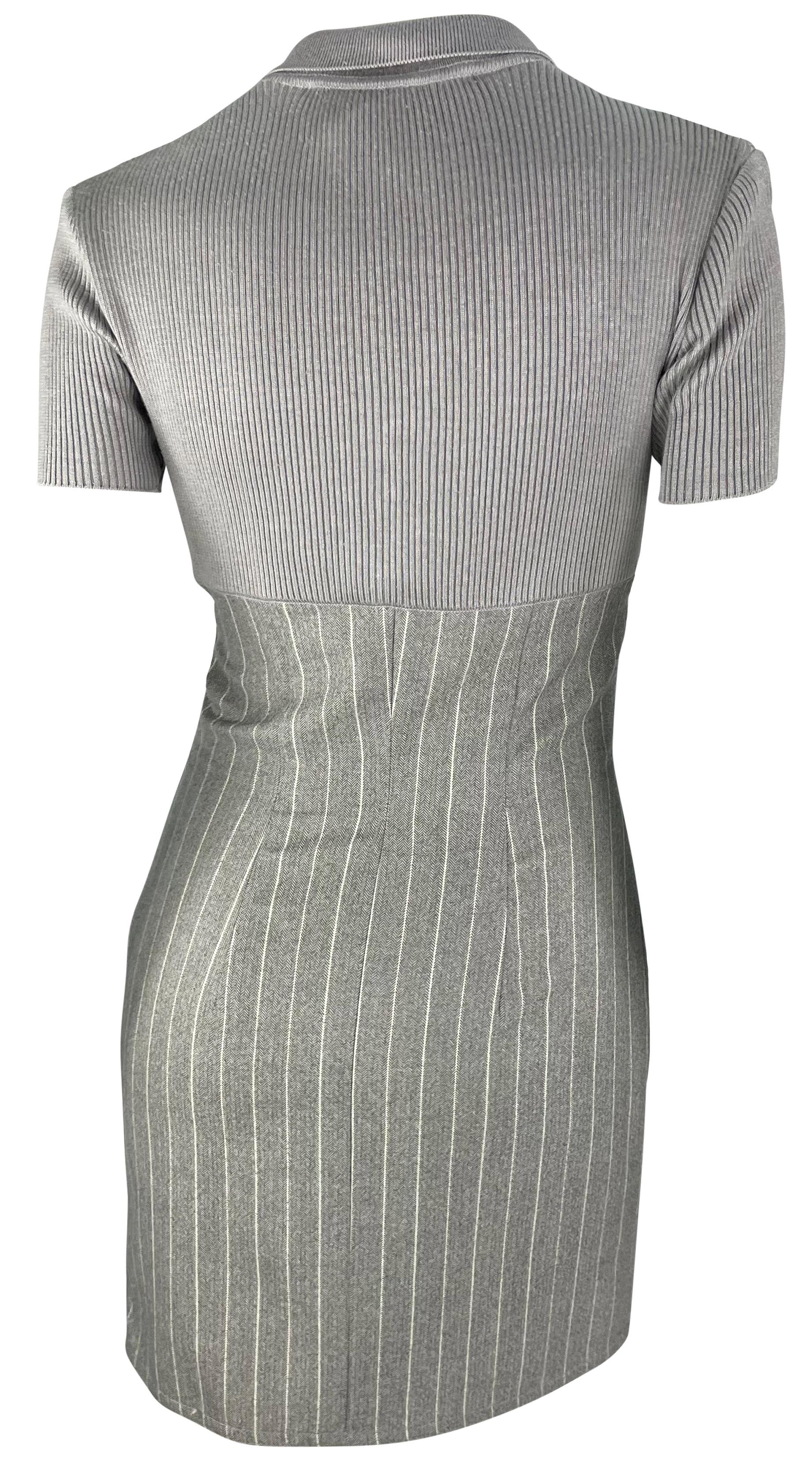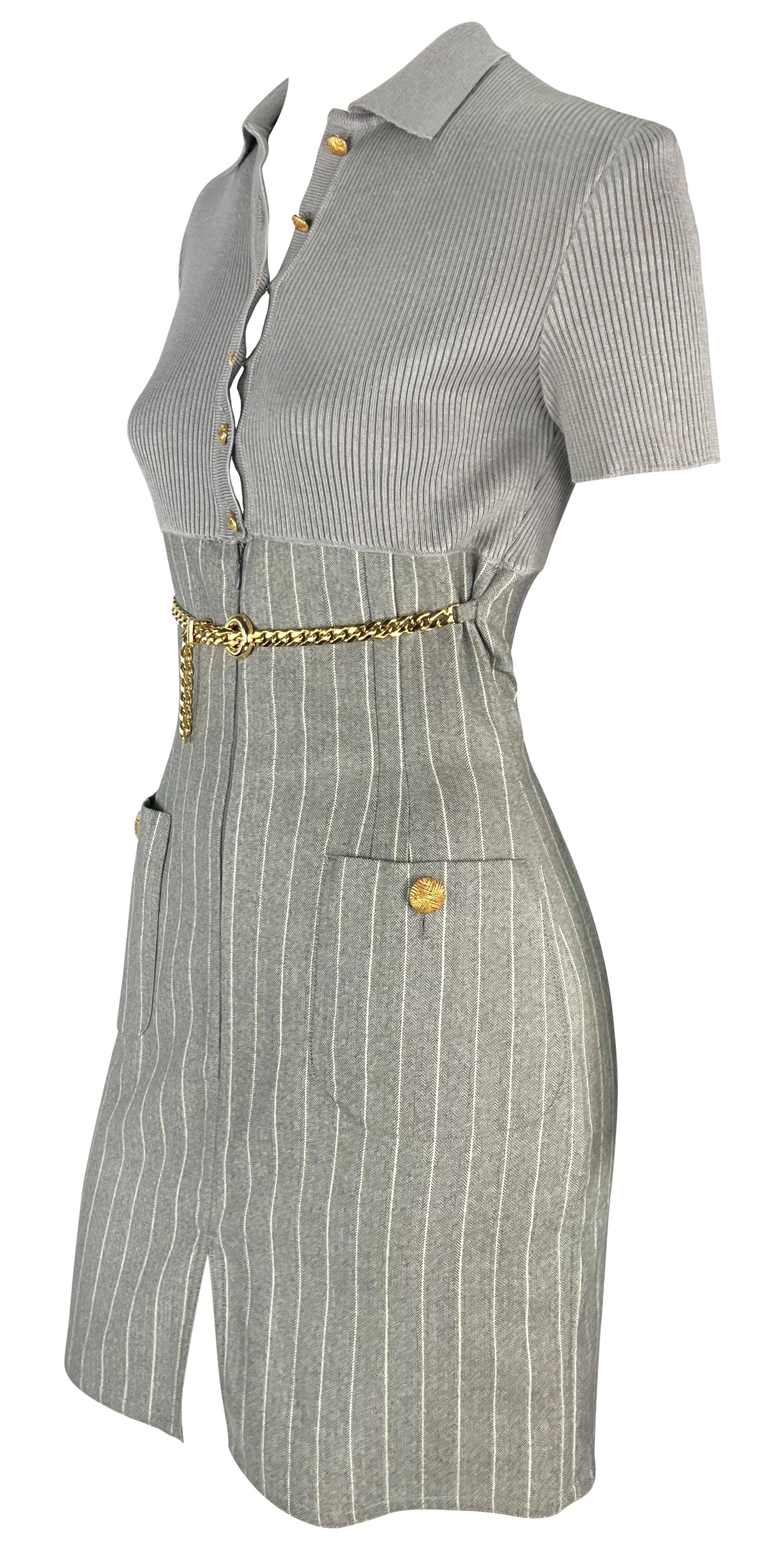 1990s Valentino Garavani Grey Pinstripe Knit Gold Chain Belt Mini Dress