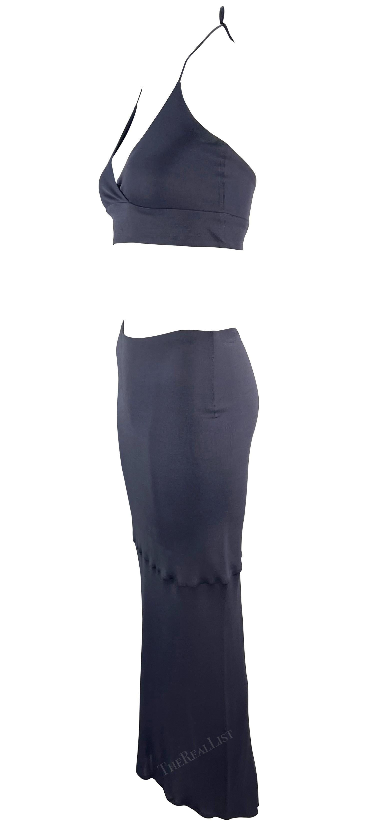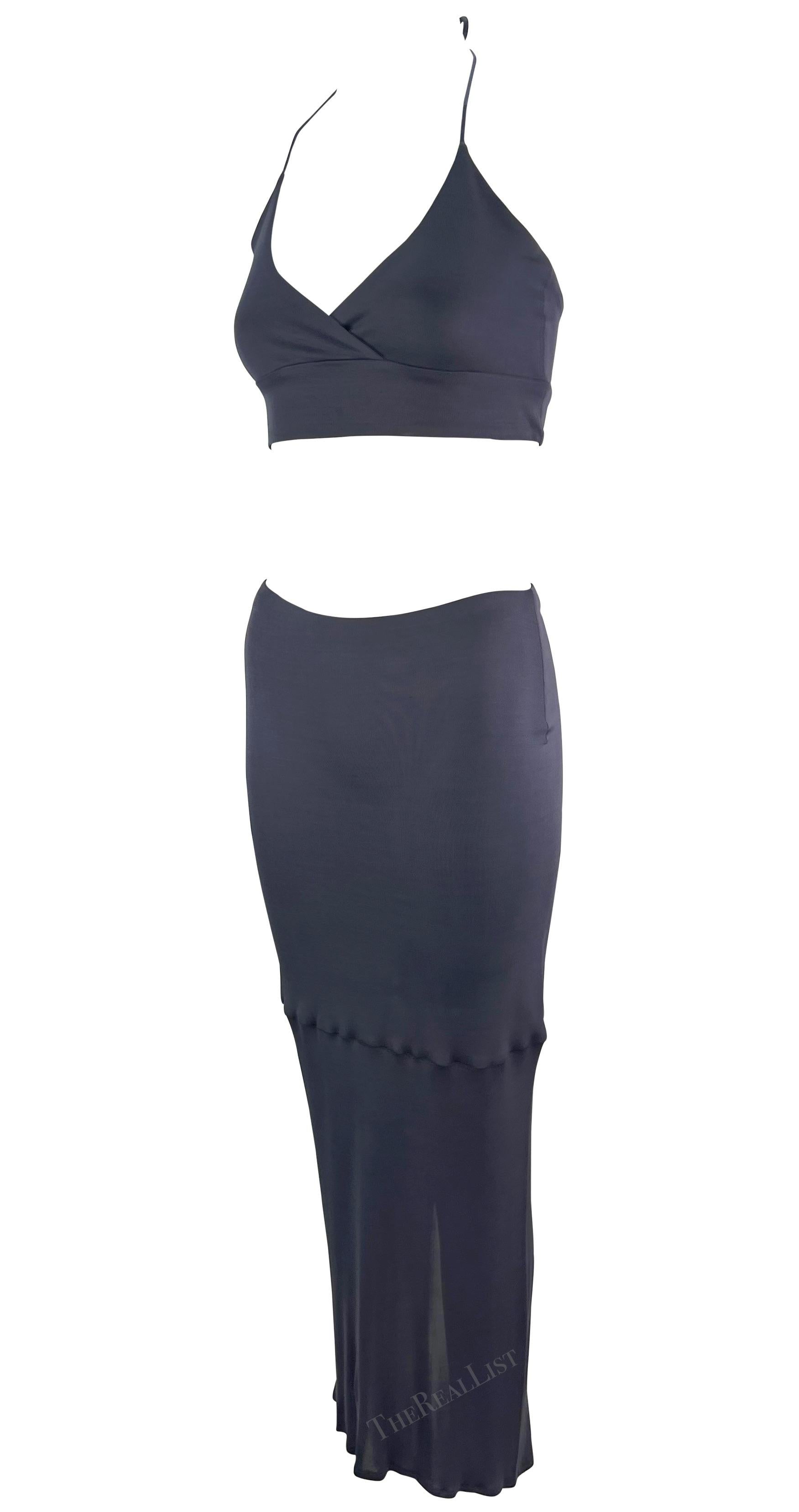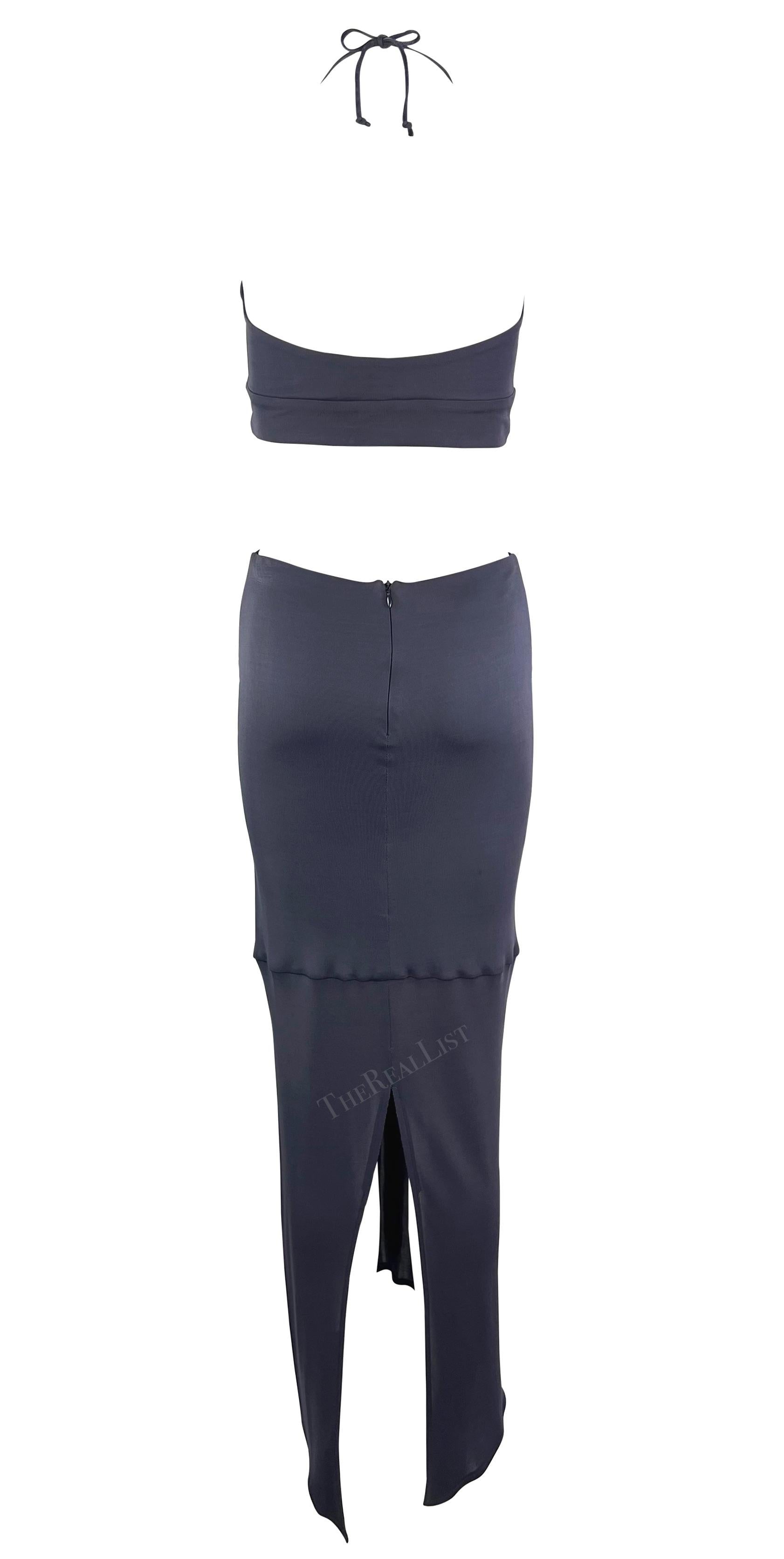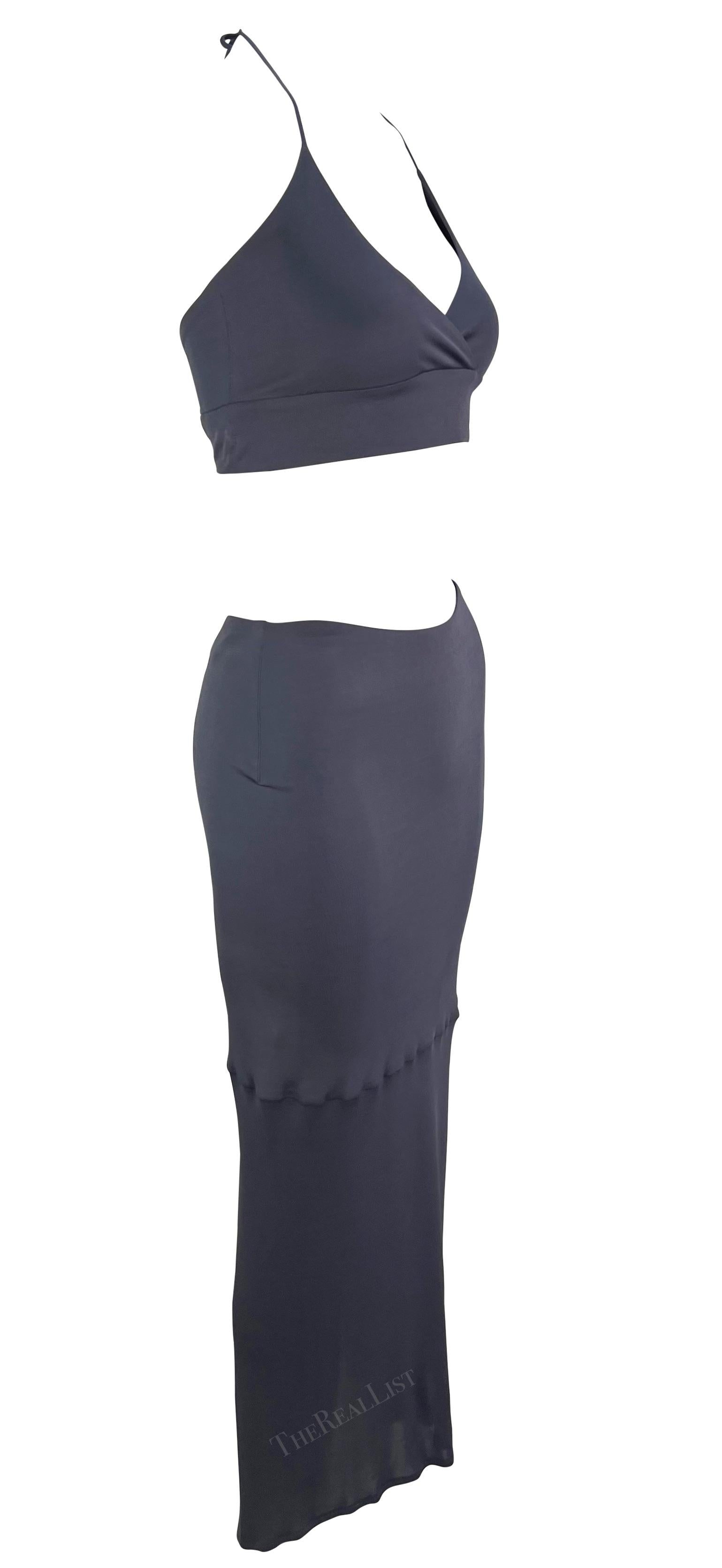 Presenting a slate blue Yigal Azrouël crop top skirt set. From the late 1990s, this two-piece set consists of a cropped halter neck and maxi skirt. The halterneck top features a v-neckline, a spaghetti necktie, and an exposed back. The matching ankle-length skirt is made complete with a slit at the back. Whether worn together or separately, this sexy two-piece set is the perfect addition to any modern wardrobe.