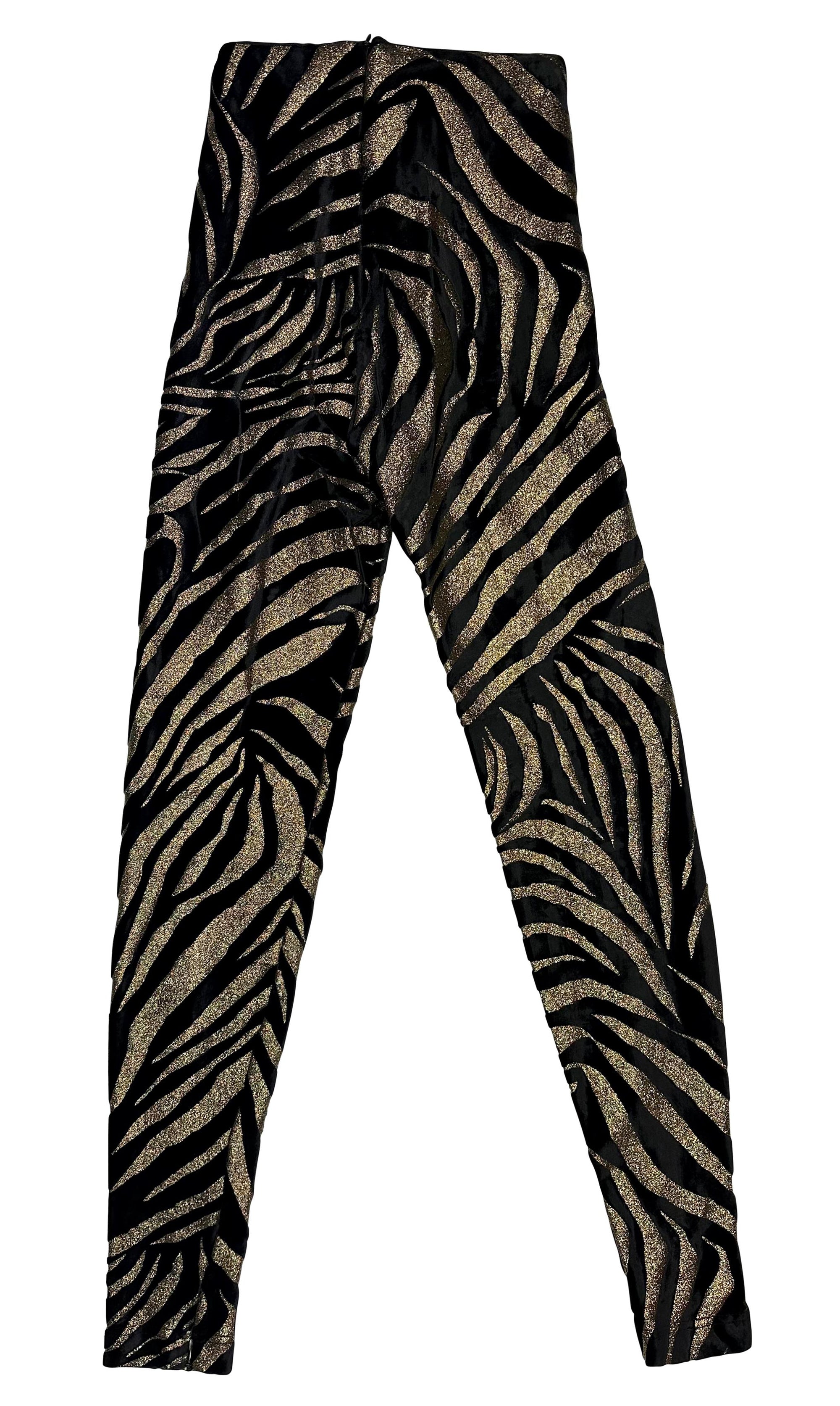 These striking Gianni Versace leggings from 1992 feature a bold black velvet fabric with an eye-catching gold glitter animal pattern. The stretch fit and high-waisted silhouette embody the opulent and daring style that defined Versace in the early '90s.